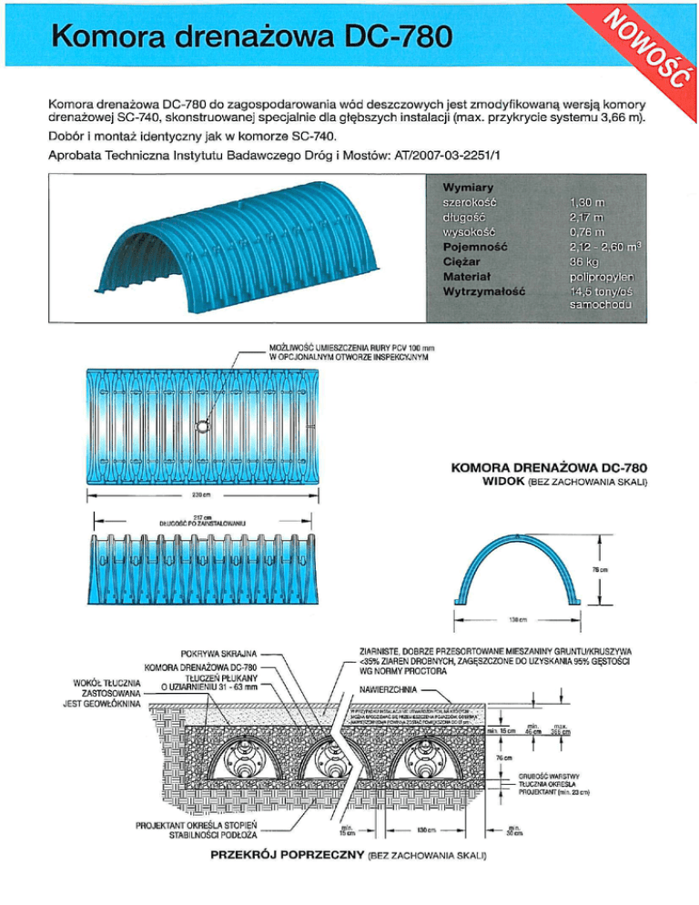 Komora drenażowa DC-780 Komora drenażowa DC-780 do zagospodarowania wód deszczowych jest zmodyfikowaną wersją komory drenażowej SC-740, skonstruowanej specjalnie dla głębszych instalacji (max. przykrycie systemu 3,66 m). Dobór i montaż identyczny jak w komorze SC-740. Aprobata Techniczna Instytutu Badawczego Dróg i Mostów: AT/2007-03-2251/1 1,30 m 2,17 m 0,76 m 2,12 - 2,60 m 36 kg polipropylen 14,5 tony/oś samochodu 3 MOŻLIWOŚĆ UMIESZCZENIA RURY PCV 100 mm KOMORA DRENAŻOWA DC-780 WIDOK (BEZ ZACHOWANIA SKALI) •na cm POKRYWA SKRAJNA K O M O R A DRENAŻOWA DC-780 TŁUCZEŃ PŁUKANY WOKÓŁ TŁUCZNIA 0 UZIARNIENIU 31 - 6 3 mm ZASTOSOWANA ZIARNISTE, D O B R Z E P R Z E S O R T O W A N E MIESZANINY G R U N T U / K R U S Z Y W A <35% ZIAREN D R O B N Y C H , ZAGĘSZCZONE DO UZYSKANIA 9 5 % GĘSTOŚCI WG N O R M Y P R O C T O R A J E S T GEOWtÓKNINA GRUBOŚĆ WARSTWY TŁUCZNIA OKREŚLA PROJEKTANT [min. 23 cm) P R O J E K T A N T OKREŚLA STOPIEŃ STABILNOŚCI PODŁOŻA PRZEKRÓJ P O P R Z E C Z N Y (BEZ ZACHOWANIA SKALI) Komora drenażowa DC-780 1. Wymagana ilość komór [C] w szt. C = Vs / pojemność wybranej komory (tab. 1) tab.1 Pojemność magazynowania wody przez samą komorę Objętość przypadająca na pojedynczą komorę przy fundamencie kamiennym o grubości DC-780 3 m 2,6 3 m 2,3 3 m 1,3 46 cm 30 c m 23 cm 3 m 2,2 2. Wymagana powierzchnia łożyska (wykopu) z komorami [S] w m 2 2 S = C x 3,14 m + 0,3 m x obwód łożyska DC-780 3. Wymagana ilość obsypki z tłucznia [Vst] w m 3 W celu przeliczenia całkowitej masy tłucznia (31-63 mm) stosujemy przelicznik z (tab. 2) Vst = C x przelicznik (tab. 2) tab. 2 Ilość tłucznia przypadająca na pojedynczą komorę przy fundamencie kamiennym o grubości 23 cm DC-780 t 3,8 46 cm 30 cm 3 m 2,3 4. Wymagana objętość wykopu [Ex] w m g t 4,2 2,5 5,0 3,0 3 Ex = C x przelicznik (tab. 3) tab. 3 Objętość prac ziemnych przypadająca na pojedynczą komorę przy fundamencie kamiennym o grubości 23 cm DC-780 46 cm 30 cm 3 3 m 5,2 3 m 4,5 m 4,7 5. Wymagana ilość materiału filtracyjnego [F] w m 2 Dno i boki łożyska oraz warstwa wierzchnia z tłucznia musi zostać pokryta geowłókniną. Pole powierzchni ścian bocznych musi być kalkulowane z dodaniem 30 cm zakładu w przypadku umieszczania 2 rolek tkaniny filtracyjnej bok do boku lub skraj do skraju. 6. Ilość sztuk ścian przednich/tylnych (pokryw) [Ep] Ep = 2 x (ilość ciągów komór) Bezpłatne konsultacje B szkolenia techniczne §i^\A ROK ZAŁOŻENIA 1988 SD Z O O " " EKOBUDEXsp. z o o . ul. Kościerska 7, 80-328 Gdańsk tel./fax: +48 58 554-85-65/66, 552-36-58 tel. kom.: 501 563 800 [email protected] www.komory-drenazowe.pl