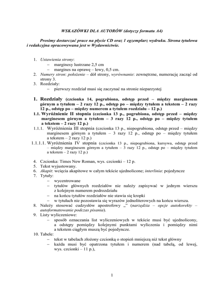 WSKAZÓWKI DLA AUTORÓW (dotyczy formatu A4) Prosimy dostarczać prace na płycie CD oraz 1 egzemplarz wydruku. Strona tytułowa i redakcyjna opracowywana jest w Wydawnictwie. 1. Ustawienia strony: − marginesy lustrzane 2,5 cm − margines na oprawę – lewy, 0,5 cm. 2. Numery stron: połoŜenie – dół strony, wyrównanie: zewnętrzne, numerację zacząć od strony 3. 3. Rozdziały: − pierwszy rozdział musi się zaczynać na stronie nieparzystej 1. Rozdziały (czcionka 14, pogrubiona, odstęp przed – między marginesem górnym a tytułem – 2 razy 12 p., odstęp po – między tytułem a tekstem – 2 razy 12 p., odstęp po – między numerem a tytułem rozdziału – 12 p.) 1.1. WyróŜnienie II stopnia (czcionka 13 p., pogrubiona, odstęp przed – między marginesem górnym a tytułem – 3 razy 12 p., odstęp po – między tytułem a tekstem – 2 razy 12 p.) 1.1.1. WyróŜnienia III stopnia (czcionka 13 p., niepogrubiona, odstęp przed – między marginesem górnym a tytułem – 3 razy 12 p., odstęp po – między tytułem a tekstem – 2 razy 12 p.) 1.1.1.1. WyróŜnienia IV stopnia (czcionka 13 p., niepogrubiona, kursywa, odstęp przed – między marginesem górnym a tytułem – 3 razy 12 p., odstęp po – między tytułem a tekstem – 2 razy 12 p.) 4. 5. 6. 7. Czcionka: Times New Roman, wys. czcionki – 12 p. Tekst wyjustowany. Akapit: wcięcia akapitowe w całym tekście ujednolicone; interlinia: pojedyncze Tytuły: − wycentrowane − tytułów głównych rozdziałów nie naleŜy zapisywać w jednym wierszu z kolejnym numerem podrozdziału − na końcu tytułów rozdziałów nie stawia się kropki − w tytułach nie pozostawia się wyrazów jednoliterowych na końcu wiersza. 8. NaleŜy stosować cudzysłów apostrofowy „” (narzędzia – opcje autokorekty – autoformatowanie podczas pisania). 9. Listy wyliczeniowe: − sposób oznaczania list wyliczeniowych w tekście musi być ujednolicony, a odstępy pomiędzy kolejnymi punktami wyliczenia i pomiędzy nimi a tekstem ciągłym muszą być pojedyncze. 10. Tabele: − tekst w tabelach złoŜony czcionką o stopień mniejszą niŜ tekst główny − kaŜda musi być opatrzona tytułem i numerem (nad tabelą, od lewej, wys. czcionki – 11 p.), 1 − tabele, które nie mieszczą się na jednej stronie, powinny być przeniesione na stronę następną; naleŜy pamiętać, by powtórzyć główkę tabeli, ale zamiast nazw w poszczególnych kolumnach umieszczamy liczby porządkowe. 11. Rysunki: − podpisy pod nimi muszą być opatrzone numerem, a numeracja musi być ciągła i jednolita w całym tekście − objaśnienia do oznaczeń na rysunku naleŜy zapisywać za pomocą półpauzy (1 – kadłub): wstaw – symbol – znaki specjalne – półpauza − podpisy powinny być wycentrowane i składane czcionką o stopień mniejszą niŜ tekst główny − po kaŜdym podpisie pod rysunkiem, między podpisem a tekstem głównym, musi być zawsze taki sam odstęp − wielkość znormalizowana, ilustracje w formatach: jpg, tiff, wmf. 11. Przypisy: − naleŜy składać czcionką o wys. 10 p. − interlinia – pojedyncze − kolejno ponumerowane − naleŜy zawsze podawać dokładny adres źródła (włącznie z numerem strony), z którego pochodzi uŜyty w pracy cytat lub przywołana myśl, pogląd itp. (zapis zaczynamy od inicjału imienia autora, a nie od nazwiska jak w przypadku bibliografii końcowej). 12. Zapis bibliograficzny naleŜy ujednolicić, np.: Podracki J., Słownik interpunkcyjny języka polskiego z zasadami przestankowania, Wydawnictwo Naukowe PWN, Warszawa 1999. Doerffer J.W., Budownictwo okrętowe w latach od 1968 do 1988 i pespektywy na przyszłość, „Budownictwo Okrętowe”, 1989, nr 12. Zalewski B., Zimna wojna i jej wpływ na koncepcje militarne Układu Warszawskiego i NATO, [w:] Konflikt zbrojny na Bałtyku w koncepcjach ideologii zimnowojennej po 1945 roku, red. nauk. A. Drzewiecki, Wyd. AMW, Gdynia 2005. 13. Wzory: − wstaw – obiekt – utwórz nowy – Microsoft Equation 3.0 − jeŜeli we wzorach symbole i liczby są zapisane pismem pochyłym, to w tekście muszą być one zapisane w ten sam sposób − numeracja wzorów ciągła; numery wzorów w nawiasach okrągłych − wzory wycentrowane. 14. Spis treści: − powinien bezpośrednio poprzedzać tekst główny i zaczynać się od strony 3. WYKAZ NORM PN-82/N-01152/01 Opis bibliograficzny: ksiąŜki PN-78/N-01222/00 Kompozycja wydawnicza ksiąŜki: postanowienia ogólne 2 PN-78/N-01222/01 Kompozycja wydawnicza ksiąŜki: karty tytułowe (ze zmianami A1) PN-78/N-01222/02 Kompozycja wydawnicza ksiąŜki: materiały wprowadzające PN-78/N-01222/03 Kompozycja wydawnicza ksiąŜki: tekst główny PN-78/N-01222/04 Kompozycja wydawnicza ksiąŜki: materiały uzupełniające tekst główny PN-78/N-01222/05 Kompozycja wydawnicza ksiąŜki: materiały informacyjno-pomocnicze PN-78/N-01222/06 Kompozycja wydawnicza ksiąŜki: indeksy PN-78/N-01222/07 Kompozycja wydawnicza ksiąŜki: bibliografia załącznikowa PN-78/N-01222/08 Kompozycja wydawnicza ksiąŜki: okładka i obwoluta PN-83/P-55366 Zasady składania tekstów w języku polskim BN-65/7440-05 Zasady składania wzorów matematycznych BN-65/7440-06 Zasady składania i formowania tabel 3