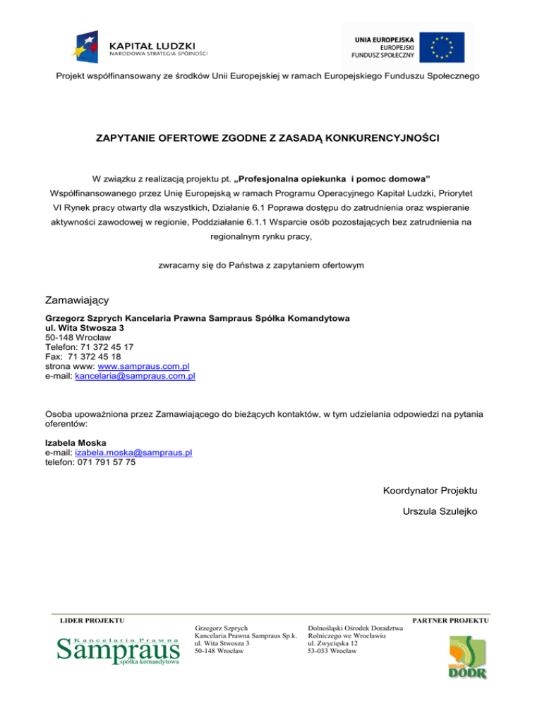 Projekt współfinansowany ze środków Unii Europejskiej w ramach Europejskiego Funduszu Społecznego ZAPYTANIE OFERTOWE ZGODNE Z ZASADĄ KONKURENCYJNOŚCI W związku z realizacją projektu pt. „Profesjonalna opiekunka i pomoc domowa” Współfinansowanego przez Unię Europejską w ramach Programu Operacyjnego Kapitał Ludzki, Priorytet VI Rynek pracy otwarty dla wszystkich, Działanie 6.1 Poprawa dostępu do zatrudnienia oraz wspieranie aktywności zawodowej w regionie, Poddziałanie 6.1.1 Wsparcie osób pozostających bez zatrudnienia na regionalnym rynku pracy, zwracamy się do Państwa z zapytaniem ofertowym Zamawiający Grzegorz Szprych Kancelaria Prawna Sampraus Spółka Komandytowa ul. Wita Stwosza 3 50-148 Wrocław Telefon: 71 372 45 17 Fax: 71 372 45 18 strona www: www.sampraus.com.pl e-mail: [email protected] Osoba upowaŜniona przez Zamawiającego do bieŜących kontaktów, w tym udzielania odpowiedzi na pytania oferentów: Izabela Moska e-mail: [email protected] telefon: 071 791 57 75 Koordynator Projektu Urszula Szulejko LIDER PROJEKTU PARTNER PROJEKTU Grzegorz Szprych Kancelaria Prawna Sampraus Sp.k. ul. Wita Stwosza 3 50-148 Wrocław Dolnośląski Ośrodek Doradztwa Rolniczego we Wrocławiu ul. Zwycięska 12 53-033 Wrocław Projekt współfinansowany ze środków Unii Europejskiej w ramach Europejskiego Funduszu Społecznego Przedmiot zamówienia Przedmiotem zamówienia są usługi dotyczące: • wynajmu sali szkoleniowej w celu przeprowadzenia szkoleń dla 20 osób • zapewnienia noclegów dla uczestników szkoleń • zapewnienia cateringu dla uczestników szkoleń Opis zamówienia 1. Terminy i miejsce realizacji zamówienia Zamówienie będzie realizowane w miesiącach styczeń-sierpień 2010 r. W tym okresie zostanie przeprowadzonych: • 16 zjazdów 3-dniowych (piątek, sobota, niedziela) • 16 zjazdów 2-dniowych (sobota, niedziela) Miejsce realizacji szkoleń: województwo dolnośląskie 2. Zakres usług Usługi w ramach szkoleń realizowanych przez 3 dni powinny obejmować: • wynajem sali szkoleniowej przez 3 dni,: • 2 noclegi, 2 śniadania, 3 obiady, 2 kolacje dla kaŜdej osoby uczestniczącej w szkoleniu Usługi w ramach szkoleń realizowanych przez 2 dni powinny obejmować: 3. 4. • wynajem sali szkoleniowej przez 2 dni, oraz dla kaŜdej osoby: • 1 nocleg, 1 śniadanie, 2 obiady, 1 kolacja dla kaŜdej osoby uczestniczącej w szkoleniu, Parametry sali szkoleniowej • sala szkoleniowa wyposaŜona w krzesła i stoły dla minimum 25 osób • dostęp do Internetu dla prowadzącego szkolenie Parametry pokoi Pokoje dwuosobowe z dwoma osobnymi łóŜkami. Liczba pokoi powinna zapewnić nocleg przynajmniej dla 21 osób. W przypadku nieparzystej liczby uczestników oferta powinna uwzględniać moŜliwość noclegu dla 1 osoby w osobnym pokoju w takiej samej cenie jak dla pozostałych osób nocujących w pokojach dwuosobowych. 5. Oferty cząstkowe MoŜna składać oferty na zapewnienie noclegów, sali i wyŜywienia dla minimum 12 szkoleń. LIDER PROJEKTU PARTNER PROJEKTU Grzegorz Szprych Kancelaria Prawna Sampraus Sp.k. ul. Wita Stwosza 3 50-148 Wrocław Dolnośląski Ośrodek Doradztwa Rolniczego we Wrocławiu ul. Zwycięska 12 53-033 Wrocław Projekt współfinansowany ze środków Unii Europejskiej w ramach Europejskiego Funduszu Społecznego Oferta musi obejmować wszystkie rodzaje usług: noclegowe, gastronomiczne oraz wynajem sali szkoleniowej. Zakres oferty Oferta powinna zawierać informację o cenie brutto usług w podziale na: • cenę za wynajęcie sali przez 1 dzień • cenę za kolację dla 1 osoby • cenę za obiad dla 1 osoby • cenę za śniadanie dla 1 osoby • cenę za nocleg dla 1 osoby w pokoju dwuosobowym Dodatkowo oferta powinna zawierać: • propozycję konkretnych dat realizacji szkoleń zgodnie z podanymi warunkami brzegowymi • opis parametrów technicznych pokoi i sali szkoleniowej i/lub zdjęcie pokoju i sali szkoleniowej, • przykładowe menu dla kolacji, obiadu i śniadania Kryteria wyboru oferty Zamawiający dokona wyboru Wykonawcy, który zaproponuje najniŜszą cenę i którego oferta spełnia wymagania określone w zapytaniu ofertowym. Sposób, forma i termin składania ofert Oferta powinna określać Wykonawcę oraz wskazywać osobę do kontaktu. Oferty moŜna składać: • w formie elektronicznej (format pliku DOC lub PDF) na adres e-mail: [email protected] • lub w formie papierowej pocztą na adres zamawiającego lub faksem na numer faksu: +48 71 372 45 18 Oferty naleŜy składać najpóźniej do 30 listopada 2009 r. do godziny 16.00 Zasady współpracy • wszystkie usługi będą realizowane na podstawie umowy. • brak moŜliwości przedpłaty. • płatność w formie przelewu na podstawie faktury VAT wystawianej za kaŜdy weekend szkoleniowy. Płatność w terminie do 30 dni od dnia wystawienia faktury VAT. • moŜliwość zmiany (zwiększenia, zmniejszenia) zamówienia na 3 dni przed realizacją usługi. Informacje dodatkowe • zamawiający zastrzega sobie prawo odstąpienia od podpisania umowy bez podania przyczyn LIDER PROJEKTU PARTNER PROJEKTU Grzegorz Szprych Kancelaria Prawna Sampraus Sp.k. ul. Wita Stwosza 3 50-148 Wrocław Dolnośląski Ośrodek Doradztwa Rolniczego we Wrocławiu ul. Zwycięska 12 53-033 Wrocław Projekt współfinansowany ze środków Unii Europejskiej w ramach Europejskiego Funduszu Społecznego • przysłanie oferty jest jednoznaczne z akceptującą zasad współpracy po wyborze oferty • zamawiający zastrzega sobie prawo wyboru części z zaproponowanych terminów szkoleń LIDER PROJEKTU PARTNER PROJEKTU Grzegorz Szprych Kancelaria Prawna Sampraus Sp.k. ul. Wita Stwosza 3 50-148 Wrocław Dolnośląski Ośrodek Doradztwa Rolniczego we Wrocławiu ul. Zwycięska 12 53-033 Wrocław