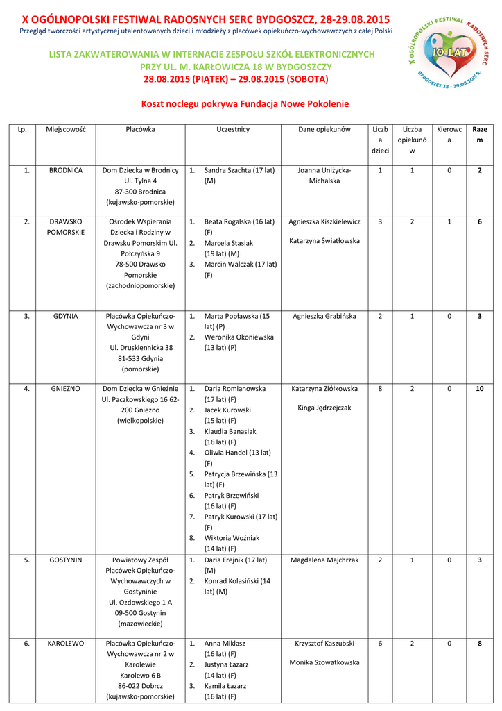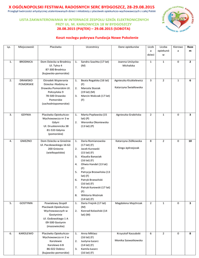 X OGÓLNOPOLSKI FESTIWAL RADOSNYCH SERC BYDGOSZCZ, 28-29.08.2015 Przegląd twórczości artystycznej utalentowanych dzieci i młodzieży z placówek opiekuńczo-wychowawczych z całej Polski LISTA ZAKWATEROWANIA W INTERNACIE ZESPOŁU SZKÓŁ ELEKTRONICZNYCH PRZY UL. M. KARŁOWICZA 18 W BYDGOSZCZY 28.08.2015 (PIĄTEK) – 29.08.2015 (SOBOTA) Koszt noclegu pokrywa Fundacja Nowe Pokolenie Lp. Miejscowość Placówka 1. BRODNICA Dom Dziecka w Brodnicy Ul. Tylna 4 87-300 Brodnica (kujawsko-pomorskie) 1. 2. DRAWSKO POMORSKIE Ośrodek Wspierania Dziecka i Rodziny w Drawsku Pomorskim Ul. Połczyńska 9 78-500 Drawsko Pomorskie (zachodniopomorskie) 1. Placówka OpiekuńczoWychowawcza nr 3 w Gdyni Ul. Druskiennicka 38 81-533 Gdynia (pomorskie) 1. Dom Dziecka w Gnieźnie Ul. Paczkowskiego 16 62200 Gniezno (wielkopolskie) 1. 3. 4. GDYNIA GNIEZNO Uczestnicy 2. 3. 2. 2. 3. 4. 5. 6. 7. 8. 5. 6. GOSTYNIN KAROLEWO Powiatowy Zespół Placówek OpiekuńczoWychowawczych w Gostyninie Ul. Ozdowskiego 1 A 09-500 Gostynin (mazowieckie) 1. Placówka OpiekuńczoWychowawcza nr 2 w Karolewie Karolewo 6 B 86-022 Dobrcz (kujawsko-pomorskie) 1. 2. 2. 3. Dane opiekunów Liczb a dzieci Liczba opiekunó w Kierowc a Raze m Sandra Szachta (17 lat) (M) Joanna UniżyckaMichalska 1 1 0 2 Beata Rogalska (16 lat) (F) Marcela Stasiak (19 lat) (M) Marcin Walczak (17 lat) (F) Agnieszka Kiszkielewicz 3 2 1 6 Marta Popławska (15 lat) (P) Weronika Okoniewska (13 lat) (P) Agnieszka Grabińska 2 1 0 3 Daria Romianowska (17 lat) (F) Jacek Kurowski (15 lat) (F) Klaudia Banasiak (16 lat) (F) Oliwia Handel (13 lat) (F) Patrycja Brzewińska (13 lat) (F) Patryk Brzewiński (16 lat) (F) Patryk Kurowski (17 lat) (F) Wiktoria Woźniak (14 lat) (F) Daria Frejnik (17 lat) (M) Konrad Kolasiński (14 lat) (M) Katarzyna Ziółkowska 8 2 0 10 Magdalena Majchrzak 2 1 0 3 Krzysztof Kaszubski 6 2 0 8 Anna Miklasz (16 lat) (F) Justyna Łazarz (14 lat) (F) Kamila Łazarz (16 lat) (F) Katarzyna Światłowska Kinga Jędrzejczak Monika Szowatkowska 4. 5. 6. 7. 8. 9. KOŁACZKOWO KOTLA KUTNO Ośrodek Wspomagania Dziecka i Rodziny w Kołaczkowie Ul. Plac Reymonta 5 62-306 Kołaczkowo (wielkopolskie) tel. 61 438 53 47 1. Dom Dziecka w Kotli Ul. Głogowska 48 67-240 Kotla (dolnośląskie) 1. Placówka OpiekuńczoWychowawcza „Tęcza” w Kutnie Ul. Karłowicza 1 99-300 Kutno (łódzkie) 1. 2. 2. 2. 3. 4. 5. 6. 10. ŁÓDŹ 11. ŁÓDŹ 12. MILEJÓW Dom Dziecka nr 1 im. J. Krasickiego w Łodzi Ul. Aleksandrowska 123 91-224 Łódź (łódzkie) 1. 2. 3. 4. Dom Dziecka nr 13 w Łodzi 1. Ul. Wygodna 20 94-024 Łódź (łódzkie) Świetlica OpiekuńczoWychowawcza „Motylek” w Milejowie Ul. Kościuszki 45 97-340 Rozprza (łódzkie) (przy Ośrodku Pomocy Społecznej w Rozprzy) 1. 2. 3. 4. 5. 6. 7. 13. NIECHCICE Świetlica OpiekuńczoWychowawcza „Biedronka” w Niechcicach Ul. Poprzeczna 97-340 Rozprza (łódzkie) (przy Ośrodku Pomocy Społecznej w Rozprzy) 1. 2. 3. 4. Krystian Wiśniewski (17 lat) (F) Dawid Miklasz (13 lat) (M) Wojciech Warszawski (16 lat) (M) Paweł Pućka (18 lat) (F) Sylwia Szcześniak (15 lat) (F) Aura Wysocka (14 lat) (P) Joanna Podkowa (14 lat) (P) Anna Matysiak (13 lat) (F,T) Jakub Szybkowski (10 lat) (T) Krystian Komorowski (10 lat) (MFS) Marika Kukuła (17 lat) (F,T) Natalia Szybkowska (13 lat) (T) Przemysław Stańczyk (12 lat) (T) Daria Waloch (14 lat) (F, P) Natalia Szymczak (13 lat) (P) Oliwia Deć (8 lat) (P) Wiktoria Waloch (11 lat) (P) Dominika Szczygielska (19 lat) (M) Dagmara Kulbat (9 lat) (P) Dominika Grela (9 lat) (P) Kamil Kulbat (11 lat) (P) Oliwia Manikowska (9 lat) (P) Oliwia Orzechowska (9 lat) (P) Patryk Kocimowski (13 lat) (P) Paweł Hamczyk (7 lat) (P) Daria Banaszczyk (15 lat) (F, P) Emilia Gorgoń (13 lat) (F,P) Igor Kudrzycki (11 lat) (P) Jakub Kwiecień (7 lat) (F,P) Katarzyna Wojciechowska 2 1 1 4 Anita Dawid 2 2 0 4 6 2 1 9 Katarzyna Loch 4 1 0 5 Krzysztof Korczak 1 1 0 2 Małgorzata Kowalczyk 7 1 1 9 Anna Kwiecień 6 1 1 8 Renata Rybak Beata Nodzak Agnieszka Czajkowska 5. 6. 14. OLECKO Centrum Administracyjne Obsługi Placówek Opiekuńczowychowawczych w Olecku Ul. Gołdapska 18 A 19-400 Olecko (warmińsko-mazurskie) 1. Monika Zajczyk 7 1 1 9 Małgorzata Łobanowska 5 1 1 7 Dawid Sławek (9 lat) (P) Ewa Grzelak (12 lat) (P) Sylwia Grzelak (14 lat) (P) Wioleta Grzelak (16 lat) (P) Anna Marczewska 4 2 0 6 Agata Utracka (16 lat) (MFS, M) 2. Karolina Gajda (13 lat) (MFS)] 3. Nikola Przepiórkowska (14 lat) (MFS) 4. Karolina Prosnak (13 lat) (MFS, M) 1. Alicja Goś (16 lat) (T) 2. Ania Goś (9 lat) (P) 3. Damian Pawłoski (12 lat) (MFS,P) 4. Ewa Goś (11 lat) (P) 5. Kamila Błoniewska (14 lat) (MFS,P,T) 6. Klaudia Ciarka (15 lat) (MFS,P) 7. Marzena Goś (13 lat) (MFS,T) 8. Mateusz Jaworski (11 lat) (P) 9. Mikołaj Dynerowicz (13 lat) (MFS) 10. Natalia Bednarczyk (15 lat) (P,T) Elżbieta Stańczak 4 2 0 6 16 3 1 20 2. 3. 4. 5. 6. 7. 15. 16. 17. 18. OLSZTYN OSTROWIEC ŚWIĘTOKRZYSKI PABIANICE PIASTÓW Centrum Placówek OpiekuńczoWychowawczych w Olsztynie Ul. Korczaka 6 10-086 Olsztyn (warmińsko- mazurskie) tel. 89 527 55 91 e-mail: [email protected] 1. Niepubliczna Placówka OpiekuńczoWychowawcza „Nasz Dom” Zgromadzenia Sióstr Franciszkanek Rodziny Maryi Ul. Szkolna 19 27-400 Ostrowiec Świętokrzyski (świętokrzyskie) 1. 2. 3. Placówka OpiekuńczoWychowawcza nr 5 w Pabianicach Ul. Sejmowa 2 95-200 Pabianice (łódzkie) 1. Świetlica ŚrodowiskowoIntegracyjna „Dom Jana Pawła II” Piastów Ul. 11-go Listopada 8 05-820 Piastów (mazowieckie) Julianna Pawlak (11 lat) (P) Krzysztof Banaszczyk (9 lat) (P) 2. 3. 4. 5. 4. Anna Jachimczuk (15 lat) (MFS) Ireneusz Łuczyński (16 lat) (MFS) Mateusz Marchlewicz (17 lat) (MFS) Remigiusz Kozicki (MFS) Natalia Jachimczuk (13 lat) (MFS) Roksana Piwek (12 lat) (MFS) Wiktoria Błażuk (14 lat) (MFS) Agata Ponichtera (11 lat) (MFS) Ewelina Łojewska (17 lat) (MFS, M) Julia Przybyła (10 lat) (MFS) Kinga Ponichtera (12 lat) (MFS) Magdalena Ponichtera (15 lat) (MFS,M) Kinga W