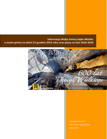 Informacja Wójta Gminy Dębe Wielkie o stanie gminy na dzień 31 grudnia 2015 roku oraz plany na lata 2016-2018 Krzysztof Kalinowski Wójt Gminy Dębe Wielkie 2016-02-01 Szanowni Mieszkańcy i Przedsiębiorcy, Kontynuując rozpoczęty w ubiegłym roku zwyczaj składam Państwu sprawozdanie ze stanu gminy Dębe Wielkie na koniec 2015 roku. Niniejsze opracowanie daje obraz zmian demograficznych i rozwoju naszej małej ojczyzny. W nawiasach przedstawiono wzrost (+…) lub spadek (-…) wielu wskaźników statystycznych. W drugiej części przedstawione są też zaktualizowane plany inwestycyjne i inne na następne lata. Stan Gminy Dębe Wielkie na dzień 31 grudnia 2015 roku 1. Mieszkańcy Na terenie gminy Dębe Wielkie zameldowanych jest na stałe 9579 mieszkańców (+125) oraz dodatkowo 139 osób na pobyt czasowy. W systemie gospodarowania odpadami komunalnymi zarejestrowanych jest 9365 (+113) osób. Do Stałego Rejestru Wyborców wpisanych jest 7469 mieszkańców. Od początku programu 156 rodzin (+57) złożyło wniosek o wydanie Karty Dużej Rodziny. W 2015 roku wydano karty dla 344 osób. W sumie od początku programu karty posiada 783 osoby. Liczba mieszkańców (zameldowanych) w poszczególnych miejscowościach przedstawia się następująco: Przyrost Ludność 2015 2015/2016 Aleksandrówka 577 6 Bykowizna 190 -1 Celinów 202 1 Cięciwa 45 0 Cezarów 5 0 Choszczak 6 -1 Choszczówka Dębska 102 -1 Choszczówka Rudzka 131 1 Choszczówka Stojecka 309 1 Chrośla 960 9 Cyganka 511 11 Dębe Wielkie 3294 71 Górki 514 11 Gorzanka 92 0 Jędrzejnik 98 -3 Kąty Goździejewskie I 240 1 Kąty Gożdziejewskie II 167 3 Kobierne 321 4 Olesin 505 4 Ostrów-Kania 201 4 Poręby 92 -2 Ruda 714 10 Rysie 128 -1 Teresław 48 -2 Walercin 127 -1 str. 1 2. Finanse Ze względu na trwające rozliczenie budżetu 2015 roku wyniki podane poniżej nie są ostatecznymi. Planowane wykonanie kasowe budżetu 2015 przedstawia się następująco: Dochody 30,05 mln zł, w tym: subwencja oświatowa 7,3 mln zł, część wyrównawcza subwencji ogólnej 1,9 mln zł, udział w podatku dochodowym budżetu państwa 6,4 mln zł, podatki i opłaty lokalne 4,2 mln zł, dotacje ze środków Unii Europejskiej 5 mln zł, dotacja z budżetu państwa na pomoc społeczną 2,8 mln zł. Wydatki 32,5 mln zł, w tym: Infrastruktura wodno-kanalizacyjna 7,7 mln zł, drogi publiczne 2,1 mln zł, Administracja - Urząd Gminy 3 mln zł, oświata i wychowanie 11,4 mln zł, pomoc społeczna 3,97 mln zł, gospodarka komunalna i ochrona środowiska 1,8 mln zł, kultura 0,2 mln zł, kultura fizyczna i sport 0,4 mln zł. Przewidywany jeszcze pod koniec 2015 roku deficyt budżetu na kwotę 3,1 mln zł, według danych na 31.01.2016 r. będzie znacznie niższy i wyniesie 2,5 mln zł. str. 2 Zaciągnięta skumulowana kwota długu na koniec roku to 15,3 mln zł Procentowy wskaźnik zadłużenia do dochodów wykonanych – 50,87 %. Czy to dużo? Przypomnieć należy, że na koniec 2010 roku, kiedy obejmowałem zarządzanie gminą wskaźnik zadłużenia wynosił ponad 46%. Od tego czasu zadłużenie gminy wzrosło o 6,8 mln zł ale wartość wykonanych w tym okresie czasu inwestycji wyniosła aż 32,9 mln zł. Zauważyć też należy, że znacząca część zadłużenia pochodzi z preferencyjnych pożyczek z Wojewódzkiego Funduszu Ochrony Środowiska i Gospodarki Wodnej, które są w części umarzalne. Pieniądze z zadłużenia nie zostały więc „przejedzone” lecz zainwestowane w infrastrukturę wodociągową, kanalizacyjną i drogową, sportową czy rekreacyjną, co zostanie dalej pokazane. W najbliższych latach planowana jest stabilizacja zadłużenia. Paradoksalnie nowe przepisy ustawy o finansach publicznych nie pozwalają na szybszą spłatę zadłużenia, nawet jeśli kosztem braku inwestycji gmina chciałaby to zrobić. Reasumując finanse gminy są stabilne a z inwestycji możemy korzystać już dziś. Skumulowane zadłużenie gminy Dębe Wielkie na tle sksumulowanej wartości inwestycji 40 mln zł 30 mln zł 20 mln zł 10 mln zł 0 mln zł - 10 mln zł 2011 2012 2013 2014 2015 Skumulowana wartość inwestycji od roku 2010 Skumulowany wzrost zadłużenia od roku 2010 str. 3 3. Gospodarka wodno – ściekowa Gmina Dębe Wielkie posiada łącznie 106,99 km (+44,69 km) wybudowanej sieci wodociągowej w miejscowościach: Dębe Wielkie, Chrośla, Cyganka, Górki, Ruda, Bykowizna, Kobierne, Choszczówka Dębska, Choszczówka Rudzka, Choszczówka Stojecka, Aleksandrówka, Olesin (częściowo), Ostrów Kania (częściowo), Rysie (częściowo). Aktualnie w budowie jest około 7 km sieci wodociągowej w miejscowościach: Aleksandrówka, Choszczówka Rudzka, Choszczówka Stojecka, Chrośla, Dębe Wielkie, Kobierne. Sieć wodociągowa jest zasilana z dwóch Stacji Uzdatniania Wody zlokalizowanych w Dębem Wielkim o wydajnościach 25m3/h i 116m3/h. Gmina posiada również ujęcie wody w Chrośli, bez Stacji Uzdatniania Wody. Ilość przyłączy wodociągowych do budynków/gospodarstw: 1965 szt. (+384 szt.) W odniesieniu do budynków mieszkalnych gmina zwodociągowana jest w 68,2%. (+14,8%) Sieć kanalizacji sanitarnej wybudowana w Dębem Wielkim ma długość 24,82km. (+7,52 km) Ilość przyłączy kanalizacyjnych prowadzących do budynków/gospodarstw: 642 szt. (+109 szt.) Procent skanalizowania gminy w odniesieniu do budynków mieszkalnych: 22,3% (+4,4%). Ścieki komunalne są oczyszczane w oczyszczalni ścieków zlokalizowanej w Dębem Wielkim o przepustowości 650m3/dobę. Aktualnie w części miejscowości Dębe Wielkie i Aleksandrówka w budowie jest około 8km sieci kanalizacyjnej. Gmina posiada jeszcze pozwolenie na budowę kolejnych 10 km sieci kanalizacji sanitarnej w miejscowościach Dębe Wielkie (część północna), Aleksandrówka oraz Olesin (część południowa). str. 4 4. Drogi Gmina zarządza ponad 85 km dróg publicznych (nie włączając dróg gminnych wewnętrznych). Drogi asfaltowe mają długość 26 km, z czego w stanie dobrym