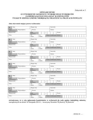Załącznik nr 2 OŚWIADCZENIE O UTWORZENIU KOMITETU WYBORCZEGO WYBORCÓW ZAMIERZAJĄCEGO ZGŁASZAĆ KANDYDATÓW TYLKO W JEDNEJ GMINIE NIEBĘDĄCEJ MIASTEM NA PRAWACH POWIATU Jako obywatele mający prawo wybierania: 1. Imię Adres zamieszkania: Miejscowość Drugie imię Województwo 2. Imię Adres zamieszkania: Miejscowość Województwo Imię Adres zamieszkania: Miejscowość Województwo Województwo Imię Adres zamieszkania: Miejscowość Ulica Nr lokalu Numer ewidencyjny PESEL* Nazwisko Gmina Nr lokalu Numer ewidencyjny PESEL* Nazwisko Gmina Nr lokalu Numer ewidencyjny PESEL* Nazwisko Gmina Poczta Nr lokalu Numer ewidencyjny PESEL* Nazwisko Powiat Kod pocztowy Nr domu Poczta - Drugie imię Województwo Poczta - Powiat Kod pocztowy Nr domu Poczta - Drugie imię Ulica ... Gmina Powiat Kod pocztowy Nr domu Imię Adres zamieszkania: Miejscowość Nazwisko Drugie imię Ulica 5. Numer ewidencyjny PESEL* Powiat Kod pocztowy Nr domu Ulica 4. Nr lokalu Drugie imię Województwo Poczta - Powiat Kod pocztowy Nr domu Imię Adres zamieszkania: Miejscowość Gmina Drugie imię Ulica 3. Powiat Kod pocztowy Nr domu Ulica Nazwisko Gmina Nr lokalu Poczta Numer ewidencyjny PESEL* oświadczamy, że w celu zgłaszania kandydatów w wyborach do rady gminy (miejskiej, miasta), zarządzonych na dzień 16 listopada 2014 r., tworzymy Komitet Wyborczy Wyborców strona nr ..... Nazwa komitetu Uwaga! Nazwa komitetu wyborczego wyborców zawiera wyrazy „Komitet Wyborczy Wyborców” oraz nazwę komitetu wyborczego lub skrót jego nazwy odróżniające się wyraźnie od nazw i skrótów nazw innych komitetów wyborczych. Nazwa i skrót nazwy komitetu wyborczego wyborców muszą być różne od nazw lub skrótu nazw partii politycznych lub organizacji, wpisanych odpowiednio do ewidencji lub rejestru, prowadzonych przez właściwy organ. Skrót nazwy komitetu Uwaga! Podanie skrótu nazwy jest obowiązkowe. Skrót nazwy komitetu wyborczego może zawierać wyrazy „Komitet Wyborczy Wyborców” i skrót nazwy użytej w nazwie komitetu wyborczego lub litery „KWW” i nazwę lub skrót nazwy użytej w nazwie komitetu wyborczego. Skrót nazwy może składać się z nie więcej niż 45 znaków drukarskich wliczając spacje. Skrót nazwy komitetu wyborczego wyborców może być taki sam jak nazwa tego komitetu pod warunkiem, że nazwa komitetu składa się z nie więcej niż 45 znaków drukarskich, wliczając spacje. Adres siedziby komitetu wyborczego Województwo Powiat Ulica Nr domu Gmina Nr lokalu Miejscowość Poczta Kod pocztowy - Spośród osób wchodzących w skład komitetu wyborczego Na pełnomocnika wyborczego Komitetu Wyborczego Wyborców powołano Imię Drugie imię Nazwisko Numer ewidencyjny PESEL* Komitet Wyborczy zamierza zgłosić kandydatów do Rady …………………………………… (nazwa organu) Podpisy członków Komitetu Wyborczego Wyborców L.p. 1 Imię - imiona Nazwisko Podpis 2 3 4 1. 2. 3. 4. 5. ... ..............................................................., dnia ....................................................2014 r. (miejscowość) * W przypadku obywatela Unii Europejskiej niebędącego obywatelem polskim należy podać numer paszportu lub innego dokumentu stwierdzającego tożsamość strona nr .....