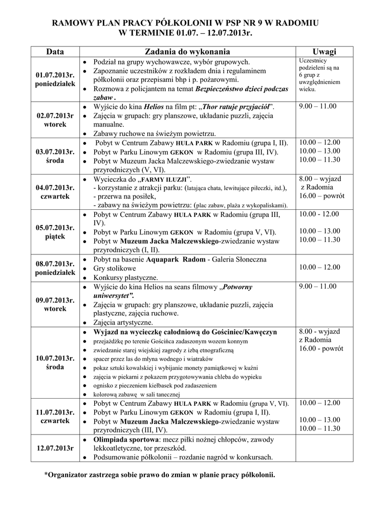 RAMOWY PLAN PRACY PÓŁKOLONII W PSP NR 9 W RADOMIU W TERMINIE 01.07. – 12.07.2013r. Data 01.07.2013r. poniedziałek 02.07.2013r wtorek 03.07.2013r. środa 04.07.2013r. czwartek 05.07.2013r. piątek 08.07.2013r. poniedziałek 09.07.2013r. wtorek 10.07.2013r. środa 11.07.2013r. czwartek 12.07.2013r Zadania do wykonania Podział na grupy wychowawcze, wybór grupowych. Zapoznanie uczestników z rozkładem dnia i regulaminem półkolonii oraz przepisami bhp i p. pożarowymi. Rozmowa z policjantem na temat Bezpieczeństwo dzieci podczas zabaw . Wyjście do kina Helios na film pt: „Thor ratuje przyjaciół”. Zajęcia w grupach: gry planszowe, układanie puzzli, zajęcia manualne. Zabawy ruchowe na świeżym powietrzu. Pobyt w Centrum Zabawy HULA PARK w Radomiu (grupa I, II). Pobyt w Parku Linowym GEKON w Radomiu (grupa III, IV). Pobyt w Muzeum Jacka Malczewskiego-zwiedzanie wystaw przyrodniczych (V, VI). Wycieczka do „FARMY ILUZJI”. - korzystanie z atrakcji parku: (latająca chata, lewitujące piłeczki, itd.), - przerwa na posiłek, - zabawy na świeżym powietrzu: (plac zabaw, plaża z wykopaliskami). Pobyt w Centrum Zabawy HULA PARK w Radomiu (grupa III, IV). Pobyt w Parku Linowym GEKON w Radomiu (grupa V, VI). Pobyt w Muzeum Jacka Malczewskiego-zwiedzanie wystaw przyrodniczych (I, II). Pobyt na basenie Aquapark Radom - Galeria Słoneczna Gry stolikowe Konkursy plastyczne. Wyjście do kina Helios na seans filmowy „Potworny uniwersytet”. Zajęcia w grupach: gry planszowe, układanie puzzli, zajęcia plastyczne, zajęcia ruchowe. Zajęcia artystyczne. Wyjazd na wycieczkę całodniową do Gościniec/Kawęczyn przejażdżkę po terenie Gościńca zadaszonym wozem konnym zwiedzanie starej wiejskiej zagrody z izbą etnograficzną spacer przez las do młyna wodnego i wiatraków pokaz sztuki kowalskiej i wybijanie monety pamiątkowej w kuźni zajęcia w piekarni z pokazem przygotowywania chleba do wypieku ognisko z pieczeniem kiełbasek pod zadaszeniem kolorową zabawę w sali tanecznej Pobyt w Centrum Zabawy HULA PARK w Radomiu (grupa V, VI). Pobyt w Parku Linowym GEKON w Radomiu (grupa I, II). Pobyt w Muzeum Jacka Malczewskiego-zwiedzanie wystaw przyrodniczych (III, IV). Olimpiada sportowa: mecz piłki nożnej chłopców, zawody lekkoatletyczne, tor przeszkód. Podsumowanie półkolonii – rozdanie nagród w konkursach. *Organizator zastrzega sobie prawo do zmian w planie pracy półkolonii. Uwagi Uczestnicy podzieleni są na 6 grup z uwzględnieniem wieku. 9.00 – 11.00 10.00 – 12.00 10.00 – 13.00 10.00 – 11.30 8.00 – wyjazd z Radomia 16.00 – powrót 10.00 - 12.00 10.00 – 13.00 10.00 – 11.30 10.00 – 12.00 9.00 – 11.00 8.00 - wyjazd z Radomia 16.00 - powrót 10.00 – 12.00 10.00 – 13.00 10.00 – 11.30