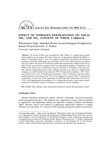 Acta Sci. Pol., Hortorum Cultus 7(2) 2008, 41-51 EFFECT OF NITROGEN FERTILIZATION ON YIELD, NH4+ AND NO3- CONTENT OF WHITE CABBAGE Włodzimierz Sady, Stanisław RoĪek, Iwona Domagała-ĝwiątkiewicz, Renata Wojciechowska, A. Kołton University Agriculture in Krakow Abstract. The results of three year investigations with ‘Galaxy’ F1 cabbage grown under field conditions are presented. The effect of the rate of ammonium sulphate and RSM (solution of ammonium nitrate + urea), the method of application (placement and broadcast technique) and foliar fertilization (urea and Supervit K) on the yield and nitrate accumulation was studied. The form of N fertilizer significantly increased the cabbage yield only in 2007. In this year the better nitrogen source was ammonium sulphate in comparison with RSM. In the other years no differences between the kind of N fertilizer were observed. The method of application did not affect cabbage yield any year. However, slightly better cropping was noted for following treatments 75% N broadcasted at planting + 25% N during growth season, 75% N broadcasted at planting + foliar fertilization, and after placement fertilization with reduced rate (75% N) as compared to control (100% N broadcasted at planting), in every year of the experiment. In 2006 and 2007 fertilization at the rate of 75% N and supplemented with addition 25% N during the growth or foliar sprays significantly increased nitrate content in cabbage as compared to control treatment. Key words: white cabbage, foliar, placement fertilization, nitrate and ammonium content INTRODUCTION Modern agriculture production requires efficient, sustainable, and environmentally sound management practices. The adequate rates, appropriate sources, efficient methods of application, and application timing are important strategies [Fageria and Baligar 2005]. Nitrogen sources and methods of application significantly influence N uptake efficiency in crop plants. In a system of field vegetable production nitrate based fertilizCorresponding author – Adres do korespondencji: Włodzimierz Sady, Iwona Domagała-ĝwiątkiewicz, Department of Soil Cultivation and Fertilization of Horticultural Plants, University Agriculture in Krakow, Al. 29 Listopada 54, 31-425 Kraków, Poland, e:-mail: [email protected]; [email protected]; Stanisław RoĪek, Renata Wojciechowska, A. Kołton, Department of Plant Physiology, University Agriculture in Krakow, al. 29 Listopada 54, 31-425 Kraków, Poland, e-mail: [email protected], [email protected] 42 W. Sady, S. RoĪek, I. Domagała-ĝwiątkiewicz, R. Wojciechowska, A. Kołton ers often include excessive nitrate content in the edible part of vegetables, in the soil, leachate and drinking water [Nielsen and Jensen 1990, Lægreid et al. 1999, Neeteson and Carton 2001, Rahn 2002]. Sommer [1991] developed the CULTAN fertilization system. This is based on ammonium fertilizers applied at planting and provides a continuous source of nitrogen for the entire growth period of the crops. According to Sommer [1994] CULTAN improved product quality by reducing nitrate content of vegetables. As studied Sommer [1997] the better N use efficiency and continuous N uptake for this system allows to reduce the rate of applied N by 20% in years with beneficial weather condition. Foliar application is commonly recommended for of remedying the visual deficiency of nutrients in vegetable crops. It is also recognized that supplementary fertilization during crop growth can improve the mineral status of plants, increase the crop yield [Czuba 1996, RoĪek 2000, RoĪek et al. 2000, Mareczek et al. 2000]. As an supplementary foliar fertilization it can reduce soil rate of fertilizers and may appear attractive as a more environmentally friendly practice [Kołota and OsiĔska 2001, Rydz 2001]. The objective of the present project was to study the effect of ammonium sulphate and RSM (solution of the ammonium nitrate + urea) applied in full or reduced rate by placement and broadcast technique and additionally foliar fertilization (urea and Supervit K) on the yield and ammonium and nitrate accumulation in ‘Galaxy’ F1 cabbage grown under field conditions. MATERIAL AND METHODS The three year field experiment was carried out with white ‘Galaxy’ F1 cabbage on a loamy soil containing 0,91–1.02% organic carbon and soil acidity pHKCl 6.17–7.10 (tab. 1). The plots were located at a private farm at Zagorzyce in Poland (50°23’ and 20°04’). Mineral fertilization was based on the results of chemical analysis of the soil samples. The content of soil nutrients: P, K and Mg was supplemented to level of 50, 200 and 60 mg dm-3, respectively. Two factors were examined the type of N fertilizer ammonium sulphate and RSM (solution ammonium nitrate and urea 1 : 1), and method of N application. The treatments were as follows: – Control – 100% N rate (120 kg ha-1) broadcasted at planting of seedlings, – 75% N rate broadcasted at planting of seedlings + 25% N during plant grow, – 75% N rate broadcasted at planting of seedlings + foliar fertilization, – 75% N placement at seedlings planting, – 75% N placement at seedlings planting + 25% N during plant growth, – 75% N placement at seedlings planting + foliar fertilization. Treatments were assigned following the randomized complete block in split-plot arrangement with four replication. Nitrogen fertilizer was applied at the rate of 120 kg N ha-1 (100% N). With the placement fertilization method fertilizer was applied on the rows in 10 cm depth and 10 cm distance on each plant (plant were spaced 67.5 × 67.5 cm) at transplanting seedlings times. Foliar sprayings started at the beginning of intensive leaves growth and conducted at growing season in two weeks interval. _____________________________________________________________________________________________________________________________________________ Acta Sci. Pol. Effect of nitrogen fertilization on yield, NH4+ and NO
