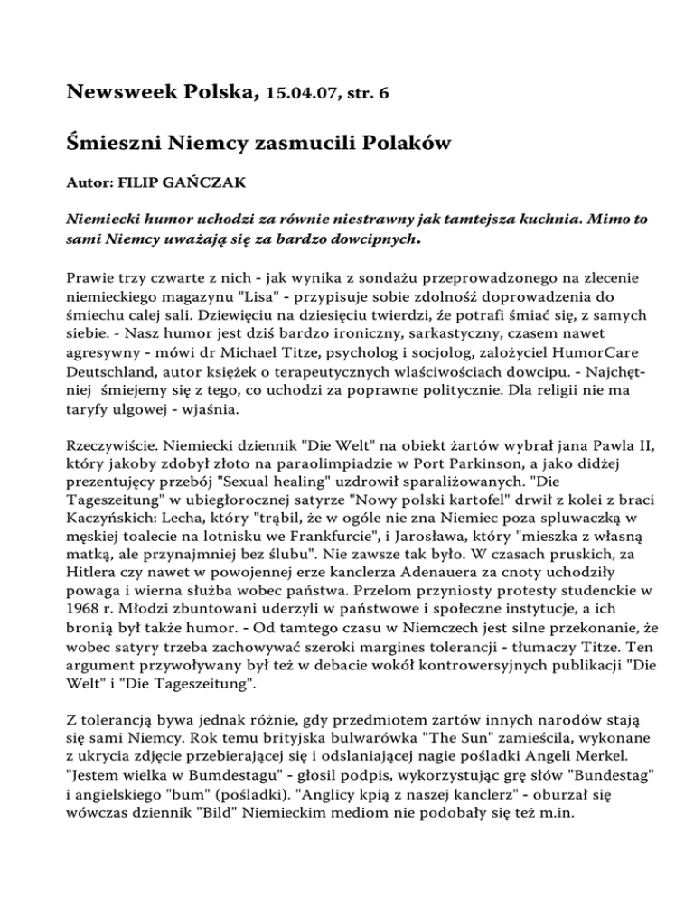Newsweek Polska, 15.04.07, str. 6 Śmieszni Niemcy zasmucili Polaków Autor: FILIP GAŃCZAK Niemiecki humor uchodzi za równie niestrawny jak tamtejsza kuchnia. Mimo to sami Niemcy uważają się za bardzo dowcipnych. Prawie trzy czwarte z nich - jak wynika z sondażu przeprowadzonego na zlecenie niemieckiego magazynu "Lisa" - przypisuje sobie zdolnośź doprowadzenia do śmiechu calej sali. Dziewięciu na dziesięciu twierdzi, źe potrafi śmiać się, z samych siebie. - Nasz humor jest dziś bardzo ironiczny, sarkastyczny, czasem nawet agresywny - mówi dr Michael Titze, psycholog i socjolog, zalożyciel HumorCare Deutschland, autor księżek o terapeutycznych wlaściwościach dowcipu. - Najchętniej śmiejemy się z tego, co uchodzi za poprawne politycznie. Dla religii nie ma taryfy ulgowej - wjaśnia. Rzeczywiście. Niemiecki dziennik "Die Welt" na obiekt żartów wybrał jana Pawla II, który jakoby zdobył złoto na paraolimpiadzie w Port Parkinson, a jako didżej prezentujęcy przebój "Sexual healing" uzdrowił sparaliżowanych. "Die Tageszeitung" w ubiegłorocznej satyrze "Nowy polski kartofel" drwił z kolei z braci Kaczyńskich: Lecha, który "trąbil, że w ogóle nie zna Niemiec poza spluwaczką w męskiej toalecie na lotnisku we Frankfurcie", i Jarosława, który "mieszka z własną matką, ale przynajmniej bez ślubu". Nie zawsze tak było. W czasach pruskich, za Hitlera czy nawet w powojennej erze kanclerza Adenauera za cnoty uchodziły powaga i wierna służba wobec państwa. Przelom przyniosty protesty studenckie w 1968 r. Młodzi zbuntowani uderzyli w państwowe i społeczne instytucje, a ich bronią był także humor. - Od tamtego czasu w Niemczech jest silne przekonanie, że wobec satyry trzeba zachowywać szeroki margines tolerancji - tłumaczy Titze. Ten argument przywoływany był też w debacie wokół kontrowersyjnych publikacji "Die Welt" i "Die Tageszeitung". Z tolerancją bywa jednak różnie, gdy przedmiotem żartów innych narodów stają się sami Niemcy. Rok temu brityjska bulwarówka "The Sun" zamieścila, wykonane z ukrycia zdjęcie przebierającej się i odslaniającej nagie pośladki Angeli Merkel. "Jestem wielka w Bumdestagu" - głosil podpis, wykorzystując grę słów "Bundestag" i angielskiego "bum" (pośladki). "Anglicy kpią z naszej kanclerz" - oburzał się wówczas dziennik "Bild" Niemieckim mediom nie podobały się też m.in. przemalowane na pornarańczowo helmy Wehrmachtu, które Holendrzy produkowali przed piłkarskim mundialem jako gadżet dla swoich kibiców.
