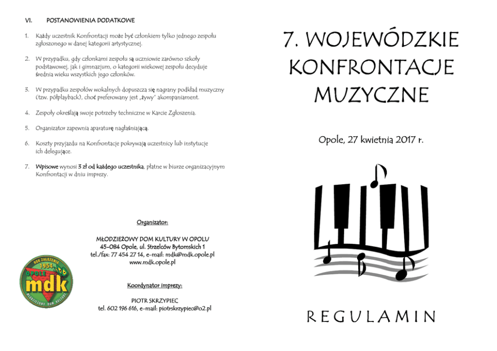 VI. 1. POSTANOWIENIA DODATKOWE Każdy uczestnik Konfrontacji może być członkiem tylko jednego zespołu zgłoszonego w danej kategorii artystycznej. 2. W przypadku, gdy członkami zespołu są uczniowie zarówno szkoły podstawowej, jak i gimnazjum, o kategorii wiekowej zespołu decyduje średnia wieku wszystkich jego członków. 3. W przypadku zespołów wokalnych dopuszcza się nagrany podkład muzyczny (tzw. półplayback), choć preferowany jest „żywy” akompaniament. 7. WOJEWÓDZKIE KONFRONTACJE KONFRONTACJE MUZYCZNE 4. Zespoły określają swoje potrzeby techniczne w Karcie Zgłoszenia. 5. Organizator zapewnia aparaturę nagłaśniającą. 6. Koszty przyjazdu na Konfrontacje pokrywają uczestnicy lub instytucje ich delegujące. 7. Wpisowe wynosi 3 zł od każdego ka dego uczestnika, uczestnika płatne w biurze organizacyjnym Konfrontacji w dniu imprezy. Opole, 27 kwietnia 2017 2017 r. Organizator: MŁODZIEŻOWY MŁODZIE OWY DOM KULTURY W OPOLU 4545-084 Opole, ul. Strzelców Bytomskich 1 tel./fax: 77 454 27 14, 14, ee-mail: [email protected] www.mdk.opole.pl Koordynator imprezy: imprezy: PIOTR SKRZYPIEC tel. 602 196 616, 616, e-mail: [email protected] REGULAMIN I. 1. CELE IMPREZY 2. W przypadku dużej liczby zgłoszeń, Organizator może ustalić dodatkowy termin przesłuchań konkursowych. Prezentacja dorobku szkolnych zespołów muzycznych oraz wymiana doświadczeń. 2. Propagowanie wartościowego repertuaru wokalnego i instrumentalnego. IV. 3. 1. Popularyzacja twórczości polskich kompozytorów i autorów tekstów. 4. Zachęcenie uczniów do aktywnego uczestnictwa w życiu kulturalnym szkoły i środowiska. II. 1. UCZESTNICY W Konfrontacjach mogą wziąć udział zespoły muzyczne działające w szkołach podstawowych i gimnazjach województwa opolskiego. 2. Zespoły zainteresowane udziałem w Konfrontacjach przysyłają na adres organizatora (lub e-mailem na adres koordynatora imprezy) – w terminie do 21 kwietnia 2017 2017 r. – Kartę Zgłoszenia oraz dokładnie opisaną płytę CD (lub komputerowy plik muzyczny) z nagraniem utworów zgłaszanych do Konfrontacji. Jakość techniczna nagrania nie będzie miała wpływu na ocenę. 3. Organizator powoła komisję, która oceni nadesłany materiał i dokona kwalifikacji do Konfrontacji. 4. O fakcie zakwalifikowania lub niezakwalifikowania się do Konfrontacji organizator powiadomi zespoły najpóźniej 3 dni przed terminem imprezy. 5. III. 1. W trakcie Konfrontacji każdy zespół zaprezentuje 2 lub 3 utwory (decyduje Jury). Piosenki powinny być wykonane w języku polskim. Czas występu: max. 10 min. TERMIN I MIEJSCE IMPREZY Konfrontacje odbędą się 27 kwietnia 2017 2017 r. (czwartek) w filii MDK w Opolu, Opolu, al. Przyjaźni Przyja ni 12 (dzielnica Nowa Wieś Królewska). KATEGORIE KONKURSOWE Kategorie ze względu na rodzaj zespołu: • zespoły wokalne (minimum 3 wokalistów), • zespoły wokalnowokalno-instrumentalne (minimum 2 instrumenty melodyczne), • zespoły instrumentalne (minimum 3 instrumenty melodyczne). 2. Kategorie ze względu na wiek uczestników: • zespoły ze szkół podstawowych, podstawowych • zespoły gimnazjalne gimnazjalne. alne V. 1. JURY I NAGRODY Oceny występujących zespołów dokona Jury powołane przez Organizatora. 2. Jury w swojej ocenie będzie kierowało się następującymi kryteriami: • dobór repertuaru, • intonacja, • emisja i dykcja (dot. zespołów wokalnych i wokalno-instrumentalnych), • frazowanie i dynamika, • instrumentacja (dot. zespołów instrumentalnych i wokalno-instrument.), • ogólny wyraz artystyczny. 3. W każdej kategorii konkursowej Jury może przyznać: • I miejsce, • II miejsce, • III miejsce, • wyróżnienia. 4. Jury przyzna dwóm wybranym przez siebie zespołom nagrodę ufundowaną przez Radio Opole – możliwość dokonania profesjonalnego nagrania w radiowym Studiu „M”. 5. Decyzje Jury mają charakter ostateczny. 7. WOJEWÓDZKIE WOJEWÓDZKIE KONFRONTACJE MUZYCZNE 2017 2017 7. WOJEWÓDZKIE KONFRONTACJE KONFRONTACJE MUZYCZNE 2017 KARTA ZGŁOSZENIA KARTA ZGŁOSZENIA NAZWA ZESPOŁU: .................................................................................................. NAZWA ZESPOŁU: .................................................................................................. SZKOŁA: ..................................................................................................................... SZKOŁA: ..................................................................................................................... KATEGORIA KONKURSOWA (rodzaj zespołu): ................................................... KATEGORIA KONKURSOWA (rodzaj zespołu): ................................................... LICZBA CZŁONKÓW ZESPOŁU: ............................................................................. LICZBA CZŁONKÓW ZESPOŁU: ............................................................................. TYTUŁY I AUTORZY PREZENTOWANYCH UTWORÓW: TYTUŁY I AUTORZY PREZENTOWANYCH UTWORÓW: 1. .................................................................................................................................. tytuł kompozytor autor słów 1. .................................................................................................................................. tytuł kompozytor autor słów 2. ................................................................................................................................. tytuł kompozytor autor słów 2. ................................................................................................................................. tytuł kompozytor autor słów 3. ………..................................................................................................................... tytuł kompozytor autor słów 3. ……….......................................................................................................