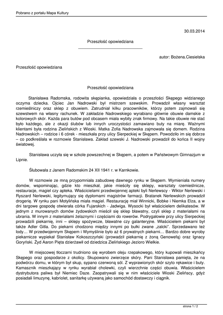 Pobrano z portalu Mapa Kultury 30.03.2014 Przeszłość opowiedziana ____________________________ autor: Bożena.Ciesielska Przeszłość opowiedziana Przeszłość opowiedziana Stanisława Radomska, rodowita skępianka, opowiedziała o przeszłości Skępego widzianego oczyma dziecka. Ojciec Jan Nadrowski był mistrzem szewskim. Prowadził własny warsztat rzemieślniczy oraz sklep z obuwiem. Zatrudniał kilku pracowników, którzy potem zajmowali się szewstwem na własny rachunek. W zakładzie Nadrowskiego wyrabiano głównie obuwie damskie z kolorowych skór. Każda para butów pod obcasem miała wybity znak firmowy. Na takie obuwie nie stać było każdego, ale z okazji ślubów lub innych uroczystości zamawiano buty na miarę. Ważnymi klientami była rodzina Zielińskich z Wioski. Matka Zofia Nadrowska zajmowała się domem. Rodzina Nadrowskich – rodzice i 6 córek - mieszkała przy ulicy Sierpeckiej w Skępem. Powodziło im się dobrze – co podkreślała w rozmowie Stanisława. Zakład szewski J. Nadrowski prowadził do końca II wojny światowej. Lipnie. Stanisława uczyła się w szkole powszechnej w Skępem, a potem w Państwowym Gimnazjum w Ślubowała z Janem Radomskim 24 XII 1941 r. w Karnkowie. W rozmowie ze mną przypomniała zabudowę dawnego rynku w Skępem. Wymieniała numery domów, wspominając, gdzie kto mieszkał, jakie mieściły się sklepy, warsztaty rzemieślnicze, restauracje, magiel czy apteka. Właścicielami przedwojennej apteki byli Nerlewscy - Wiktor Nerlewski i Ryszard Nerlewski, legitymujący się dyplomami magistrów farmacji. Bratanek Nerlewskich prowadził drogerię. W rynku pani Motylińska miała magiel. Restaurację miał Winnicki, Bobke i Niemka Elza, a w dni targowe gospodę otwierała córka Fujarskich - Jadwiga. Wysocki był właścicielem delikatesów. W jednym z murowanych domów żydowskich mieścił się sklep bławatny, czyli sklep z materiałami na ubrania. W innym z materiałami żelaznymi i częściami do rowerów. Podrygałowie przy ulicy Sierpeckiej prowadzili piekarnię, inni – sklepy spożywcze, bławatne czy galanteryjne. Właścicielem piekarni był także Adler Gitla. Do piekarni chodzono między innymi po bułki zwane „zalcki”. Sprzedawano też lody… W przedwojennym Skępem i Wymyślinie było aż 6 prywatnych piekarni… Bardzo dobre wyroby piekarnicze wypiekał Stanisław Kokoszczyński (prowadził piekarnię z żoną Genowefą) oraz Ignacy Goryński. Żyd Aaron Pięta dzierżawił od dziedzica Zielińskiego Jezioro Wielkie. W miejscowej tłoczarni trudniono się wyrobem oleju rzepakowego, który kupowali mieszkańcy Skępego oraz gospodarze z okolicy. Skupowano zwierzęce skóry. Pani Stanisława pamięta, że na podwórzu domu, w którym był skup, sypano czerwoną sól. Z wyprawionych skór szyto rękawice i buty. Kamasznik mieszkający w rynku wyrabiał cholewki, czyli wierzchnie części obuwia. Właścicielem dystrybutora paliwa był Niemiec Daze. Zaopatrywali się w nim właściciele Wioski Zielińscy, gdyż posiadali limuzynę, kabriolet, sanitarkę używaną jako samochód dostawczy i ciągnik. strona 1 / 2 Pobrano z portalu Mapa Kultury Pani Radomska wspominała targi odbywające się na głównym placu w Skępem, czyli na rynku. Dniem targowym była środa. Większe targi zwane jarmarkami odbywały się rzadziej... gdyż na nie miejscowość musiała otrzymać zezwolenie. Każdy z handlujących towarami miał przydzielony sektor. Żydzi mieli budki (stragany), w których sprzedawali śledzie. Byli rzeźnicy oferujący swoje wyroby masarskie. Handlowano przedmiotami domowego użytku. Na wielu straganach rozkładano kożuchy, garnitury, materiały na ubrania, firany czy buty. Piekarze oferowali wyroby piekarnicze. Były budki z produktami spożywczymi takimi jak: pomarańcze, cytryny, czekolady, szproty czy nabiał. Dla spragnionych rozstawiano budki, w których parzono herbatę w samowarach. Z Włocławka przywożono towary ceramiczne. Z Łodzi zwożono bluzki i halki. Z Lipna dostarczano trepki, czyli drewniane chodaki. Pani Stanisława przypomniała taką historię. Gdy poszła z matką na targ, zobaczyła chodaki, które bardzo jej się spodobały. Tak męczyła matkę, że w końcu kupiła jej owe trepki. Nie pomogły tłumaczenia, że ojciec ma warsztat szewski i sklep z obuwiem… Ku uciesze ludzi przygrywał kataryniarz, mający papugę. Tak zarabiał na życie. Chętni dawali sobie powróżyć. Dla mieszkańców jarmark był świętem. Na Targowicy – w innej części Skępego – handlowano gęśmi, świniami, krowami, owcami i końmi… Gęsi pędzono do Torunia na eksport. Fotografia przedstawia oryginalną pieczątkę i podpis właściciela piekarni w Skępem Stanisława Kokoszczyńskiego. Skępe, 22 maja 1950 r. Archiwum rodziny Ciesielskich Bożena Ciesielska KONKURS strona 2 / 2