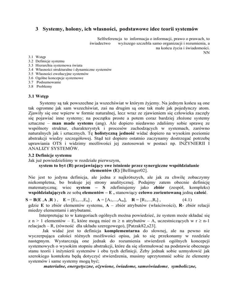 3 Systemy, holony, ich własności, podstawowe idee teorii systemów Selfreferencja to informacja o informacji, prawo o prawach, to świadectwo wyższego szczebla samo organizacji i rozumienia, a na końcu życia i świadomości. NN 3.1 3.2 3.3 3.4 3.5 3.6 3.7 3.8 Wstęp Definicje systemu Hierarchia systemowa świata Własności strukturalne i dynamiczne systemów Własności ewolucyjne systemów Ogólne koncepcje systemowe Podsumowanie Problemy 3.1 Wstęp Systemy są tak powszechne ja wszechświat w którym żyjemy. Na jednym końcu są one tak ogromne jak sam wszechświat, zaś na drugim są one tak małe jak pojedynczy atom. Zjawiły się one wpierw w formie naturalnej, lecz wraz ze zjawieniem się człowieka zaczęły się pojawiać inne systemy; na początku proste a potem coraz bardziej złożone systemy sztuczne – man made systems (ang). Ale dopiero niedawno zdaliśmy sobie sprawę ze wspólnoty struktur, charakterystyk i procesów zachodzących w systemach, zarówno naturalnych jak i sztucznych. Tę holistyczną jedność widać dopiero na wysokim poziomie abstrakcji wiedzy szczegółowej. Stąd też dopiero ostatnio zaczynamy dostrzegać potrzebę uprawiania OTS i widzimy możliwości jej zastosowań w postaci np. INŻYNIERII I ANALIZY SYSTEMÓW. 3.2 Definicje systemu Jak już powiedzieliśmy w rozdziale pierwszym, system to byt (B) przejawiający swe istnienie przez synergiczne współdziałanie elementów (E) [Bellinger02]. Nie jest to jedyna definicja, ale jedna z najkrótszych, ale jak za chwilę zobaczymy niekompletna, bo brakuje jej strony analitycznej. Podajmy zatem obecnie definicję matematyczną; wiec system – S zdefiniujemy jako zbiór (zespół, kompleks) współdziałających ze sobą elementów – E , stanowiący celowo zorientowaną jedną całość. (4.1) S = B(E ,A ,R ) , E = [E1,...,En] , A = [A1,...,Am], R = [R1,...,Rr] , gdzie E to zbiór elementów systemu, A – zbiór atrybutów (właściwości), R- zbiór relacji miedzy elementami i atrybutami. Interpretując to w kategoriach ogólnych można powiedzieć, że system może składać się z n > 1 elementów – E, które mogą mieć m ≥ n atrybutów – A, uczestniczących w r ≥ n-1 relacjach – R, (równość dla układu szeregowego), [Patzak82,s23]. Jak widać jest to definicja komplementarna do słownej, ale na pewno nie wyczerpująca całości różnych możliwości opisu, jak to się przekonamy w rozdziale następnym. Wystarczają one jednak do rozumienia stwierdzeń ogólnych koncepcji systemowych o wysokim stopniu abstrakcji, które da się sformułować na podstawie obecnego stanu teorii i inżynierii systemów i obu tych definicji. Żeby jednak sobie uzmysłowić jak szerokiego kontekstu będą dotyczyć stwierdzenia, musimy uprzytomnić sobie że elementy systemów i same systemy mogą być; materialne, energetyczne, ożywione, świadome, samoświadome, symboliczne, i to w dowolnej ich konfiguracji. Nasze stwierdzenia ogólne będą więc dotyczyć szerokiej klasy obiektów, od atomu wodoru do wszechświata jako całości, który zawiera; materię, budowle, maszyny, ekosferę, ludzi, systemy idei, oprogramowanie, itp. 3.3 Hierarchia systemowa świata Powyższa definicja systemu odnosi się do całej obserwowalnej rzeczywistości, zarówno na poziomie fizycznym jak i abstrakcyjnym i symbolicznym. Łatwo się stąd domyśleć, że w zależności od tego poziomu definicji systemu jej szczegółowa artykulacja ( również definicyjna), artykulacja jego elementów i atrybutów może być czasami bardzo różna. Według jednego z twórców OTS Building’a (wg. [Blanchard90]) należy wyróżnić co najmniej dziewięć hierarchicznych poziomów istnienia systemów, z których każdy następny wyłania nowe właściwości, a oto one. 1. Poziom „struktur statycznych” dominujących w geografii i anatomii wszechświata, gdzie dominuje ruch i kohezja. 2. Poziom prostych systemów dynamicznych typu „zegar” zawierający w sobie istotną część fizyki, chemii i techniki (maszyny, urządzenia), gdzie własności materialne determinuje struktura i proces. 3. Poziom tzw. Systemów „cybernetycznych” typu homeostat bazujących na odbiorze, transmisji i interpretacji informacji. 4. Poziom „komórki”, systemu samo utrzymującego się – otwartego, gdzie życie zaczyna się manifestować. 5. Poziom „rośliny”, ze strukturą genetyczno – społeczną tworzący świat flory, z główną cecha wzrostu i samo odtwarzalnością. 6. Poziom „zwierzęcia”, ujmujący ruchliwość, celowe dążenia, popędy i świadomość. 7. Poziom „człowieka”, charakterystyczny samoświadomością i zdolnością wytwarzania, przyjmowania i interpretacji symboli. 8. Poziom „organizacji społecznej”, gdzie liczą się zawartość i znaczenie przekazu, system wartości, utrwalanie obrazów w przekazach historycznych, sztuka, muzyka, poezja i złożone emocje ludzkie. 9. Poziom „niewiadomego”, gdzie struktury i relacje mogą być postulowane lecz odpowiedzi nie są jeszcze znane. Inny jeszcze bardziej ogólny podział otaczającej nas rzeczywistości przedstawia Rys. 3.1 w postaci piramidy ewolucji substancji [Cempel98] . W tym ujęciu substancja to zorganizowany agregat materii, energii i świadomości, a rozmiar jej ewolucji sięga od pierwotnej energii i świadomości przestrzeni kosmicznej, aż do substancji duchowej. Rys. 3.1 Poziomy bytu i ewolucji substancji kosmicznej [Cempel98]]. Pouczające będzie tu dalej przestudiowanie hierarchii ludzkiej, od pojedynczej komórki poczynając (100) a na całej ludzkości kończąc (1024), tak jak to przedstawiono na rys 3.2, pomijając jednak całą złożoność organizacyjną każdego szczebla hierarchii. Więcej podobnych ujęć hierarchicznych można znaleźć w [Skyttner01,r3]. Rys. 3.2 Metasystem i systemy hierarchii ludzkiej [Klir76]. Patrząc na zarysowane wyżej hierarchie można od razu dojść do przekonania jak dużą siłę wnioskowania i