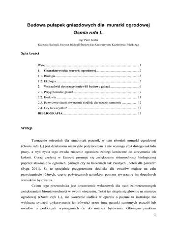 Budowa pułapek gniazdowych dla murarki ogrodowej Osmia rufa L. mgr Piotr Szefer Katedra Ekologii, Instytut Biologii Środowiska Uniwersytetu Kazimierza Wielkiego Spis treści Wstęp................................................................................................................. 1 1. Charakterystyka murarki ogrodowej .................................................... 2 1.1. Biologia...................................................................................................... 3 1.2. Ekologia ..................................................................................................... 5 2. Wskazówki dotyczące hodowli i budowy gniazd................................... 6 2.1. Przygotowanie gniazd ................................................................................ 7 2.2. Hodowla ................................................................................................... 11 2.3. Pozytywne skutki stwarzania siedlisk dla pszczół samotnic ................... 12 2.4. Czy to wszystko? ..................................................................................... 12 BIBLIOGRAFIA: .......................................................................................... 13 Wstęp Tworzenie schronień dla samotnych pszczół, w tym również murarki ogrodowej (Osmia rufa L.) jest działaniem niezwykle pożytecznym i nie wymaga zbyt dużego nakładu pracy, a tryb życia tego owada znacznie ogranicza zabiegi konieczne do utrzymania ich kolonii. Coraz częściej w Europie promuje się zwiększanie różnorodności biologicznej poprzez stawianie w ogrodach, parkach czy na balkonach tak zwanych „hoteli dla pszczół” (Syga 2011). Są to specjalnie przygotowane siedliska dla owadów mające na celu przyciągnięcie różnych, często pożytecznych gatunków poprzez stwarzanie im dogodnych warunków bytowania. Celem tego przewodnika jest dostarczenie wskazówek dla osób zainteresowanych zwiększaniem bioróżnorodności w swoim otoczeniu. Tekst ten skupia się głównie na murarce ogrodowej (Osmia rufa L.), ale tworzenie siedlisk w oparciu o podane tu instrukcje nie wyklucza sytuacji wykorzystania ich również przez inne gatunki samotnych pszczół lub owadów o podobnych wymaganiach co do miejsca bytowania. Głównym punktem 1 niniejszego opracowania jest rozdział poświęcony przygotowaniu gniazd, zawierający wskazówki dotyczące wymagań pszczoły odnośnie ich wymiarów, kształtu czy orientacji. Dla głębszego zrozumienia potrzeb pszczoły murarki i specyfiki gniazdowania przedstawiono także krótkie charakterystyki dotyczące ekologii i biologii Osmia rufa L. W końcowych rozdziałach podano kilka informacji dla osób zainteresowanych hodowlą tej pożytecznej pszczoły. Składają się na nie odnośniki do literatury i portali internetowych związanych z hodowlą murarek. Krótko także omówiono także problem spadku bioróżnorodności i zaznaczono pozytywne skutki stwarzania siedlisk dla owadów, w tym także owadów zapylających. 1. Charakterystyka murarki ogrodowej Osmia rufa L. to jednopokoleniowy, wczesnowiosenny gatunek pszczoły z rodziny miesierkowatych (Megachilidae). Stosunkowo duża (10 – 12mm, 40 do 100 mg) pszczoła, gęsto owłosiona i, jak większość przedstawicieli rodziny, przenosząca pyłek na specjalnej szczoteczce na spodniej stronie odwłoka (Fot. 1) (Banaszak, Romasenko 2001). Żyje samotnie, ale może w odpowiednich warunkach tworzyć bardzo duże kolonie (Glejdasz, Wilkaniec 2008). Nie produkuje miodu na skalę gospodarczą. Ten pospolity w Europie gatunek wykorzystywany jest głównie do zapylania drzew owocowych (Biliński, Teper 2004). Łatwość hodowli sprawia, że schronienia dla wielu gatunków samotnie żyjących dzikich pszczół (między innymi murarki ogrodowej) stanowią element ozdobny przydomowych ogródków oraz ogrodów botanicznych a ich hodowlę rozpatrywać można jako przyjemne hobby. Fot 1. Pokrój ciała murarki ogrodowej (Osmia rufa L.). Od lewej samiec i samica (fot. P.Szefer). 2 1.1.Biologia W ciągu roku murarka ogrodowa daje tylko jedno pokolenie. Pierwsze samce pojawiają się w kwietniu, a ostatnie samice oblatują rośliny do czerwca (Banaszak, Romasenko 2001; Ruszkowski i inni 1998). Oblot dorosłe owady rozpoczynają już w temperaturze 15˚C (Glejdasz, Wilkaniec 2008). Murarka jest pszczołą polilektyczną (korzystającą z pyłku i nektaru wielu gatunków roślin). Na liście roślin pokarmowych znajduje się ponad 150 gatunków (Ruszkowski, Biliński 1986; Wilkaniec, Warakomska 1992). Często wymienia się tu także gatunki wiatropylne, takie jak Juglans (orzech włoski), czy Quercus (dąb) (Teper 2007). Murarka jako miejsca gniazdowania wykorzystuje istniejące już szczeliny i otwory, takie jak pęknięcia w drewnianych konstrukcjach, suche łodygi roślin, szczeliny w zaprawie lub pustakach. Samica tworzy liniowe gniazdo składające się z 2 – 15 kompartmentów (komórek) oddzielonych przegrodami z błota zmieszanego ze śliną (komórek), gdzie do komórek budowanych i zaopatrywanych jako pierwsze składane są jaja, z których wylęgną się samice. Z jaj położonych bliżej wylotu powstaną natomiast samce (Ivanov 2006). Gniazdo może mieć średnicę od 5 – 8 mm, przy czym najwyższą liczbę komórek osiągają gniazda o średnicach granicznych (5 i 8 mm) (Wilkaniec 1998). Głębokość to 10 – 15 cm. Komórka ma zwykle ok. 4 – 6 mm a długość 9 – 18 mm (Ryc. 1). Ryc. 1. Przekrój przez gniazdo Osmia rufa L., utworzone w wydrążonej łodydze (wg Banaszaka i Romasenko 2001) (a) oraz zbliżenie pojedynczej komórki (b). 3 Ostateczne zamknięcie gniazda ma większą grubość: 5 – 10 mm i jest najcięższe (Ivanov 2006). Jednorazowe przygotowanie pokarmu dla czerwiu to około 30 wylotów (łącznie kilka tysięcy kwiatów, ok 10 kwiatów/ minutę) (Tasei, 1973). Za każdym razem pszczoła przenosi od 4 do 10 mg pyłku aż do osiągnięcia