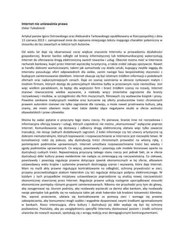 Internet nie unieważnia prawa Oskar Tułodziecki Artykuł panów Igora Ostrowskiego oraz Aleksandra Tarkowskiego opublikowany w Rzeczpospolitej z dnia 13 czerwca 2013 r. zainspirował mnie do napisania niniejszego tekstu mającego charakter polemiczny w stosunku do tez zawartych w tekście tych Autorów. Od wielu lat daje się obserwować coraz większe znaczenie Internetu w prowadzeniu działalności gospodarczej. Branże bardzo odległe od branży informatycznej lub telekomunikacyjnej wykorzystują Internet do oferowania drogą elektroniczną swoich towarów i usług. Obecnie można mieć w Internecie rachunek bankowy, kupić przez Internet wycieczkę turystyczną, a także zrobić zakupy spożywcze. Nawet w handlu dobrami wartościowymi, takimi jak samochody czy dzieła sztuki, kupujący zwykle sięgają do Internetu poszukując ofert odpowiednich dla siebie, zanim nastąpi faza bezpośredniej styczności z budzącym zainteresowanie obiektem. Internet okazuje się być istotnym źródłem informacji o podobnych ofertach oraz najkorzystniejszych cenach. Daje on szansę zaistnienia w obrocie rynkowym małym i średnim firmom, których dostęp do potencjalnych klientów byłby w przeciwnym razie niemożliwy. Jest więc wielkim paradoksem, że będąc dla większości firm i branż źródłem szansy na rozwój, Internet stanowi równocześnie wielkie wyzwanie, a niekiedy wręcz śmiertelne zagrożenie dla branży rozrywkowej i mediów, w szczególności dla firm muzycznych, filmowych czy wydawców książek i prasy. Powolne zanikanie tradycyjnych mediów oraz kurczenie się oferty producentów treści chronionych prawem autorskim stanowi nie tylko zagrożenie dla rozwoju, a może nawet przetrwania kultury, jaką znamy, ale moim zdaniem może mieć także daleko idące negatywne skutki w sferze wolności obywatelskich i praw człowieka. Można by zadać pytanie o przyczyny tego stanu rzeczy. Po pierwsze, branże inne niż rozrywkowa i informacyjna oferują towary i usługi, których częstokroć nie można „skonsumować” wyłącznie poprzez Internet. Komunikowanie się dostawcy i odbiorcy drogą elektroniczną ułatwia więc tylko zawarcie transakcji, nie niosąc żadnych dodatkowych zagrożeń. Z kolei informacje czy też utwory artystyczne są dobrami niematerialnymi, których kopiowanie i rozpowszechnianie w Internecie jest niezwykle łatwe. W konsekwencji rodzi się pokusa, aby dystrybucję treści chronionych prowadzić na własną rękę, z pominięciem podmiotów uprawnionych. Internet umożliwia rozpowszechnianie treści bez wiedzy i zgody podmiotów uprawnionych. Co więcej, powstawały i powstają całe modele biznesowe oparte na dystrybucji cudzych treści. Najważniejszą przyczyną takiego stanu rzeczy jest jednak fakt, że w sferze dystrybucji dóbr kultury prawo ewidentnie nie nadąża za zmieniającą się rzeczywistością. Co ciekawe, powstawały i powstają regulacje prawne dotyczące zjawisk ekonomicznych w tej sferze, albowiem ustawodawcy wielu krajów i systemów prawnych dostrzegają szanse i wyzwania, które daje Internet. Mam na myśli akty prawne regulujące kontraktowanie na odległość, ochronę prywatności w sieci, przepisy przeciwdziałające atakom hakerskim czy też regulacje dotyczące podpisu elektronicznego. W każdym z tych przypadków inicjatywy ustawodawcze poprzedzone są analizą nowej rzeczywistości ekonomicznej stworzonej przez Internet. Regulacje prawne usiłują następnie uporządkować stosunki ekonomiczne pomiędzy różnymi grupami zainteresowanych. Nikomu nie przychodzi przy tym do głowy, aby zasugerować np. biurom podróży, aby rozdawały wycieczki za darmo albo bankom, aby rozdawały swoje pieniądze lub godziły się na nadużycia takie jak ataki hakerskie lub kradzież tożsamości klientów. Nie, wprost przeciwnie, ułatwia się kontraktowanie za pomocą sieci i wzmaga się prawne zabezpieczenia, aby konsumenci mogli szybko i wygodnie dysponować swymi środkami zgromadzonymi w bankach. Rzecz interesująca, sfera kultury i dystrybucji jej dóbr wydaje się być tej ochrony pozbawiona. Postulaty, aby po uwzględnieniu specyfiki Internetu dostosować poziom i środki ochrony utworów do nowych wyzwań, spotykają się z wrogą reakcją oraz demagogicznymi kontrargumentami. Unijne dyrektywy z 2001 roku – o prawie autorskim w społeczeństwie informacyjnym oraz o handlu elektronicznym, a nawet dyrektywa o przestrzeganiu praw własności intelektualnej z 2004 roku, są wysoce nieadekwatne do tego celu, a próba implementacji nawet tych nie dość doskonałych przepisów bywa torpedowana, chyba że chodzi o zwolnienia z odpowiedzialności prawnej dostawców usług internetowych, i to w zakresie daleko wykraczającym poza standard wyznaczony prawem unijnym. Główną przyczyną wydaje się być oczywisty konflikt pomiędzy wysokim poziomem praw własności intelektualnej a rozwojem przemysłu internetowego. Niski poziom ochrony stwarza dostawcom rozmaitych usług internetowych okazję do uzyskania wysokich przychodów, w formie sprzedaży samego „ruchu” w Internecie, czy też wskutek pośrednictwa w „wymianie” cudzych treści odbywającej się pomiędzy osobami nieuprawnionymi, czy wreszcie wskutek oferowania usług wyszukiwania oraz agregowania „wolnych” zasobów. Modele biznesowe są znane, a łączy je jedno: przychody są generowane wskutek zainteresowania internautów darmowymi treściami, przy czym udostępnianie tych treści odbywa się bez udziału uprawnionych, którzy mogą tylko bezradnie obserwować jak inni zyskują na ich dziełach. Jest paradoksem, że sytuacja taka zdaje się odpowiadać rozmaitym organizacjom zajmującym się nominalnie promowaniem wolności w Internecie. Propagując rozszerzającą się, ich zdaniem, wolność jednostki i kultury pochwalają ten stan. Co więcej, nie tylko przeciwstawiają się one dostosowaniu prawa do wymogów rzeczywistości cyfrowej, ale jeszcze wręcz namawiają 