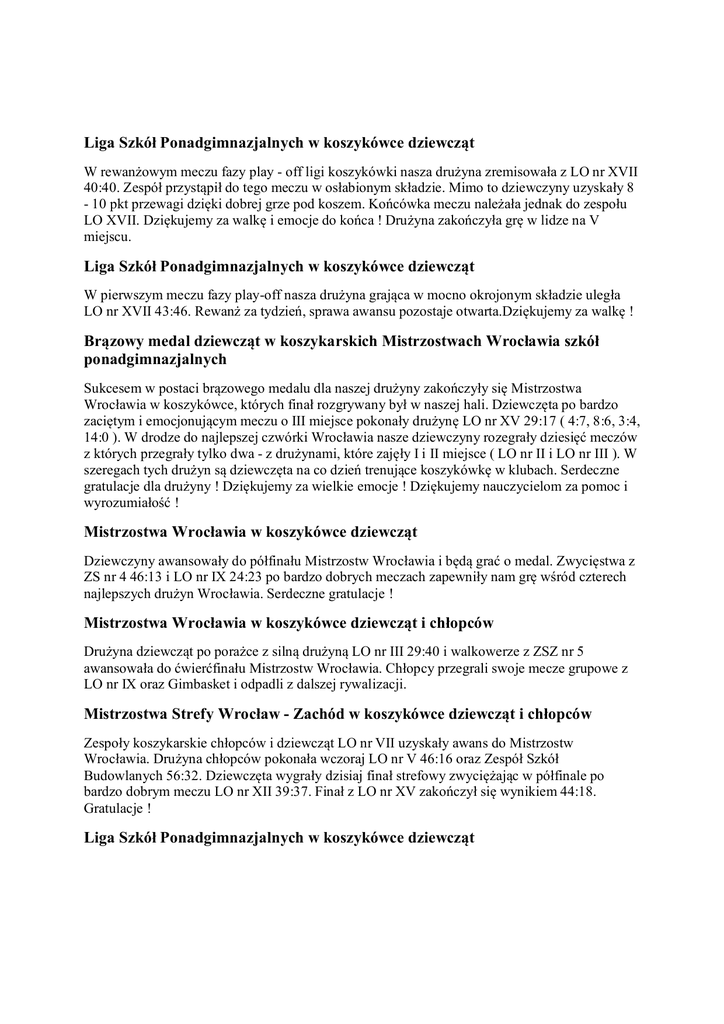 Liga Szkół Ponadgimnazjalnych w koszykówce dziewcząt W rewanżowym meczu fazy play - off ligi koszykówki nasza drużyna zremisowała z LO nr XVII 40:40. Zespół przystąpił do tego meczu w osłabionym składzie. Mimo to dziewczyny uzyskały 8 - 10 pkt przewagi dzięki dobrej grze pod koszem. Końcówka meczu należała jednak do zespołu LO XVII. Dziękujemy za walkę i emocje do końca ! Drużyna zakończyła grę w lidze na V miejscu. Liga Szkół Ponadgimnazjalnych w koszykówce dziewcząt W pierwszym meczu fazy play-off nasza drużyna grająca w mocno okrojonym składzie uległa LO nr XVII 43:46. Rewanż za tydzień, sprawa awansu pozostaje otwarta.Dziękujemy za walkę ! Brązowy medal dziewcząt w koszykarskich Mistrzostwach Wrocławia szkół ponadgimnazjalnych Sukcesem w postaci brązowego medalu dla naszej drużyny zakończyły się Mistrzostwa Wrocławia w koszykówce, których finał rozgrywany był w naszej hali. Dziewczęta po bardzo zaciętym i emocjonującym meczu o III miejsce pokonały drużynę LO nr XV 29:17 ( 4:7, 8:6, 3:4, 14:0 ). W drodze do najlepszej czwórki Wrocławia nasze dziewczyny rozegrały dziesięć meczów z których przegrały tylko dwa - z drużynami, które zajęły I i II miejsce ( LO nr II i LO nr III ). W szeregach tych drużyn są dziewczęta na co dzień trenujące koszykówkę w klubach. Serdeczne gratulacje dla drużyny ! Dziękujemy za wielkie emocje ! Dziękujemy nauczycielom za pomoc i wyrozumiałość ! Mistrzostwa Wrocławia w koszykówce dziewcząt Dziewczyny awansowały do półfinału Mistrzostw Wrocławia i będą grać o medal. Zwycięstwa z ZS nr 4 46:13 i LO nr IX 24:23 po bardzo dobrych meczach zapewniły nam grę wśród czterech najlepszych drużyn Wrocławia. Serdeczne gratulacje ! Mistrzostwa Wrocławia w koszykówce dziewcząt i chłopców Drużyna dziewcząt po porażce z silną drużyną LO nr III 29:40 i walkowerze z ZSZ nr 5 awansowała do ćwierćfinału Mistrzostw Wrocławia. Chłopcy przegrali swoje mecze grupowe z LO nr IX oraz Gimbasket i odpadli z dalszej rywalizacji. Mistrzostwa Strefy Wrocław - Zachód w koszykówce dziewcząt i chłopców Zespoły koszykarskie chłopców i dziewcząt LO nr VII uzyskały awans do Mistrzostw Wrocławia. Drużyna chłopców pokonała wczoraj LO nr V 46:16 oraz Zespół Szkół Budowlanych 56:32. Dziewczęta wygrały dzisiaj finał strefowy zwyciężając w półfinale po bardzo dobrym meczu LO nr XII 39:37. Finał z LO nr XV zakończył się wynikiem 44:18. Gratulacje ! Liga Szkół Ponadgimnazjalnych w koszykówce dziewcząt Po długiej przerwie koszykarki ponownie rozpoczęły zmagania w lidze koszykówki. Niestety, mimo świetnej gry w pierwszej i drugiej kwarcie dziewczyny uległy LO nr XVII 33:54. Dziękujemy za walkę ! Mistrzostwa Strefy Wrocław - Zachód w koszykówce dziewcząt i chłopców Koszykarki i koszykarze rozpoczęli zmagania w Licealiadzie. Dziewczęta pokonując wysoko LO nr VI 77:6 oraz ZS nr 3 41:11 awansowały do finału strefy i Mistrzostw Wrocławia. Chłopcy ulegli bardzo silnej drużynie LO nr VI 33:57 w której szeregach grało kilku zawodników. W drugim meczu pokonali drużynę ZS nr 6 88:16 i będą walczyć w finale B strefy o IV miejsce premiowane awansem do Mistrzostw Wrocławia. Liga Szkół Ponadgimnazjalnych w siatkówce chłopców Siatkarze rozegrali dwa mecze w I lidze siatkówki. W pierwszym pokonali ZS nr 18 3:2, drugi zakończył się porażką 2:3 z ZSB. Liga Szkół Ponadgimnazjalnych w koszykówce dziewcząt Zła passa koszykarek trwa dalej. Tym razem nasza drużyna uległa po stojącym na bardzo dobrym poziomie meczu drużynie LO III 31:48. Mistrzostwa Wrocławia w siatkówce chłopców Nie udało się awansować drużynie siatkarzy do półfinału Licealiady. Chłopcy po słabej grze przegrali z LO XI 0:2 i ZS 4 0:2. Mistrzostwa Wrocławia w siatkówce chłopców Chłopcy po bardzo zaciętej walce i przy gorącym dopingu kibiców wygrali z LO XIII 2:1 oraz LO III 2:1. Gratulujemy awansu do ćwierćfinału ! Mistrzostwa Wrocławia w siatkówce dziewcząt Siatkarki wygrały mecz z ZSEiA 2:0 oraz przegrały z LO II 0:2. Jedno zwycięstwo oznacza awans do etapu gier ćwierćfinałowych. Liga Szkół Ponadgimnazjalnych w siatkówce chłopców Siatkarze przegrali swoje pierwsze mecze w I lidze z ZSP Syców 0:3 oraz ZS Milicz 0:3. Liga Szkół Ponadgimnazjalnych w koszykówce dziewcząt Pod długiej, trwającej miesiąc przerwie w rozgrywkach, nasze koszykarki nie zdążyły złapać dobrej formy i przegrały mecze z LO XV 29:33 oraz LO IX 37:62. Liga Szkół Ponadgimnazjalnych w koszykówce dziewcząt Koszykarki pokonały na wyjeździe zespół ZS 3 83:23. Liga Szkół Ponadgimnazjalnych w siatkówce chłopców LO VII pokonało EZN 3:2 w meczu barażowym o I ligę siatkówki. Mistrzostwa Strefy Wrocław - Zachód w siatkówce chłopców Reprezentacja chłopców rozegrała mecze w finale strefy Licealiady. Siatkarze pokonali kolejno SMS 2:0 i ZSB 2:1 doznając jednej porażki z LO XV 0:2. Bardzo dobre II miejsce oznacza awans do Mistrzostw Wrocławia. Gratulacje ! Mistrzostwa Strefy Wrocław - Zachód w siatkówce dziewcząt Drużyna dziewcząt zajęła III miejsce w rozgrywkach strefowych Licealiady i awansowała do Mistrzostw Wrocławia. Gratulacje ! Wyniki meczów: LO VII - ZSB 2:0, LO VII ZS 3 2:0, Lo VII - LO XV 0:2, LO VII - LO XII 0:2. Liga Szkół Ponadgimnazjalnych w koszykówce dziewcząt Koszykarki bardzo udanie zainaugurowały nowy sezon pewnie pokonując na własnym boisku ZS nr 4 51:8. Gratulacje ! Mistrzostwa Wrocławia w Biegach Przełajowych W rozegranych wczoraj na Morskim Oku Mistrzostwach Wrocławia w Biegach Przełajowych reprezentacja naszej szkoły zajęła drużynowo II miejsce w kategorii chłopców i III miejsce w kategorii dziewcząt. Gratulacje ! Liga Szkół Ponadgimnazjalnych w koszykówce chłopców Pierwsze zwycięstwo w nowym sezonie odnieśli koszykarze pokonując LO nr XV 76:8. Gratulacje ! Liga Szkó