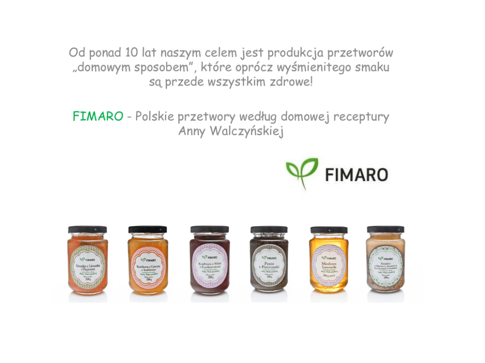 Od ponad 10 lat naszym celem jest produkcja przetworów „domowym sposobem”, które oprócz wyśmienitego smaku są przede wszystkim zdrowe! FIMARO - Polskie przetwory według domowej receptury Anny Walczyńskiej Konfitury FIMARO Konfitura z cytryny z imbirem Konfitura z agrestu z imbirem Gramatury netto: 40gr/200gr/540gr/1500gr Gramatury netto: 40gr/200gr/540gr/1500gr Data przydatności: 12 miesięcy Data przydatności: 12 miesięcy Skład: 75% cytryny, cukier, imbir z korzenia, pektyna Skład: 75% imbir, cukier, imbir z korzenia, pektyna Produkt pasteryzowany. Przechowywać w suchym i chłodnym miejscu. Po otwarciu przechowywać w lodówce. Produkt pasteryzowany. Przechowywać w suchym i chłodnym miejscu. Po otwarciu przechowywać w lodówce. Konfitura z czarnego bzu Konfitura z malin Gramatury netto: 40gr/200gr/540gr/1500gr Gramatury netto: 40gr/200gr/540gr/1500gr Data przydatności: 12 miesięcy Data przydatności: 12 miesięcy Skład: 75% czarny bez, cytryna, cukier, pektyna Skład: 75% maliny, cukier, pektyna (niskosłodzona) (niskosłodzona) Produkt pasteryzowany. Przechowywać w suchym i chłodnym miejscu. Po otwarciu przechowywać w lodówce. (niskosłodzona) (niskosłodzona) Produkt pasteryzowany. Przechowywać w suchym i chłodnym miejscu. Po otwarciu przechowywać w lodówce. Konfitury FIMARO Konfitura z jabłek z miętą Konfitura z pomarańczy Gramatury netto: 40gr/200gr/540gr/1500gr Gramatury netto: 40gr/200gr/540gr/1500gr Data przydatności: 12 miesięcy Data przydatności: 12 miesięcy Skład: 75% jabłka, cukier, liście mięty, angielska pasta miętowa, pektyna Skład: 75% pomarańcze, cukier, pektyna Produkt pasteryzowany. Przechowywać w suchym i chłodnym miejscu. Po otwarciu przechowywać w lodówce. Produkt pasteryzowany. Przechowywać w suchym i chłodnym miejscu. Po otwarciu przechowywać w lodówce. Konfitura z truskawek z cynamonem Konfitura z wiśni (niskosłodzona) (niskosłodzona) Gramatury netto: 40gr/200gr/540gr/1500gr Data przydatności: 12 miesięcy Skład: 75% truskawek, cukier, cynamon, pektyna Produkt pasteryzowany. Przechowywać w suchym i chłodnym miejscu. Po otwarciu przechowywać w lodówce. (niskosłodzona) (niskosłodzona) Gramatury netto: 40gr/200gr/540gr/1500gr Data przydatności: 12 miesięcy Skład: 75% wiśnie, cukier, pektyna Produkt pasteryzowany. Przechowywać w suchym i chłodnym miejscu. Po otwarciu przechowywać w lodówce. Konfitury FIMARO Konfitura z wiśni z kardamonem Powidła z orzechami włoskimi Gramatury netto: 40gr/200gr/540gr/1500gr Gramatury netto: 40gr/200gr/540gr/1500gr Data przydatności: 12 miesięcy Data przydatności: 12 miesięcy Skład: 75% wiśnie, cukier, kardamon, pektyna Skład: 140gr na 100gr produktu śliwek węgierek, cukier, orzechy włoskie (ALERGEN), pektyna (niskosłodzone) (niskosłodzona) Produkt pasteryzowany. Przechowywać w suchym i chłodnym miejscu. Po otwarciu przechowywać w lodówce. Konfitura z czerwonej porzeczki Konfitura z czarnej porzeczki (niskosłodzona) Gramatury netto: 40gr/200gr/540gr Produkt pasteryzowany. Przechowywać w suchym i chłodnym miejscu. Po otwarciu przechowywać w lodówce. (niskosłodzona) JUŻ WKRÓTCE! Gramatury netto: 40gr/200gr/540gr JUŻ WKRÓTCE! Data przydatności: 12 miesięcy Data przydatności: 12 miesięcy Skład: 75% czerwonej porzeczki, cukier, pektyna Skład: 75% cytryny, cukier, imbir z korzenia, pektyna Produkt pasteryzowany. Przechowywać w suchym i chłodnym miejscu. Po otwarciu przechowywać w lodówce. Produkt pasteryzowany. Przechowywać w suchym i chłodnym miejscu. Po otwarciu przechowywać w lodówce. Miody smakowe FIMARO Miód wielokwiatowy z Płatkami róży Miód wielokwiatowy z lawendą Gramatury netto: Gramatury netto: 40gr/200gr/540gr 40gr/200gr/540gr Data przydatności: 12 miesięcy Data przydatności: 12 miesięcy Skład: polski miód wielokwiatowy cukier, kwiat lawendy, syrop lawendowy Skład: polski miód wielokwiatowy susz różany, kwas octowy, syrop różany, cukier Produkt pasteryzowany. Ulega naturalnej krystalizacji. Produkt pasteryzowany. Ulega naturalnej krystalizacji Miód wielokwiatowy z miętą Miód wielokwiatowy z imbirem Gramatury netto: Gramatury netto: 40gr/200gr/540gr JUŻ WKRÓTCE! 40gr/200gr/540gr JUŻ WKRÓTCE! Data przydatności: 12 miesięcy Data przydatności: 12 miesięcy Skład: polski miód wielokwiatowy liście mięty, syrop miętowy Skład: polski miód wielokwiatowy tarty imbir Produkt pasteryzowany. Ulega naturalnej krystalizacji Produkt pasteryzowany. Ulega naturalnej krystalizacji Przetwory Wytrawne FIMARO Pesto z natki pietruszki Gramatury netto: Konfitura z wiśni w marynacie 40gr/200gr Gramatury netto: 40gr/200gr Data przydatności: 12 miesięcy Data przydatności: 12 miesięcy Skład: Natka pietruszki 90gr, oliwa z oliwek, czosnek, oregano, tymianek, kwas octowy, sól, pieprz czarny cukier trzcinowy Skład: 75% wiśni, cukier, kwas octowy, ziele angielskie, pieprz, cząber, cynamon pektyna Produkt pasteryzowany. Przechowywać w suchym i chłodnym miejscu. Po otwarciu przechowywać w lodówce. . Produkt pasteryzowany. Przechowywać w suchym i chłodnym miejscu. Po otwarciu przechowywać w lodówce. . Smalec z oliwkami, kaparami Pomidorami i czosnkiem Miód wielokwiatowy z czarnymi truflami Gramatury netto: 40gr/200gr/540gr Gramatury netto: Data przydatności: 12 miesięcy Skład: Słonina, oliwki, mieszanka przypraw, suszone pomidory kapary, czosnek, cebula Produkt pasteryzowany. Przechowywać w suchym i chłodnym miejscu. Po otwarciu przechowywać w lodówce. 40gr/200gr Data przydatności: 12 miesięcy Skład: polski miód wielokwiatowy, czarne trufle (zigante tartufi) Produkt pasteryzowany. Ulega naturalnej krystalizacji Przetwory Wytrawne FIMARO Żurawina do mięs i serów Gramatury netto: 200gr/540gr Borówka do mięs i serów JUŻ WKRÓTCE! Gramatury netto: 200gr/540gr Data przydatności: 12 miesięcy Data przydatności: 12 miesięcy Skład: Skład: Produkt pasteryzowany. Przechowywać w such