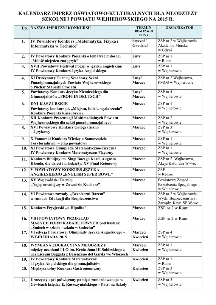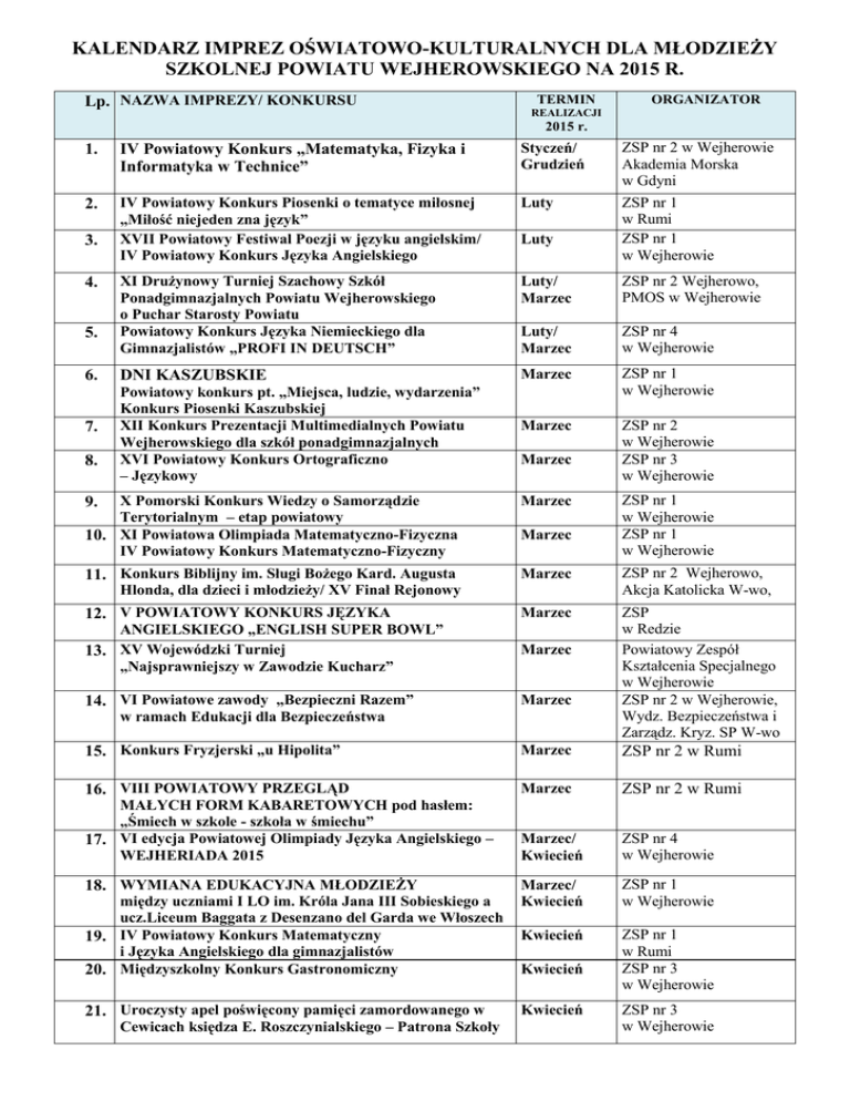 KALENDARZ IMPREZ OŚWIATOWO-KULTURALNYCH DLA MŁODZIEŻY SZKOLNEJ POWIATU WEJHEROWSKIEGO NA 2015 R. Lp. NAZWA IMPREZY/ KONKURSU TERMIN ORGANIZATOR REALIZACJI 2015 r. 1. IV Powiatowy Konkurs „Matematyka, Fizyka i Informatyka w Technice” Styczeń/ Grudzień 2. IV Powiatowy Konkurs Piosenki o tematyce miłosnej „Miłość niejeden zna język” XVII Powiatowy Festiwal Poezji w języku angielskim/ IV Powiatowy Konkurs Języka Angielskiego Luty XI Drużynowy Turniej Szachowy Szkół Ponadgimnazjalnych Powiatu Wejherowskiego o Puchar Starosty Powiatu Powiatowy Konkurs Języka Niemieckiego dla Gimnazjalistów „PROFI IN DEUTSCH” Luty/ Marzec ZSP nr 2 Wejherowo, PMOS w Wejherowie Luty/ Marzec ZSP nr 4 w Wejherowie 6. DNI KASZUBSKIE Marzec ZSP nr 1 w Wejherowie 7. Powiatowy konkurs pt. „Miejsca, ludzie, wydarzenia” Konkurs Piosenki Kaszubskiej XII Konkurs Prezentacji Multimedialnych Powiatu Wejherowskiego dla szkół ponadgimnazjalnych XVI Powiatowy Konkurs Ortograficzno – Językowy Marzec ZSP nr 2 w Wejherowie ZSP nr 3 w Wejherowie 3. 4. 5. 8. Luty Marzec ZSP nr 2 w Wejherowie Akademia Morska w Gdyni ZSP nr 1 w Rumi ZSP nr 1 w Wejherowie X Pomorski Konkurs Wiedzy o Samorządzie Terytorialnym – etap powiatowy 10. XI Powiatowa Olimpiada Matematyczno-Fizyczna IV Powiatowy Konkurs Matematyczno-Fizyczny Marzec 11. Konkurs Biblijny im. Sługi Bożego Kard. Augusta Marzec ZSP nr 2 Wejherowo, Akcja Katolicka W-wo, 12. V POWIATOWY KONKURS JĘZYKA Marzec ZSP w Redzie Powiatowy Zespół Kształcenia Specjalnego w Wejherowie ZSP nr 2 w Wejherowie, Wydz. Bezpieczeństwa i Zarządz. Kryz. SP W-wo 9. Marzec Hlonda, dla dzieci i młodzieży/ XV Finał Rejonowy ZSP nr 1 w Wejherowie ZSP nr 1 w Wejherowie ANGIELSKIEGO „ENGLISH SUPER BOWL” 13. XV Wojewódzki Turniej „Najsprawniejszy w Zawodzie Kucharz” Marzec 14. VI Powiatowe zawody „Bezpieczni Razem” Marzec 15. Konkurs Fryzjerski „u Hipolita” Marzec ZSP nr 2 w Rumi 16. VIII POWIATOWY PRZEGLĄD Marzec ZSP nr 2 w Rumi Marzec/ Kwiecień ZSP nr 4 w Wejherowie Marzec/ Kwiecień ZSP nr 1 w Wejherowie Kwiecień ZSP nr 1 w Rumi ZSP nr 3 w Wejherowie w ramach Edukacji dla Bezpieczeństwa MAŁYCH FORM KABARETOWYCH pod hasłem: „Śmiech w szkole - szkoła w śmiechu” 17. VI edycja Powiatowej Olimpiady Języka Angielskiego – WEJHERIADA 2015 18. WYMIANA EDUKACYJNA MŁODZIEŻY między uczniami I LO im. Króla Jana III Sobieskiego a ucz.Liceum Baggata z Desenzano del Garda we Włoszech 19. IV Powiatowy Konkurs Matematyczny i Języka Angielskiego dla gimnazjalistów 20. Międzyszkolny Konkurs Gastronomiczny 21. Uroczysty apel poświęcony pamięci zamordowanego w Cewicach księdza E. Roszczynialskiego – Patrona Szkoły Kwiecień Kwiecień ZSP nr 3 w Wejherowie 22. XVIII Wojewódzki Turniej Rozgrywek Umysłowych Kwiecień PZKS w Wejherowie „Zgaduj Zgadula” 23. Zawody sportowo-obronne na szczeblu wojewódzkim Kwiecień „Sprawni jak żołnierze - 2015” Kwiecień 24. Turniej Chemiczny – międzygimnazjalny turniej ZSP nr 2 w Wejherowie 25. II POWIATOWY DZIEŃ PROMOCJI PZSP im. Z. Kieturakisa w Wejherowie ZSP nr 4 w Wejherowie drużynowy ZDROWEGO STYLU ŻYCIA z okazji Światowego Dnia Zdrowia 26. II Międzyszkolny Konkurs Fotograficzny „FOTOGRAFIA JEST POEZJĄ, POEZJA JEST FOTOGRAFIĄ” 27. Powiatowy Konkurs Matematyczny Kwiecień Kwiecień ZSP nr 4 w Wejherowie Kwiecień/ Maj ZSP nr 3 w Wejherowie 28. XIII Wojewódzki Konkurs Rachunkowości Maj ZSP nr 3 w Wejherowie 29. VII Parada im. Jakuba Wejhera Maj ZSP nr 4 w Wejherowie 30. XVI Turniej – Jakub Wejher i Powiat Wejherowski – Maj ZSP nr 4 w Wejherowie 31. XIII EUROPEJSKIE SPOTKANIE Maj PZKS w Wejherowie Maj/ Czerwiec Maj ZSP nr 3 w Wejherowie ZSP nr 4 w Wejherowie 34. PIKNIK EDUKACYJNY Czerwiec PZKS w Wejherowie 35. POLSKO-NIEMIECKA WYMIANA MŁODZIEŻY Czerwiec / Wrzesień ZSP nr 1 w Wejherowie 36. Powiatowa Inauguracja Roku Szkolnego Wrzesień Starostwo Powiatowe 37. DZIEŃ TURYSTYKI REGIONALNEJ 2015 Październik Pałace i dwory Powiatu Wejherowskiego GIMNAZJALISTÓW z placówek kształcenia specjalnego województwa pomorskiego 32. Międzyszkolny Marsz na Orientację 33. Powiatowy konkurs matematyczno-geograficzny „Z Pitagorasem przez kontynenty” dla dzieci i młodzieży PZKS w Wejherowie między I LO im. Króla Jana III Sobieskiego a Realschule w Oelde Jednostka oświatowa prowadz. przez powiat Edycja wiosenna i jesienna 38. Dzień Edukacji Narodowej Październik Jednostka oświatowa prowadz. przez powiat 39. VII Powiatowy Konkurs Poświęcony Życiu Październik i Twórczości Papieża Jana Pawła II Październik 40. II Europejski Dzień Seniora w Powiatowym Zespole Szkół Policealnych w Wejherowie 41. X Ogólnopolski Przegląd Małych Form Teatralnych im.A. Październik Luterka (X OPMFT Luterek) pt.”Baśnie, mity i legendy” Październik 42. „Jak świętujesz Dzień Niepodległości” – VII Powiatowy Konkurs multimedialny z okazji Święta Niepodległości 43. VIII Powiatowy Konkurs Historyczny „Polska i Polacy w latach 1914-1939” 44. XVI Edycja Olimpiady Wiedzy o Kaszubach i Pomorzu ZSP nr 4 w Wejherowie Starostwo Powiatowe Listopad Listopad ZSP w Redzie PZSP im. Z. Kieturakisa w Wejherowie ZSP nr 1 w Wejherowie ZSP nr 2 w Wejherowie ZSP nr 2 w Wejherowie ZSP nr 1 w Rumi 45. VI Powiatowy Konkurs Poezji Śpiewanej Listopad/ Grudzień Listopad ZSP w Redzie PZKS w Wejherowie Powiatu Wejherowskiego „Kaszubiada 2015” 47. IV OGÓLNOPOLSKI KONKURS PLASTYCZNY dla uczniów szkół przyszpitalnych Listopad PZKS w Wejherowie 48. XV Mistrzostwa Wiedzy Komputerowej Szkół Grudzień ZSP nr 3 w Wejherowie 46. Integracyjne Spotkania Dzieci i Młodzieży Ponadgimnazjalnych Powiatu Wejherowskiego 49. Prezentacja Małych Form Teatralnych Grudzień o tematyce HIV/AIDS dla ucz. szkół ponadgimnazjalnych Grudzień 50. V Powiatowy Konkurs Wiedzy o Opozycji Antykomunistycznej w Polsce w latach 1944-1989 ZSP nr 2 w Rumi, PPIS w Wejherowie ZSP nr 4 w Wejherowie