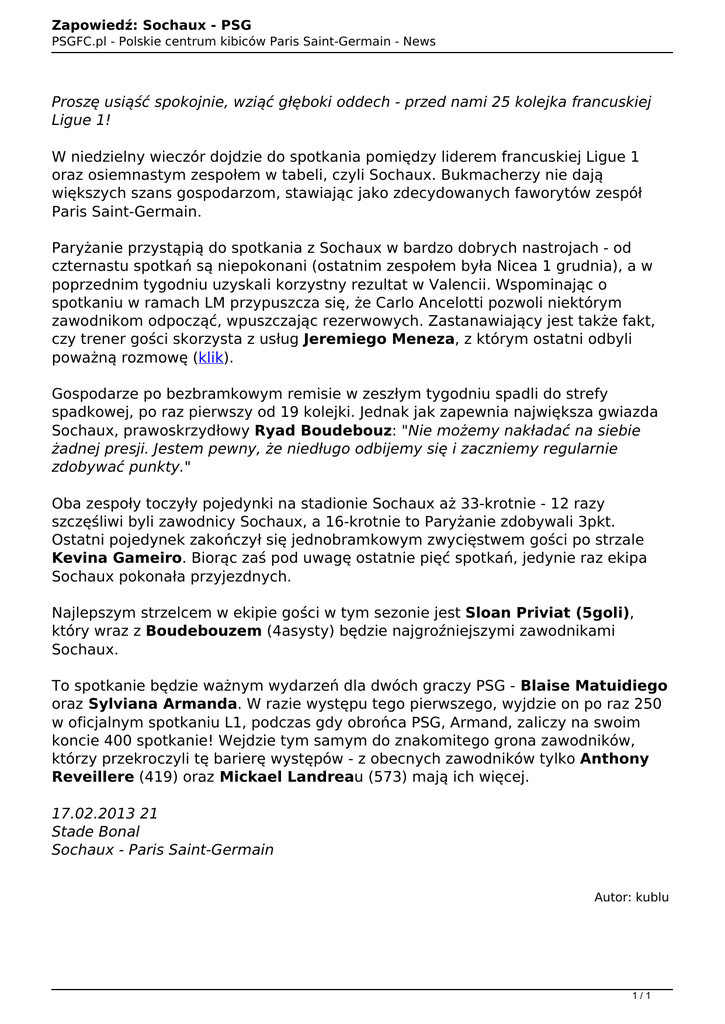 Zapowiedź: Sochaux - PSG PSGFC.pl - Polskie centrum kibiców Paris Saint-Germain - News Proszę usiąść spokojnie, wziąć głęboki oddech - przed nami 25 kolejka francuskiej Ligue 1! W niedzielny wieczór dojdzie do spotkania pomiędzy liderem francuskiej Ligue 1 oraz osiemnastym zespołem w tabeli, czyli Sochaux. Bukmacherzy nie dają większych szans gospodarzom, stawiając jako zdecydowanych faworytów zespół Paris Saint-Germain. Paryżanie przystąpią do spotkania z Sochaux w bardzo dobrych nastrojach - od czternastu spotkań są niepokonani (ostatnim zespołem była Nicea 1 grudnia), a w poprzednim tygodniu uzyskali korzystny rezultat w Valencii. Wspominając o spotkaniu w ramach LM przypuszcza się, że Carlo Ancelotti pozwoli niektórym zawodnikom odpocząć, wpuszczając rezerwowych. Zastanawiający jest także fakt, czy trener gości skorzysta z usług Jeremiego Meneza, z którym ostatni odbyli poważną rozmowę (klik). Gospodarze po bezbramkowym remisie w zeszłym tygodniu spadli do strefy spadkowej, po raz pierwszy od 19 kolejki. Jednak jak zapewnia największa gwiazda Sochaux, prawoskrzydłowy Ryad Boudebouz: "Nie możemy nakładać na siebie żadnej presji. Jestem pewny, że niedługo odbijemy się i zaczniemy regularnie zdobywać punkty." Oba zespoły toczyły pojedynki na stadionie Sochaux aż 33-krotnie - 12 razy szczęśliwi byli zawodnicy Sochaux, a 16-krotnie to Paryżanie zdobywali 3pkt. Ostatni pojedynek zakończył się jednobramkowym zwycięstwem gości po strzale Kevina Gameiro. Biorąc zaś pod uwagę ostatnie pięć spotkań, jedynie raz ekipa Sochaux pokonała przyjezdnych. Najlepszym strzelcem w ekipie gości w tym sezonie jest Sloan Priviat (5goli), który wraz z Boudebouzem (4asysty) będzie najgroźniejszymi zawodnikami Sochaux. To spotkanie będzie ważnym wydarzeń dla dwóch graczy PSG - Blaise Matuidiego oraz Sylviana Armanda. W razie występu tego pierwszego, wyjdzie on po raz 250 w oficjalnym spotkaniu L1, podczas gdy obrońca PSG, Armand, zaliczy na swoim koncie 400 spotkanie! Wejdzie tym samym do znakomitego grona zawodników, którzy przekroczyli tę barierę występów - z obecnych zawodników tylko Anthony Reveillere (419) oraz Mickael Landreau (573) mają ich więcej. 17.02.2013 21 Stade Bonal Sochaux - Paris Saint-Germain Autor: kublu 1/1 Powered by TCPDF (www.tcpdf.org)