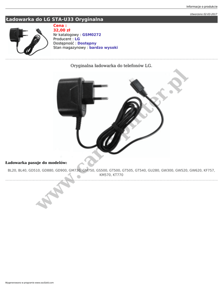 Informacje o produkcie Utworzono 02-03-2017 Ładowarka do LG STA-U33 Oryginalna Cena : 32,00 zł Nr katalogowy : GSM0272 Producent : LG Dostępność : Dostępny Stan magazynowy : bardzo wysoki w .c Ładowarka pasuje do modelów: ar d sp lit te r .p l Oryginalna ładowarka do telefonów LG. w w BL20, BL40, GD510, GD880, GD900, GM730, GM750, GS500, GT500, GT505, GT540, GU280, GW300, GW520, GW620, KF757, KM570, KT770 Wygenerowano w programie www.oscGold.com
