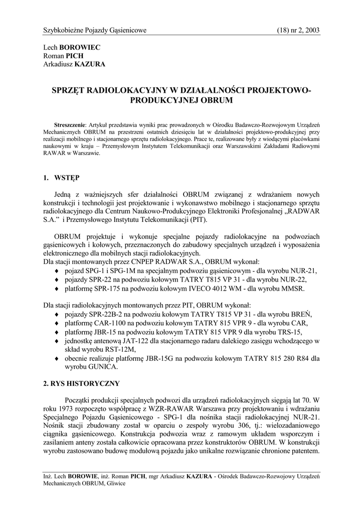 Szybkobieżne Pojazdy Gąsienicowe (18) nr 2, 2003 Lech BOROWIEC Roman PICH Arkadiusz KAZURA SPRZĘT RADIOLOKACYJNY W DZIAŁALNOŚCI PROJEKTOWOPRODUKCYJNEJ OBRUM Streszczenie: Artykuł przedstawia wyniki prac prowadzonych w Ośrodku Badawczo-Rozwojowym Urządzeń Mechanicznych OBRUM na przestrzeni ostatnich dziesięciu lat w działalności projektowo-produkcyjnej przy realizacji mobilnego i stacjonarnego sprzętu radiolokacyjnego. Prace te, realizowane były z wiodącymi placówkami naukowymi w kraju – Przemysłowym Instytutem Telekomunikacji oraz Warszawskimi Zakładami Radiowymi RAWAR w Warszawie. 1. WSTĘP Jedną z ważniejszych sfer działalności OBRUM związanej z wdrażaniem nowych konstrukcji i technologii jest projektowanie i wykonawstwo mobilnego i stacjonarnego sprzętu radiolokacyjnego dla Centrum Naukowo-Produkcyjnego Elektroniki Profesjonalnej „RADWAR S.A.” i Przemysłowego Instytutu Telekomunikacji (PIT). OBRUM projektuje i wykonuje specjalne pojazdy radiolokacyjne na podwoziach gąsienicowych i kołowych, przeznaczonych do zabudowy specjalnych urządzeń i wyposażenia elektronicznego dla mobilnych stacji radiolokacyjnych. Dla stacji montowanych przez CNPEP RADWAR S.A., OBRUM wykonał: pojazd SPG-1 i SPG-1M na specjalnym podwoziu gąsienicowym - dla wyrobu NUR-21, pojazdy SPR-22 na podwoziu kołowym TATRY T815 VP 31 - dla wyrobu NUR-22, platformę SPR-175 na podwoziu kołowym IVECO 4012 WM - dla wyrobu MMSR. Dla stacji radiolokacyjnych montowanych przez PIT, OBRUM wykonał: pojazdy SPR-22B-2 na podwoziu kołowym TATRY T815 VP 31 - dla wyrobu BREŃ, platformę CAR-1100 na podwoziu kołowym TATRY 815 VPR 9 - dla wyrobu CAR, platformę JBR-15 na podwoziu kołowym TATRY 815 VPR 9 dla wyrobu TRS-15, jednostkę antenową JAT-122 dla stacjonarnego radaru dalekiego zasięgu wchodzącego w skład wyrobu RST-12M, obecnie realizuje platformę JBR-15G na podwoziu kołowym TATRY 815 280 R84 dla wyrobu GUNICA. 2. RYS HISTORYCZNY Początki produkcji specjalnych podwozi dla urządzeń radiolokacyjnych sięgają lat 70. W roku 1973 rozpoczęto współpracę z WZR-RAWAR Warszawa przy projektowaniu i wdrażaniu Specjalnego Pojazdu Gąsienicowego - SPG-1 dla nośnika stacji radiolokacyjnej NUR-21. Nośnik stacji zbudowany został w oparciu o zespoły wyrobu 306, tj.: wielozadaniowego ciągnika gąsienicowego. Konstrukcja podwozia wraz z ramowym układem wsporczym i zasilaniem anteny została całkowicie opracowana przez konstruktorów OBRUM. W konstrukcji wyrobu zastosowano budowę modułową pojazdu jako unikalne rozwiązanie chronione patentem. Inż. Lech BOROWIE, inż. Roman PICH, mgr Arkadiusz KAZURA - Ośrodek Badawczo-Rozwojowy Urządzeń Mechanicznych OBRUM, Gliwice Lech BOROWIEC, Roman PICH, Arkadiusz KAZURA Kolejnym wyrobem realizowanym wspólnie z WZR-RAWAR był pojazd SPG-1M, jako nośnik stacji radiolokacyjnej NUR-21M dla kontrahenta zagranicznego. Zbudowany był w oparciu o zespoły przeniesienia napędu z czołgu T-72, zgodnie z życzeniem zamawiającego. Rys.1. Stacja radiolokacyjna NUR-21M na podwoziu gąsienicowym SPG-1M Ze względu na znaczne koszty wykonania specjalnego pojazdu gąsienicowego SPG-1, w roku 1989 rozpoczęto - wspólnie z WZR-RAWAR - prace projektowe nad Specjalnym Pojazdem Radiolokacyjnym SPR-22 na podwoziu kołowym, jako nośnika stacji radiolokacyjnej NUR-22. Pojazd SPR-22 przeznaczony był do zabudowy i transportu aparatury elektronicznej z anteną oraz jej zasilanie z własnych i zewnętrznych źródeł wysokiego napięcia. Pojazd składał się z czterech autonomicznych zespołów: podwozia T815 VP31 265 8x8.1R, nadwozia przeznaczonego do zabudowy aparatury elektronicznej, ramowego układu wsporczego (RUW) przeznaczonego do montażu anten, agregatów prądotwórczych o mocy 25 kVA (podstawowego i awaryjnego) do zasilania stacji. Sprzęt radiolokacyjny w działalności projektowo-produkcyjnej OBRUM Ponadto pojazd SPR-22 wyposażony został w kilka nowoczesnych urządzeń do pracy stacji: elektrohydrauliczny układ poziomowania (UAP-100), centralne zabezpieczenie upływowe (CZU), mierzące i stale wskazujące aktualną wartość izolacji sieci wysokiego napięcia, układ nawigacji zliczeniowej (UNZ-20), środki do łączności wewnętrznej (SOTAS) i zewnętrznej (RRC-9500). Rys.2. Specjalny Pojazd Radiolokacyjny – SPR-22 Pojazd SPR-22 został zbudowany na specjalnym podwoziu kołowym TATRY T815 VP31 produkowanym przez słowacką firmę TATRĘ SIPOX a.s. dla armato-haubic DANA i ZUZANA. Przystosowanie podwozi T815 VP31 dla potrzeb pojazdów SPR-22 wykonywał producent podwozi TATRA SIPOX a.s. na podstawie dokumentacji opracowanej przez Zakład Konstrukcji OBRUM. Podwozie T815 VP31 z pancerną kabiną kierowcy jest pojazdem czteroosiowym terenowym z napędem na wszystkie osie, o całkowitej nośności do 32 t. Wyposażone w silnik wysokoprężny wielopaliwowy o mocy 265 kW, chłodzony powietrzem, posiada układ centralnego pompowania ogumienia na postoju i podczas jazdy. Układ napędowy podwozia umożliwia poruszanie się pojazdem z prędkością od 3,6 km/h do 40 km/h w terenie i do 90 km/h po drogach asfaltowych. Zastosowanie podwozia kołowego pozwoliło na obniżenie kosztów produkcji pojazdów dla nośników stacji o około 30%. Lech BOROWIEC, Roman PICH, Arkadiusz KAZURA 3. MODERNIZACJA SPECJALNEGO POJAZDU RADIOLOKACYJNEGO SPR-22 W 1996 roku OBRUM rozpoczął współpracę przy projektowaniu i wykonawstwie podwozi dla stacji radiolokacyjnych produkowanych przez PIT. Pierwszym pojazdem wykonywanym dla PIT był opracowany dla stacji MUR-20 pojazd SPR-22B. Pojazdy SPR-22B i SPR-22 w zakresie podwozi T815 VP31 i głównych zespołów nie różniły się między sobą. Różnice wystąpiły tylko w niektórych zespołach i wyposażeniu elektronicznym wynikającym z innego przeznaczenia wyrobów. Kabina kierowcy w przystosowanych podwoziach T815 VP31 nie w pełni odpowiadała warunkom pracy załogi, zwłaszcza dla pojazdów radiolokacyjnych. W ce