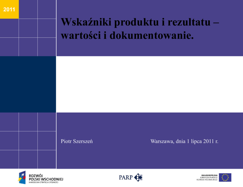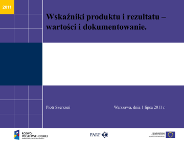 2011 Wskaźniki produktu i rezultatu – wartości i dokumentowanie. Piotr Szerszeń Warszawa, dnia 1 lipca 2011 r. Miejscowość, data Co to jest KSI? KSI (SIMIK 07-13) – Krajowy System Informatyczny (SIMIK 07-13) Umożliwienie gromadzenia danych w zakresie: Obsługi cyklu życia projektu Ewidencji danych dotyczących programów operacyjnych Prowadzeniu rejestru kwot podlegających procedurze odzyskiwania, kwot odzyskanych i kwot wycofanych (tzw. rejestr obciążeń na projekcie) Miejscowość, data Skąd się wzięły wskaźniki? Konieczność monitorowania najważniejszych efektów wdrażania funduszy UE w systemie KSI (SIMIK 07-13) Wprowadzenie ograniczonej listy wskaźników kluczowych Miejscowość, data Gdzie szukać wskaźników? „Wytyczne w zakresie warunków gromadzenia i przekazywania danych w formie elektronicznej”, Warszawa 9 lutego 2010 r. Załącznik nr 3 „Lista wskaźników kluczowych przechowywanych w Krajowym Systemie Informatycznym (SIMIK 07-13)” Miejscowość, data Od czego zależą rodzaje wskaźników? Powiązanie z kodami klasyfikacji funduszy na lata 2007-2013 wg kryterium priorytetowych obszarów tematycznych Zależność od wydzielonych na potrzeby krajowe typów projektów, realizowanych w ramach danego kodu klasyfikacji Miejscowość, data Jak dobrać wskaźniki? Nr kat. int. Nazwa kategorii interwencj i Kod typu Projektów Nazwa typu projektów Kod wskaźnika produktu Nazwa wskaźnika produktu j.m. Kod wskaźnika rezultatu Nazwa wskaźnika rezultatu j.m. 75 Infrastruktura systemu oświaty 75.1 Budowa/ Przebudowa obiektów infrastruktury szkolnictwa wyższego/ pozostałych szkół P.75.1.1 Liczba wybudowanych obiektów infrastruktury szkół wyższych/ szkół Szt. R.75.1.1 Liczba uczniów korzystających z infrastruktury wspartej w wyniku realizacji projektów osoby P.75.1.2 Liczba obiektów infrastruktury szkół wyższych/ szkół zapewniających dostęp dla osób niepełnosprawnych Szt. R.75.1.2 osoby P.75.1.3 Liczba przebudowanych obiektów infrastruktury szkół wyższych/ szkół Szt. Liczba studentów korzystających z infrastruktury wspartej w wyniku realizacji projektów P.75.2.1 Liczba szkół wyższych doposażonych w aparaturę naukowobadawczą na potrzeby dydaktyki Szt. R.75.2.1 Liczba studentów korzystających z infrastruktury dydaktycznej wspartej w wyniku realizacji projektów osoby P.75.2.2 Liczba szkół doposażonych w sprzęt na potrzeby dydaktyki Szt. R.75.2.2 Liczba uczniów korzystających z infrastruktury dydaktycznej wspartej w wyniku realizacji projektów osoby 75.2 Wyposażenie w aparaturę naukowobadawczą na potrzeby dydaktyki Miejscowość, data Jak dobrać wskaźniki? Należy zamieścić wybrane wskaźniki produktów i rezultatów Obligatoryjne jest korzystanie ze wskaźników kluczowych z listy wskaźników zaimplementowanej do KSI (SIMIK 07-13) zgodnie z kategorią interwencji Jeżeli ze względu na specyfikę projektu nie jest możliwe przypisanie żadnego wskaźnika z listy wskaźników kluczowych beneficjent sprawozdaje na podstawie wskaźników zaproponowanych przez siebie, zadeklarowanych w dokumentacji projektu, jednakże dane te nie są wprowadzane do KSI (SIMIK 07-13) Miejscowość, data Jak dobrać wskaźniki? Produkty są to dobra materialne i efekty usług osiągane przez Beneficjenta w wyniku realizacji projektów, mierzone w jednostkach rzeczowych lub monetarnych. Rezultaty odnoszą się do bezpośrednich i natychmiastowych efektów Programu dla bezpośrednich odbiorców. Dostarczają informacji na temat zmian m. in. w zachowaniu, potencjale lub działalności odbiorców. Ich osiągnięcie będzie weryfikowane po zakończeniu realizacji projektu, a ich utrzymanie będzie konieczne przez okres pięciu lat od momentu zakończenia jego realizacji. Miejscowość, data Jak dobrać wskaźniki? WSKAŹNIKI HOTYZONTALNE Kod wskaźnika produktu TWORZENIE P.100 NOWYCH MIEJSC PRACY Nazwa wskaźnika produktu j.m. Kod wskaźnika rezultatu Nazwa wskaźnika rezultatu j.m. Liczba bezpośrednio utworzonych nowych etatów (EPC) Szt. R.100 Przewidywana całkowita liczba bezpośrednio utworzonych nowych etatów(EPC) Szt. R.101 Liczba utworzonych nowych etatów badawczych (kat. 15,7) Szt. Miejscowość, data Jak określić wartości wskaźników horyzontalnych? Do każdego projektu beneficjent powinien złożyć deklarację odnośnie stworzonych nowych miejsc pracy Obliczając wartość wskaźnika należy brać pod uwagę pracowników zatrudnionych na podstawie umowy o pracę (umowy o dzieło i umowy zlecenia nie liczą się) Liczba pracowników wykazywana jest w ekwiwalencie pełnego czasu pracy (ECP), przy czym etaty częściowe podlegają sumowaniu, lecz nie są zaokrąglane do pełnych jednostek Miejscowość, data Jak określić wartości wskaźników horyzontalnych? Oddelegowanie własnego pracownika w pełnym zakresie lub w części etatu do zadań związanych z realizacją projektu w rozumieniu definicji wskaźników horyzontalnych powoduje powstanie nowego etatu i konieczność jego wykazania Jeżeli beneficjent nie przewiduje powstania nowych miejsc pracy podczas realizacji projektu lub też do 12 miesięcy po jej zakończeniu należy przedstawić wskaźniki horyzontalne z wartością „0” Miejscowość, data Wskaźniki horyzontalne – produkt czy rezultat? Wskaźnik produktu występuje jeżeli koszty związane z utworzeniem nowego miejsca pracy zostały pokryte ze środków funduszy unijnych oraz gdy miejsce pracy zostało utworzone w trakcie realizacji projektu Wskaźnik rezultatu występuje jeżeli nowe miejsca pracy zostały utworzone bezpośrednio w efekcie realizacji projektu i nie spełniają łącznie warunków określonych dla zakwalifikowania ich jako wskaźnik produktu i jednocześnie powstały najpóźniej do końca fazy operacyjnej projektu, tj. do 12 miesięcy od momentu złożenia wniosku beneficjenta o płatność końcową) Miejscowość, data Wskaźniki horyzontalne – trwałość Trwałość