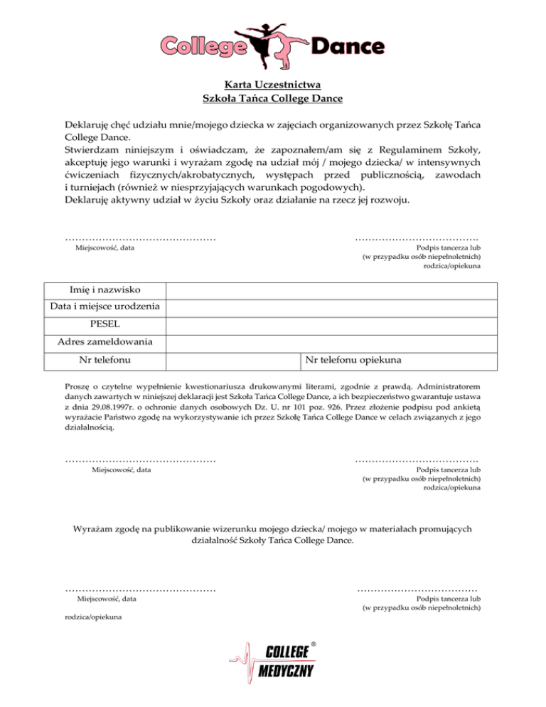 Karta Uczestnictwa Szkoła Tańca College Dance