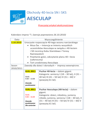 Obchody 40-lecia SN i SKS AESCULAP Przeczytaj artykuł okolicznościowy Kalendarz imprez *) (wersja poprawiona 26.10.2010) Data 3.10.2010 Sezon 2010/2011 Wyszczególnienie Uroczyste rozpoczęcie 40-tego sezonu narciarskiego Msza Św. – Intencja w imieniu wszystkich uczestników Aesculapa w związku z 40-leciem i 58 rocznicą ślubu Stanisława i Teresy Rażniewskich Powitanie gości, odczytanie planu 40—lecia (całoroczny) Tort urodzinowy Aesculapa Zawody dla dzieci i dorosłych – imprezy wewnętrzne. 8.01.2011 Godz. 9.00 – 13.00 Puchar 40-lecia – slalom gigant. Kategorie: seniorzy I (18 – 30 lat), II (31 – 40 lat) III (41 – 50 lat) IV (51 – 60) V (powyżej 61 lat). Zawody punktowane 9.01.2011 Godz. 9.00 – 16.00 Zawody punktowane dla seniorów Puchar Aesculapa (40-lecia) – slalom gigant. Kategorie: dzieci, młodzicy, juniorzy młodsi, juniorzy, seniorzy I (18 – 30 lat), II (31 – 40 lat) III (41 – 50 lat) IV (51 – 60) V (powyżej 61 lat). 16.01.2011 Puchar Łysej Góry – slalom gigant. Kategorie: dzieci, młodzicy, juniorzy Godz. młodsi, juniorzy. 9.00 – 13.00 23.01.2011 Puchar Teresy i Stanisława Rażniewskich – slalom gigant. Godz. Kategorie: dzieci, młodzicy, juniorzy 9.00 – 13.00 młodsi, juniorzy. 6.02.2011 Godz. 9.00 – 13.00 Zawody punktowane Puchar 40-lecia– slalom gigant. Kategorie: seniorzy I (18 – 30 lat), II (31 – 40 lat) III (41 – 50 lat) IV (51 – 60) V (powyżej 61 lat). Regulamin | Newsy Podsumowanie cyklu zawodów 40-lecia. 6.03.2011 Skrzat i Zawody Rodzinne – Startują aktualni uczestnicy i członkowie szkoły. Kategorie: dzieci, młodzicy, juniorzy młodsi, juniorzy + łączna punktacja rodzin. 13.03.2011 Maskarada 40-lecia - dla wszystkich. 24.04.2011 Uroczyste zakooczenie 40-tego roku szkolnego Aesculapa 12.06.2011 Impreza letnia – NIESPODZIANKA *) Terminy mogą ulec zmianie Powrót na stronę główną