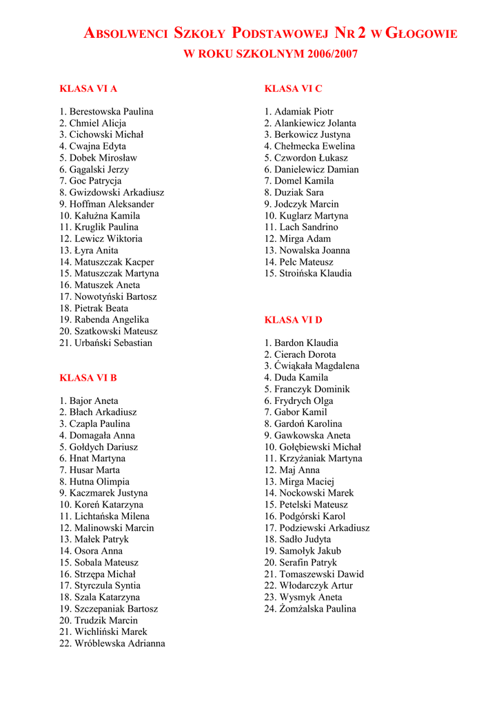 ABSOLWENCI SZKOŁY PODSTAWOWEJ NR 2 W GŁOGOWIE W ROKU SZKOLNYM 2006/2007 KLASA VI A KLASA VI C 1. Berestowska Paulina 2. Chmiel Alicja 3. Cichowski Michał 4. Cwajna Edyta 5. Dobek Mirosław 6. Gągalski Jerzy 7. Goc Patrycja 8. Gwizdowski Arkadiusz 9. Hoffman Aleksander 10. KałuŜna Kamila 11. Kruglik Paulina 12. Lewicz Wiktoria 13. Łyra Anita 14. Matuszczak Kacper 15. Matuszczak Martyna 16. Matuszek Aneta 17. Nowotyński Bartosz 18. Pietrak Beata 19. Rabenda Angelika 20. Szatkowski Mateusz 21. Urbański Sebastian 1. Adamiak Piotr 2. Alankiewicz Jolanta 3. Berkowicz Justyna 4. Chełmecka Ewelina 5. Czwordon Łukasz 6. Danielewicz Damian 7. Domel Kamila 8. Duziak Sara 9. Jodczyk Marcin 10. Kuglarz Martyna 11. Lach Sandrino 12. Mirga Adam 13. Nowalska Joanna 14. Pelc Mateusz 15. Stroińska Klaudia KLASA VI B 1. Bajor Aneta 2. Błach Arkadiusz 3. Czapla Paulina 4. Domagała Anna 5. Gołdych Dariusz 6. Hnat Martyna 7. Husar Marta 8. Hutna Olimpia 9. Kaczmarek Justyna 10. Koreń Katarzyna 11. Lichtańska Milena 12. Malinowski Marcin 13. Małek Patryk 14. Osora Anna 15. Sobala Mateusz 16. Strzępa Michał 17. Styrczula Syntia 18. Szala Katarzyna 19. Szczepaniak Bartosz 20. Trudzik Marcin 21. Wichliński Marek 22. Wróblewska Adrianna KLASA VI D 1. Bardon Klaudia 2. Cierach Dorota 3. Ćwiąkała Magdalena 4. Duda Kamila 5. Franczyk Dominik 6. Frydrych Olga 7. Gabor Kamil 8. Gardoń Karolina 9. Gawkowska Aneta 10. Gołębiewski Michał 11. KrzyŜaniak Martyna 12. Maj Anna 13. Mirga Maciej 14. Nockowski Marek 15. Petelski Mateusz 16. Podgórski Karol 17. Podziewski Arkadiusz 18. Sadło Judyta 19. Samołyk Jakub 20. Serafin Patryk 21. Tomaszewski Dawid 22. Włodarczyk Artur 23. Wysmyk Aneta 24. śomŜalska Paulina