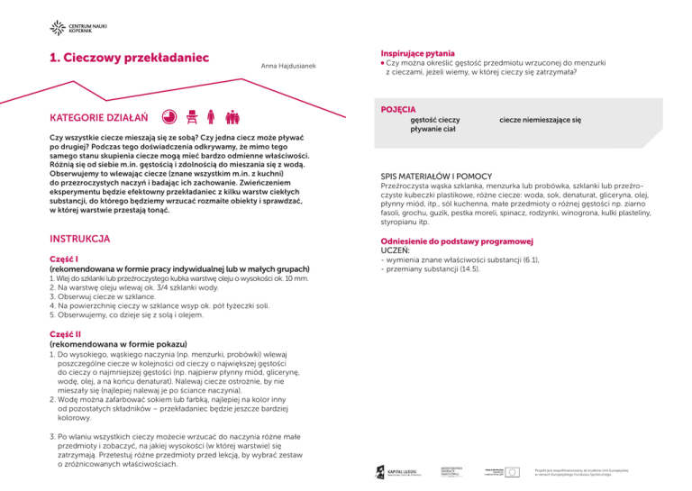 1. Cieczowy przekładaniec Inspirujące pytania zy można określić gęstość przedmiotu wrzuconej do menzurki C z cieczami, jeżeli wiemy, w której cieczy się zatrzymała? Anna Hajdusianek KATEGORIE DZIAŁAŃ POJĘCIA Czy wszystkie ciecze mieszają się ze sobą? Czy jedna ciecz może pływać po drugiej? Podczas tego doświadczenia odkrywamy, że mimo tego samego stanu skupienia ciecze mogą mieć bardzo odmienne właściwości. Różnią się od siebie m.in. gęstością i zdolnością do mieszania się z wodą. Obserwujemy to wlewając ciecze (znane wszystkim m.in. z kuchni) do przezroczystych naczyń i badając ich zachowanie. Zwieńczeniem eksperymentu będzie efektowny przekładaniec z kilku warstw ciekłych substancji, do którego będziemy wrzucać rozmaite obiekty i sprawdzać, w której warstwie przestają tonąć. INSTRUKCJA Część I (rekomendowana w formie pracy indywidualnej lub w małych grupach) gęstość cieczy pływanie ciał ciecze niemieszające się SPIS MATERIAŁÓW I POMOCY Przeźroczysta wąska szklanka, menzurka lub probówka, szklanki lub przeźroczyste kubeczki plastikowe, różne ciecze: woda, sok, denaturat, gliceryna, olej, płynny miód, itp., sól kuchenna, małe przedmioty o różnej gęstości np. ziarno fasoli, grochu, guzik, pestka moreli, spinacz, rodzynki, winogrona, kulki plasteliny, styropianu itp. Odniesienie do podstawy programowej UCZEŃ: - wymienia znane właściwości substancji (6.1), - przemiany substancji (14.5). 1. Wlej do szklanki lub przeźroczystego kubka warstwę oleju o wysokości ok. 10 mm. 2. Na warstwę oleju wlewaj ok. 3/4 szklanki wody. 3. Obserwuj ciecze w szklance. 4. Na powierzchnię cieczy w szklance wsyp ok. pół łyżeczki soli. 5. Obserwujemy, co dzieje się z solą i olejem. Część II (rekomendowana w formie pokazu) 1. Do wysokiego, wąskiego naczynia (np. menzurki, probówki) wlewaj poszczególne ciecze w kolejności od cieczy o największej gęstości do cieczy o najmniejszej gęstości (np. najpierw płynny miód, glicerynę, wodę, olej, a na końcu denaturat). Nalewaj ciecze ostrożnie, by nie mieszały się (najlepiej nalewaj je po ściance naczynia). 2. W odę można zafarbować sokiem lub farbką, najlepiej na kolor inny od pozostałych składników – przekładaniec będzie jeszcze bardziej kolorowy. 3. Po wlaniu wszystkich cieczy możecie wrzucać do naczynia różne małe przedmioty i zobaczyć, na jakiej wysokości (w której warstwie) się zatrzymają. Przetestuj różne przedmioty przed lekcją, by wybrać zestaw o zróżnicowanych właściwościach. Projekt jest współfinansowany ze środków Unii Europejskiej w ramach Europejskiego Funduszu Społecznego.