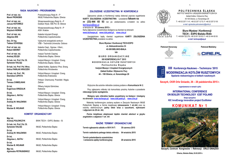 -5- -6- RADA R NAUKOWO – PROGRAMOWA P ZGŁOSZENIE UCZESTNICTWA W KONFERENCJI Prof. dr hab. inż.. Marek PRONOBIIS Przeewodniczący Rady N – P IMiU UE Politechnika Śląska. Gliwice Prof. dr hab. inż.. Janusz KOTOWICZ Wiceeprzewodniczący Rady N – P Dzieekan Wydz. IŚiE Pol. Śl. Glliwice Prof. dr hab. inż.. Wojciech NOWA AK Wiceeprzewodniczący Rady N – P AGH H. Kraków Prof. dr hab. inż.. Zbigniew BIS Kateedra Inżynierii Energii, Polittechnika Częstochowska Doc. Dr Ing. Tadeas OCHODE EK Výzkkumné energetické centrum m VŠB B – Technická Univerzita. O Ostrava Prof. dr hab. inż.. Robert SEKRET Kateedra Ciepł., Ogrzew. i Went., Polittechnika Częstochowska Prof. dr hab. inż.. Andrzej SZLĘK Instyytut Techniki Cieplnej Polittechnika Śląska. Gliwice Dr hab. inż. Prof. Pol. Śl. Sylwester KALIS SZ Instyytut Maszyn i Urządzeń Ennerg. Polittechnika Śląska. Gliwice Dr hab. inż. Prof. Pol. Wroc. Halina PAWLAK KRUCZEK Zakłład Kotłów, Spalania i Procc. Energ. Polittechnika Wrocławska Dr hab. inż. Prof. PK. Stanisław ŁOPAT TA Instyytut Maszyn i Urządzeń Ennerg. Polittechnika Krakowska Dr inż. LNIAK Tomasz CHMIEL Instyytut Chemicznej Przeróbkki Węgla. Zabrrze Dr inż. ZULIK Eugeniusz ORSZ Głów wny Instytut Górnictwa. Katoowice Dr inż. TAJ Zbigniew L. RAT Instyytut Maszyn i Urządzeń Ennerg. Polittechnika Śląska. Gliwice Dr inż. Andrzej W. WALEWSKI Instyytut Maszyn i Urządzeń Ennerg. Polittechnika Śląska. Gliwice Dr inż. NAR Wacław B. WOJN Instyytut Maszyn i Urządzeń Ennerg. Polittechnika Śląska. Gliwice KOMITET ORGAN NIZACYJNY 1- Zgłoszenia udziału w Konferencji należy dokkonać poprzez wypełnieniee KARTY ZGŁOSZENIA UCZESTNICTWA U i przessłanie faksem na nr (33) 444 65 93 lub po zeskanowanniu e-mailem na adres [email protected] POLITECHNIKA ŚLĄSKA INSTYTUT M MASZYN I URZĄDZEŃ ENER RGETYCZNYCH Zakład Kotłów i Wytwornic Paary 444-100 Gliwice, ul. Konarskiego 20 T: +48 32 2377 11 41, +48 32 237 12 73; F: +48 + 32 237 21 93 e-m mail: [email protected] w terminie do 30 czerwcca 2015 r. Karty Zgłoszenia Uczestnictwa dostępne są równieżż na stronach w.icbt.polsl.pl , www.ciree.pl www.techexpo.pl, www Uwzględniane będdą również wypełnione KARTY ZGŁOSZENIA A UCZESTNICTWA przesłaane na adres: Biuro o Wystaw i Konferencji TECH-EXPO T ul. Aleksandrowicka 33 AŁA 43-300 BIELSKO-BIA lub Biuuro Wystaw i Konferrencji TECH – EXPO Bielsko Biała T: +48 604 7222 279, +48 33 811 50 00; F: +48 + 33 444 65 93 e-mail: [email protected] Patro onat Honorowy Patron nat Medialny BIURO ORGANIZACYJNE XIII KONFERENCJI N-T ’20015 MODERNIZACJA KOTŁÓW RUSZTOWYCH Politechnika Śląska Instytut Maszyn M i Urządzeń Energ getycznych Zakkład Kotłów i Wytwornic Pary 44 – 100 1 Gliwice, ul. Konarskieego 20 XIII Konferencjaa Naukowo – Techniczna ’2015 MODERNIZACJJA KOTŁÓW RUS SZTOWYCH Spalanie niskoemisyjne w kotłach ru usztowych Szczzyrk, CKiR Orle Gniaazdo, 26 – 28 paździeernika 2015 r. Wytyczne dla autoróów referatów zostaną podaane w Komunikacie Nr 2. Przy zgłaszaniu refferatu lub komunikatu prosimy Autorów o przesłaniee roboczego tytułu wystąp pienia. Wstępny spis refeeratów będzie uzupełnian ny na bieżąco i dostępnyy na stronach: www.techeexpo.pl, www.icbt.polsl.p pl , www.cire.pl Materiały konferencyyjne zostaną wydane w Zeszycie Z Naukowym IMiUE E Politechniki Śląskiej w foormie książkowej (streszcczenie 1 str.A4) oraz naa nośniku elektronicznym (pełny tekst wraz z rysunkami, wykresam mi i zdjęciami do 20 str. A4). organizow wana w ramach cyklu INTERNATIO ONAL CONFERENCE E ON BOILER TECH HNOLOGY ICBT PO OLAND Seesja specjalna: KIC InnoEnergy innnovation project EcoS Stoker KOMUNIKAT Nr 1 wnież abstract w języku u Forma książkowa obejmować będzie rów angielskim o objętości 1 str. A4. Mgr inż. CZYK Andrzej POLEWC BWiK TECH T – EXPO, Bielsko – B B. Dr hab. inż. Prof. Pol. Śl. SZ Sylwester KALIS IMiUE,, Politechnika Śląska Termin zgłoszenia udziaału w XIII K N-T: Dr inż. Andrzej W. WALEWSKI IMiUE,, Politechnika Śląska Termin nadesłania pełneego tekstu referatu: 04 września 2015 Dr inż. TAJ Zbigniew L. RAT IMiUE,, Politechnika Śląska Termin potwierdzenia ucczestnictwa i wniesienia opłaty konfferencyjnej: Dr inż. NAR Wacław B. WOJN IMiUE,, Politechnika Śląska Mgr inż. RUSIEWICZ Agnieszka PETR IMiUE,, Politechnika Śląska WAŻNE E TERMINY ORGANIZ ZACYJNE 30 czerwca 2015 26 września 2015 Szczzyrk, Centrum Kongreesów i Rekreacji OR RLE GNIAZDO Gliwice, Bieelsko Biała, 03.03.2015 r. -2- -3- -4- UCZESTNICY KONFERENCJI PROMOCJA Konferencja skierowana jest do kadry inżynieryjno-technicznej oraz specjalistów zakładów eksploatujących urządzenia kotłowe: Zapraszamy producentów, dystrybutorów, biura projektowe do udziału w Wystawie Problemowej Konferencji. Proponujemy stoiska wystawowe zbudowane w systemie Octanorm oraz plansze posterowe do prezentacji materiałów tekstowych. Koszt powierzchni wystawowej z wyposażeniem standardowym wynosi 250 zł/m2 + 23% VAT, natomiast koszt planszy posterowej o wymiarach 95 x 140 cm wynosi 150 zł/planszę + 23%VAT. W ramach opłaty za stoisko wystawiennicze (min. 4 m2) proponujemy 10 min. wystąpienie promocyjne Proponujemy wystąpienie w specjalnie przygotowanym bloku promocyjnym: 15 min. za 750 zł + 23%VAT Szanowni Państwo Biuro Wystaw i Konferencji TECH – EXPO Bielsko – Biała – jako organizator główny i współorganizator: Instytut Maszyn i Urządzeń Energetycznych, Zakład Kotłów i Wytwornic Pary Politechniki Śląskiej, sprawujący nadzór merytoryczny nad konferencją, mają zaszczyt zaprosić na kolejną: • odpowiedzialnych za ochronę środowiska w elektrociepłowniach i ciepłowniach komunalnych • zajmujących się eksploatacją i remontami w ciepłownictwie i energetyce przemysłowej • odpowiedzialnych za inwestycje i modernizacje urządzeń energetycznych XIII Konferencję Naukowo - Techniczną ’2