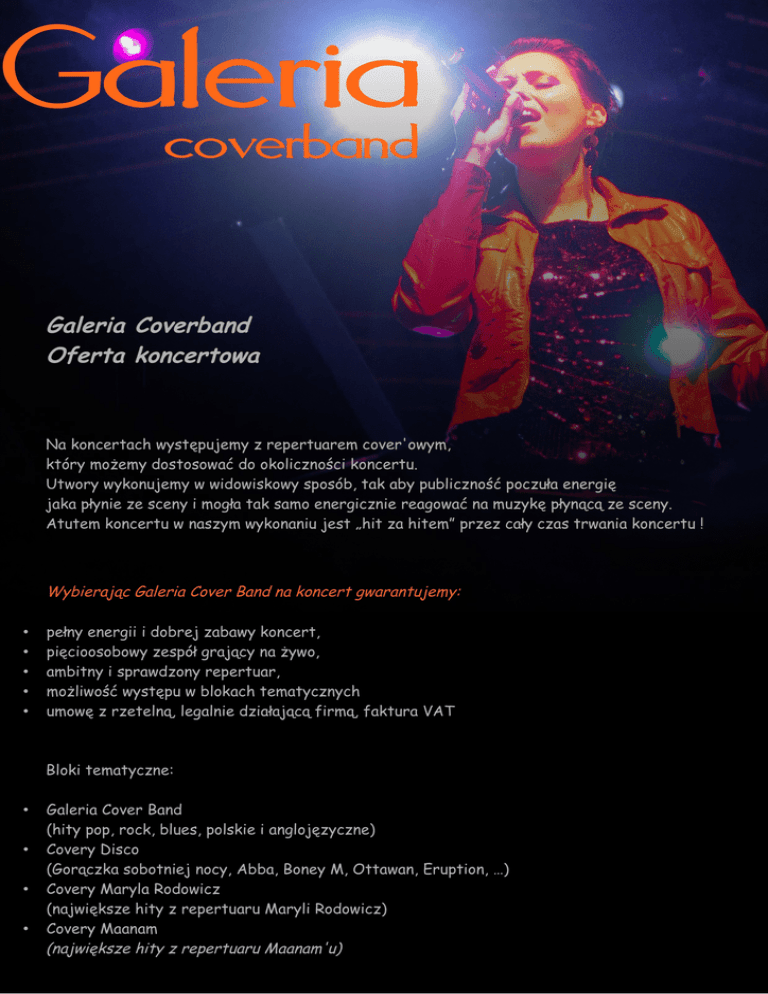Galeria Coverband Oferta koncertowa Na koncertach występujemy z repertuarem cover'owym, który możemy dostosować do okoliczności koncertu. Utwory wykonujemy w widowiskowy sposób, tak aby publiczność poczuła energię jaka płynie ze sceny i mogła tak samo energicznie reagować na muzykę płynącą ze sceny. Atutem koncertu w naszym wykonaniu jest „hit za hitem” przez cały czas trwania koncertu ! Wybierając Galeria Cover Band na koncert gwarantujemy: • • • • • pełny energii i dobrej zabawy koncert, pięcioosobowy zespół grający na żywo, ambitny i sprawdzony repertuar, możliwość występu w blokach tematycznych umowę z rzetelną, legalnie działającą firmą, faktura VAT Bloki tematyczne: • • • • Galeria Cover Band (hity pop, rock, blues, polskie i anglojęzyczne) Covery Disco (Gorączka sobotniej nocy, Abba, Boney M, Ottawan, Eruption, …) Covery Maryla Rodowicz (największe hity z repertuaru Maryli Rodowicz) Covery Maanam (największe hity z repertuaru Maanam'u) Docieramy w każdy zakątek naszego kraju, jeżeli chcesz abyśmy wystąpili w Warszawie, Gdańsku, Wrocławiu, Białymstoku czy Krakowie – nie stanowi to dla nas problemu. - posiadamy własnego realizatora FOH - możemy wypożyczyć nagłośnienie i oświetlenie potrzebne na twój koncert i udostępnić innym artystom - przy dużych odległościach dojazdu prosimy o zapewnienie opłaconego noclegu dla członków zespołu + ekipa techniczna, jeżeli organizacja noclegu należy do zespołu będzie doliczona dodatkowa opłata (sprawy dotyczące noclegu ustalamy indywidualnie). - warunki techniczne potrzebne do wykonania koncertu zawarte są w naszym riderze (pobierz) Koncertowaniem w obecnym składzie zajmujemy się od 2001 roku, a więc jeżeli mają Państwo jakiekolwiek pytania co do organizacji koncertu nie tylko od strony muzycznej, proszę śmiało pytać. Management: Grzegorz Kopeć tel. +48 606832703 [email protected] http://galeria-tbg.pl
