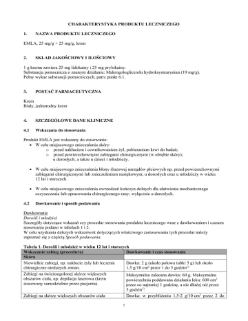 CHARAKTERYSTYKA PRODUKTU LECZNICZEGO 1. NAZWA PRODUKTU LECZNICZEGO EMLA, 25 mg/g + 25 mg/g, krem 2. SKŁAD JAKOŚCIOWY I ILOŚCIOWY 1 g kremu zawiera 25 mg lidokainy i 25 mg prylokainy. Substancja pomocnicza o znanym działaniu: Makrogologlicerolu hydroksystearynian (19 mg/g). Pełny wykaz substancji pomocniczych, patrz punkt 6.1. 3. POSTAĆ FARMACEUTYCZNA Krem Biały, jednorodny krem 4. SZCZEGÓŁOWE DANE KLINICZNE 4.1 Wskazania do stosowania Produkt EMLA jest wskazany do stosowania: W celu miejscowego znieczulenia skóry: o przed nakłuciem i cewnikowaniem żył, pobieraniem krwi do badań; o przed powierzchownymi zabiegami chirurgicznymi (w obrębie skóry); u dorosłych, a także u dzieci i młodzieży. W celu miejscowego znieczulenia błony śluzowej narządów płciowych np. przed powierzchownymi zabiegami chirurgicznymi lub znieczuleniem nasiękowym; u dorosłych oraz u młodzieży w wieku 12 lat i starszych. W celu miejscowego znieczulenia owrzodzeń kończyn dolnych dla ułatwienia mechanicznego oczyszczenia lub opracowania chirurgicznego rany; wyłącznie u dorosłych. 4.2 Dawkowanie i sposób podawania Dawkowanie Dorośli i młodzież Szczegóły dotyczące wskazań czy procedur stosowania produktu leczniczego wraz z dawkowaniem i czasem stosowania podano w tabelach 1 i 2. W celu uzyskania dalszych wskazówek dotyczących właściwego zastosowania tych procedur należy zapoznać się z częścią Sposób podawania. Tabela 1. Dorośli i młodzież w wieku 12 lat i starszych Wskazanie/zabieg (procedura) Dawkowanie i czas stosowania Skóra Niewielkie zabiegi, np. nakłucie żyły lub leczenie Dawka: 2 g (około połowa tubki 5 g) lub około chirurgiczne niedużych zmian. 1,5 g/10 cm2 przez 1 do 5 godzin1) Zabiegi na świeżoogolonej skórze większych Maksymalna zalecana dawka: 60 g. Maksymalna obszarów ciała, np. depilacja laserowa (krem powierzchnia poddawana działaniu leku: 600 cm2 stosowany samodzielnie przez pacjenta). przez co najmniej 1 godzinę, a nie dłużej niż przez 5 godzin1). Zabiegi na skórze większych obszarów ciała Dawka: w przybliżeniu 1,5-2 g/10 cm2 przez 2 do 1 5 godzin1). w warunkach szpitalnych, np. pobieranie przeszczepu skórnego pośredniej grubości. Skóra męskich narządów płciowych Przed iniekcją środków miejscowo znieczulających. Skóra żeńskich narządów płciowych Przed iniekcją środków miejscowo znieczulających2). Śluzówka narządów płciowych Chirurgiczne leczenie zlokalizowanych zmian, np. wycięcie kłykcin kończystych oraz przed iniekcją leków miejscowo znieczulających. Przed wykonaniem łyżeczkowania kanału szyjki macicy. Dawka: 1 g/10 cm2 przez 15 minut Dawka: 1-2 g/10 cm2 przez 60 minut Dawka: około 5-10 g kremu przez 5-10 minut1) 3) 4). 10 g kremu należy nałożyć w bocznych sklepieniach pochwy na 10 minut. Owrzodzenia kończyn dolnych Tylko u dorosłych Dawka: około 1-2 g/10 cm2 do dawki maksymalnej 10 g na owrzodzenie(a) kończyn dolnych3) 5). Mechaniczne czyszczenie lub opracowanie Czas stosowania: 30-60 minut. chirurgiczne rany. 1) Po dłuższym czasie stosowania stopień znieczulenia zmniejsza się. 2) W razie stosowania na skórę narządów płciowych żeńskich jedynie produktu EMLA przez 60 lub 90 minut, nie jest zapewnione wystarczające znieczulenie do leczenia kłykcin kończystych metodą termokauteryzacji lub diatermii. 3) Stężenia w osoczu u pacjentów leczonych dawkami większymi niż 10 g nie zostały określone, (patrz również punkt 5.2) 4) U pacjentów w młodym wieku o masie ciała poniżej 20 kg maksymalna dawka produktu EMLA przy stosowaniu na śluzówkę narządów płciowych powinna zostać proporcjonalnie zmniejszona. 5) Produkt EMLA był stosowany do leczenia owrzodzeń kończyn dolnych do 15 razy w okresie 1 do 2 miesięcy bez utraty skuteczności lub zwiększenia liczby lub nasilenia zdarzeń niepożądanych. Dzieci i młodzież Tabela 2. Dzieci w wieku 0 do 11 lat Grupa wiekowa Zabieg / procedura Drobne zabiegi i procedury, np. nakłucie żyły lub leczenie chirurgiczne niedużych zmian Dawkowanie i czas stosowania Dawka: około 1 g/10 cm2 przez jedną godzinę (szczegóły – patrz poniżej) Noworodki i niemowlęta w wieku 0-2 miesiące1) 2) 3) Do 1 g oraz do 10 cm2 przez jedną godzinę4) Niemowlęta w wieku 3-11 miesięcy1) 2) Do 2 g oraz do 20 cm2 przez jedną godzinę5) Małe dzieci w wieku 1-5 lat Do 10 g oraz do 100 cm2 przez 1-5 godzin6) Dzieci w wieku 6-11 lat Do 20 g oraz do 200 cm2 przez 1-5 godzin6) Dzieci i młodzież z atopowym Przed usunięciem zmian Czas stosowania: 30 minut zapaleniem skóry mięczakowych 1) U noworodków urodzonych o czasie oraz u niemowląt w wieku poniżej 3 miesięcy, w każdym dowolnym okresie 24-godzinnym należy podać tylko jedną pojedynczą dawkę. U dzieci w wieku 3. miesięcy i starszych, w każdym dowolnym okresie 24-godzinnym należy podać maksymalnie 2 dawki, w odstępie co najmniej 12 godzin; patrz punkty 4.4 oraz 4.8. 2) Ze względów bezpieczeństwa produkt EMLA nie powinien być stosowany u niemowląt w wieku do 12 miesięcy, leczonych produktami indukującymi powstawanie methemoglobiny, patrz punkty 4.4 oraz 4.8. 2 Ze względów bezpieczeństwa, produktu EMLA nie należy stosować u dzieci w wieku ciążowym poniżej 37 tygodni, patrz punkt 4.4. 4) Nie udokumentowano stosowania przez dłużej niż 1 godzinę. 5) Nie obserwowano klinicznie istotnego zwiększenia stężenia methemoglobiny stosując produkt przez czas do 4 godzin na powierzchni 16 cm2. 6) Po dłuższym czasie stosowania stopień znieczulenia zmniejsza się. 3) Bezpieczeństwo oraz skuteczność produktu EMLA podczas jego stosowania na skórę i śluzówkę narządów płciowych nie zostały określone u dzieci w wieku poniżej 12 lat. Dostępne dane dotyczące dzieci i młodzieży nie wykazują skuteczności produktu wystarczającej do znieczulenia przed zabiegiem obrzezania. Pacjenci w podeszłym wieku U pacjentów w podeszłym wieku nie jest konieczna