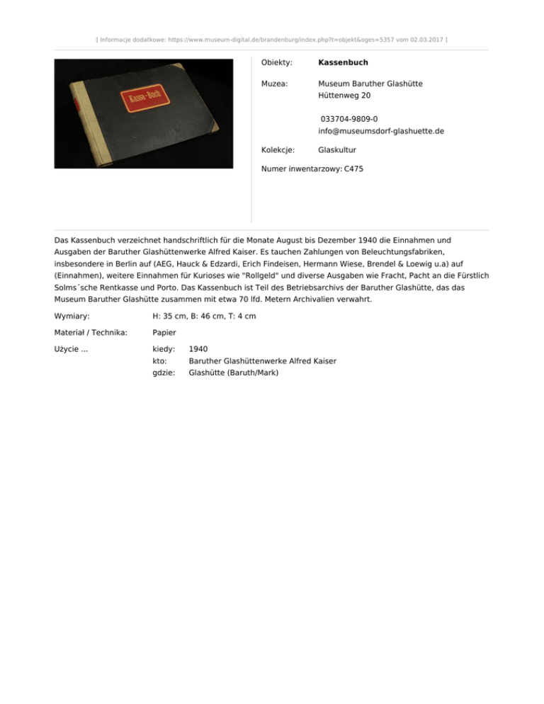 [ Informacje dodatkowe: https://www.museum-digital.de/brandenburg/index.php?t=objekt&oges=5357 vom 02.03.2017 ] Obiekty: Kassenbuch Muzea: Museum Baruther Glashütte Hüttenweg 20 033704-9809-0 [email protected] Kolekcje: Glaskultur Numer inwentarzowy: C475 Das Kassenbuch verzeichnet handschriftlich für die Monate August bis Dezember 1940 die Einnahmen und Ausgaben der Baruther Glashüttenwerke Alfred Kaiser. Es tauchen Zahlungen von Beleuchtungsfabriken, insbesondere in Berlin auf (AEG, Hauck & Edzardi, Erich Findeisen, Hermann Wiese, Brendel & Loewig u.a) auf (Einnahmen), weitere Einnahmen für Kurioses wie "Rollgeld" und diverse Ausgaben wie Fracht, Pacht an die Fürstlich Solms´sche Rentkasse und Porto. Das Kassenbuch ist Teil des Betriebsarchivs der Baruther Glashütte, das das Museum Baruther Glashütte zusammen mit etwa 70 lfd. Metern Archivalien verwahrt. Wymiary: H: 35 cm, B: 46 cm, T: 4 cm Materiał / Technika: Papier Użycie ... kiedy: 1940 kto: Baruther Glashüttenwerke Alfred Kaiser gdzie: Glashütte (Baruth/Mark)