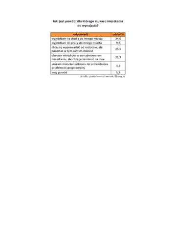 Jaki jest powód, dla którego szukasz mieszkania do wynajęcia? odpowiedź wyjeżdżam na studia do innego miasta wyjeżdżam do pracy do innego miasta chcę się wyprowadzić od rodziców, ale pozostać w tym samym mieście udział % 34,0 9,6 25,6 obecnie mieszkam w wynajmowanym mieszkaniu, ale chcę je zamienić na inne 22,3 szukam mieszkania/lokalu do prowadzenia działalności gospodarczej 3,2 inny powód 5,3 źródło: portal nieruchomości Domy.pl