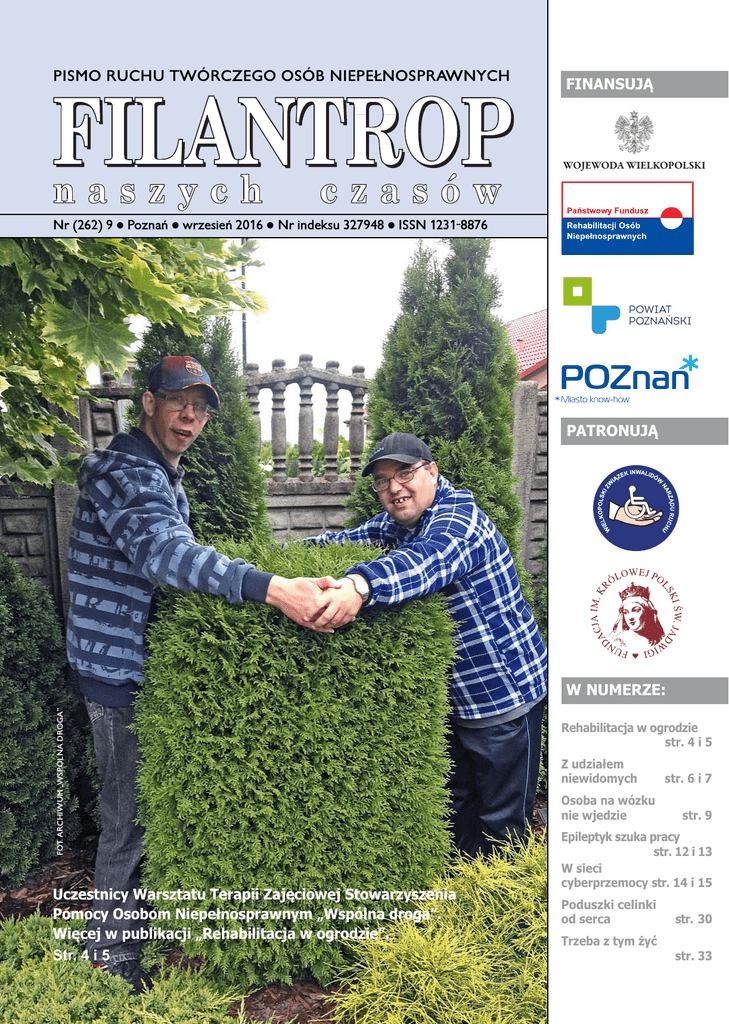 PISMO RUCHU TWÓRCZEGO OSÓB NIEPEŁNOSPRAWNYCH FINANSUJĄ Nr (262) 9 Poznań wrzesień 2016 Nr indeksu 327948 ISSN 1231-8876 PATRONUJĄ FOT. ARCHIWUM „WSPÓLNA DROGA” W NUMERZE: Uczestnicy Warsztatu Terapii Zajęciowej Stowarzyszenia Pomocy Osobom Niepełnosprawnym „Wspólna droga”. Więcej w publikacji „Rehabilitacja w ogrodzie”. Str. 4 i 5 Rehabilitacja w ogrodzie str. 4 i 5 Z udziałem niewidomych Osoba na wózku nie wjedzie str. 6 i 7 str. 9 Epileptyk szuka pracy str. 12 i 13 W sieci cyberprzemocy str. 14 i 15 Poduszki celinki od serca str. 30 Trzeba z tym żyć str. 33 2 STRONA WRZESIEŃ 2016 Tramwaj z papieżem O Zgłoś uwagi P rzypominamy, że do 15 września trwają konsultacje społeczne uruchomione przez Państwowy Fundusz Rehabilitacji Osób Niepełnosprawnych we współpracy z Ministerstwem Rodziny, Pracy i Polityki Społecznej. Chodzi o zgłaszanie uwag do ustawy z dnia 27 sierpnia 1997 roku o rehabilitacji zawodowej i społecznej oraz zatrudnianiu osób niepełnosprawnych. zgłaszać za pośrednictwem serwisu www.pfron.org.pl. Na pasku bocznym po lewej stronie (pod listą podstron) jest zakładka „Konsultacje społeczne”. Należy w nią kliknąć i wypełnić formularz elektroniczny. soby z różnymi niepełnosprawnościami tłumnie przybyły do Krakowa na organizowane w dniach 26 – 31 lipca Światowe Dni Młodzieży. W spotkaniu inaugurującym to wydarzenie uczestniczył Robert Kwiatkowski, prezes PFRON. Dla pielgrzymów z niepełnosprawnościami przygotowano odrębne sektory. Pod kątem ich potrzeb dostosowano także miejsca noclegowe oraz zapewniono środki transportu do wyznaczonych sektorów. Osoby z niepełnosprawnością wspierał powołany do tego celu zespół do spraw osób niepełnosprawnych. 28 lipca pielgrzymi z niepełnosprawnością ruchową, niewidomi, głusi i głuchoniewidomi jechali z papieżem Franciszkiem na krakowskie Błonia tramwajem. Do przejazdu z papieżem zaproszono między innymi członków Katolickiego Stowarzyszenia Osób Niepełnosprawnych i Ich Przyjaciół „Klika”, Fundacji Polskich Kawalerów Maltańskich „Pomoc Maltańska”, Polskiego Związku Niewidomych i Polskiego Związku Głuchych. Tramwajem podróżowała także Monika Białek i Małgorzata Woźniakowska z Małopolskiej Jednostki Wojewódzkiej Towarzystwa Pomocy Głuchoniewidomym. W Tarnowie w ramach ŚDM prowadzono katechezy w języku migowym dla młodych niesłyszących. kk P aństwowy Fundusz Rehabilitacji Osób Niepełnosprawnych wydaje ponad 20 milionów złotych rocznie na sport osób z niepełnosprawnościami – poinformował Robert Kwiatkowski, prezes PFRON 3 sierpnia na konferencji prasowej Warszawskiego Memoriału Kamili Skolimowskiej – międzynarodowego mityngu lekkoatletycznego, w którym czynny udział biorą sportowcy pełnosprawni i z niepełnosprawnością. Wydarzenie organizuje od 2009 roku Fundacja Kamili Skolimowskiej (zmarłej mistrzy- ni olimpijskiej z Sydney). W tym roku zorganizowano je 28 sierpnia na PGE Narodowym w Warszawie (dawniej Stadion Narodowy). Po raz pierwszy wstęp dla kibiców był darmowy. Podziwiano wyczyny sportowe licznych mistrzów i medalistów olimpijskich jak Anita Włodarczyk, Piotr Małachowski, Tomasz Majewski. Przedsięwzięcie było sfinansowane ze środków PFRON. Szczegółową relację z wydarzenia opublikujemy w wydaniu październikowym „Filantropa Naszych Czasów”. kk Ś O szumach usznych Zgłoszone uwagi, jak informuje PFRON na swojej stronie internetowej, mają umożliwić przebudowę oraz unowocześnienie systemu wsparcia osób z niepełnosprawnościami. Można je W formularzu trzeba wskazać między innymi imię, nazwisko, nazwę organizacji lub instytucji, adres korespondencyjny, telefon, adres e-mail. Wypełnienie kwestionariusza nie zajmie dużo czasu. Warto wypowiedzieć się w istotnej sprawie, którą jest poprawa warunków życia osób z niepełnosprawnościami. kk Szkolenia Memoriał Kamili z psami wiatowe Centrum Słuchu Instytutu Fizjologii i Patologii Słuchu oraz Klub Osób z Szumem Usznym „Tinnitus” organizują płatną konferencję dla ludzi z szumami usznymi i obniżoną tolerancją na dźwięki oraz dla rodzin i bliskich tych osób. Wydarzenie odbędzie się 15 października w Światowym Centrum Słuchu przy ul. Mokrej 17 w Kajetanach koło Warszawy. Koszt uczestnictwa w konferencji wynosi 35 złotych od osoby, koszt udziału w warsztatach szkoleniowych – 15 złotych. Program konferencji prze- widuje tematy wystąpień: zaburzenia funkcji komunikacyjnych u osób z szumami usznymi, współczesne metody leczenia głuchoty, szumy uszne u pacjentów z nerwiakiem nerwu słuchowego, wpływ lęku na proces adaptacji do szumów usznych, problem zaburzeń snu wśród pacjentów z szumami usznymi i inne. Warsztaty szkoleniowe będą dotyczyły takich m.in. spraw: wizy- W soboty i niedziele przez cały wrzesień na terenie strażnicy Ochotniczej Straży Pożarnej w Mosinie przy ul. Śremskiej 87 odbywają się darmowe szkolenia dla osób z niepełnosprawnościami z powiatu poznańskiego posiadających psy. Szkolenia realizuje Spółdzielnia Socjalna „Psarvard” w ramach projektu pod nazwą „Pies – towarzysz, asystent, przyjaciel” współfinansowanego ze środków PFRON. Podczas zajęć opanowywane są techniki posłuszeń- ta w pracowni audiologicznej i w pracowni rezonansu magnetycznego, sposoby radzenia sobie z szumami usznymi, zmiana aktywności mózgu, spotkanie grupy wsparcia. Głos zabiorą specjaliści, między innymi z Instytutu Fizjologii i Patologii Słuchu. Opłatę za udział należy uregulować najpóźniej do 10 października na konto bankowe: City Bank Handlowy 20 1030 stwa oraz przystosowywania czworonoga do pomocy osobie z niepełnosprawnością. Dzięki uczestnictwu w szkoleniu niepełnosprawni właściciele psów będą mogli być bardziej samodzielni i niezależni. Zwiększy się ich udział w życiu społecznym. Przeszkolone psy będą pełniły rolę 