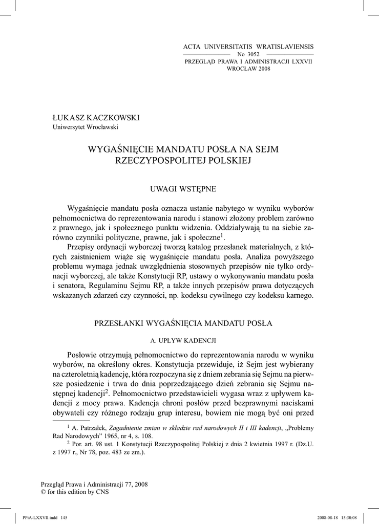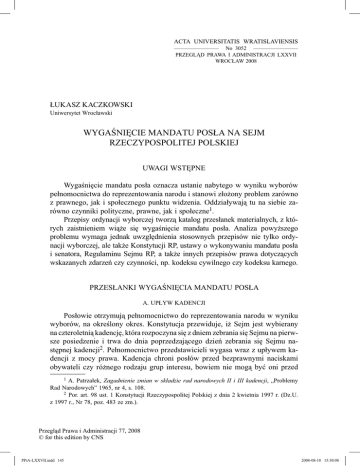 ACTA UNIVERSITATIS WRATISLAVIENSIS ———————— No 3052 ———————— PRZEGLĄD PRAWA I ADMINISTRACJI LXXVII WROCŁAW 2008 ŁUKASZ KACZKOWSKI Uniwersytet Wrocławski WYGAŚNIĘCIE MANDATU POSŁA NA SEJM RZECZYPOSPOLITEJ POLSKIEJ UWAGI WSTĘPNE Wygaśnięcie mandatu posła oznacza ustanie nabytego w wyniku wyborów pełnomocnictwa do reprezentowania narodu i stanowi złożony problem zarówno z prawnego, jak i społecznego punktu widzenia. Oddziaływają tu na siebie zarówno czynniki polityczne, prawne, jak i społeczne1. Przepisy ordynacji wyborczej tworzą katalog przesłanek materialnych, z których zaistnieniem wiąże się wygaśnięcie mandatu posła. Analiza powyższego problemu wymaga jednak uwzględnienia stosownych przepisów nie tylko ordynacji wyborczej, ale także Konstytucji RP, ustawy o wykonywaniu mandatu posła i senatora, Regulaminu Sejmu RP, a także innych przepisów prawa dotyczących wskazanych zdarzeń czy czynności, np. kodeksu cywilnego czy kodeksu karnego. PRZESŁANKI WYGAŚNIĘCIA MANDATU POSŁA A. UPŁYW KADENCJI Posłowie otrzymują pełnomocnictwo do reprezentowania narodu w wyniku wyborów, na określony okres. Konstytucja przewiduje, iż Sejm jest wybierany na czteroletnią kadencję, która rozpoczyna się z dniem zebrania się Sejmu na pierwsze posiedzenie i trwa do dnia poprzedzającego dzień zebrania się Sejmu następnej kadencji2. Pełnomocnictwo przedstawicieli wygasa wraz z upływem kadencji z mocy prawa. Kadencja chroni posłów przed bezprawnymi naciskami obywateli czy różnego rodzaju grup interesu, bowiem nie mogą być oni przed 1 A. Patrzałek, Zagadnienie zmian w składzie rad narodowych II i III kadencji, „Problemy Rad Narodowych” 1965, nr 4, s. 108. 2 Por. art. 98 ust. 1 Konstytucji Rzeczypospolitej Polskiej z dnia 2 kwietnia 1997 r. (Dz.U. z 1997 r., Nr 78, poz. 483 ze zm.). Przegląd Prawa i Administracji 77, 2008 © for this edition by CNS PPiA-LXXVII.indd 145 2008-08-18 15:30:08 146 ŁUKASZ KACZKOWSKI jej upływem odwołani3. Przeprowadzane co 4 lata wybory umożliwiają dokonywanie weryfikacji społecznego poparcia dla partii politycznych oraz konkretnych kandydatów. Kadencja może także ulec skróceniu, jeżeli Sejm podejmie taką uchwałę większością co najmniej 2/3 głosów ustawowej liczby posłów4. Również prezydent Rzeczypospolitej może zarządzić skrócenie kadencji Sejmu w sytuacjach przewidzianych w Konstytucji. Musi jednak wcześniej zasięgnąć opinii marszałka Sejmu i marszałka Senatu5. Jeżeli kadencja Sejmu ulega skróceniu, mandaty wszystkich posłów wygasają w dniu poprzedzającym dzień zebrania się Sejmu kolejnej kadencji. B. STWIERDZENIE NIEWAŻNOŚCI WYBORÓW O ważności wyborów do Sejmu oraz o ważności wyboru posła, przeciwko któremu wniesiono protest, rozstrzyga Sąd Najwyższy w składzie całej Izby Pracy, Ubezpieczeń Społecznych i Spraw Publicznych, na podstawie sprawozdania z wyborów sporządzonego przez Państwową Komisję Wyborczą oraz opinii wydanych w formie postanowienia, w postępowaniu nieprocesowym, przez Sąd Najwyższy w składzie 3 sędziów w wyniku rozpoznania protestów wyborczych. Rozstrzygnięcie to jest podejmowane w formie uchwały, na posiedzeniu z udziałem prokuratora generalnego i przewodniczącego PKW, nie później niż w 90. dniu po dniu wyborów. Wygaśnięcie wszystkich albo poszczególnych mandatów stwierdzi Sąd Najwyższy, podejmując uchwałę o nieważności wyborów lub nieważności wyboru posła. Sąd Najwyższy stwierdza wówczas wygaśnięcie mandatów w zakresie unieważnienia oraz postanawia o przeprowadzeniu wyborów ponownych lub o podjęciu niektórych czynności wyborczych, wskazując, od której czynności trzeba ponowić postępowanie wyborcze. Wygaśnięcie mandatów następuje w dniu ogłoszenia uchwały w Dzienniku Ustaw RP6. W przypadku podjęcia przez Sąd Najwyższy uchwały o nieważności wyborów w okręgu lub nieważności wyboru posła przeprowadza się wybory ponowne lub wskazane czynności wyborcze wyłącznie na terytorium kraju, a ich wyniki Państwowa Komisja Wyborcza zamieszcza w obwieszczeniu, wymieniając też osoby, które w rezultacie tych wyborów lub czynności utraciły mandat ze wskazaniem numeru okręgu wyborczego, a także numeru i nazwy listy kandydatów. 3 Por. P. Winczorek, Po co kadencja, „Rzeczpospolita” z dnia 29–30 stycznia 2005 r., Nr 24, s. C3. 4 Por. art. 98 ust. 3 Konstytucji RP z 1997 r. Por. art. 98 ust. 4 i 5; art. 155; art. 225 Konstytucji RP z 1997 r. 6 Por. art. 101 Konstytucji RP z 1997 r. oraz art. 80 i 82 ustawy z dnia 12 kwietnia 2001 r. Ordynacja wyborcza do Sejmu Rzeczypospolitej Polskiej i do Senatu Rzeczypospolitej Polskiej (Dz.U. z 2001 r., Nr 46, poz. 499 ze zm.). 5 Przegląd Prawa i Administracji 77, 2008 © for this edition by CNS PPiA-LXXVII.indd 146 2008-08-18 15:30:08 WYGAŚNIĘCIE MANDATU POSŁA NA SEJM RP 147 Obwieszczenie to podaje się do publicznej wiadomości oraz ogłasza w Dzienniku Ustaw RP a także przesyła marszałkowi Sejmu i marszałkowi Senatu. Natomiast w przypadku podjęcia przez Sąd Najwyższy uchwały o nieważności wyborów oraz jej ogłoszeniu w Dzienniku Ustaw RP przeprowadzane są ponowne wybory w zakresie unieważnienia7. Stwierdzenie przez Sąd Najwyższy nieważności wyborów we wszystkich okręgach i wygaśnięcia wszystkich mandatów poselskich może doprowadzić do sytuacji niezwykle interesującej z punktu widzenia nauki prawa, ale groźnej dla demokracji. A mianowicie przez pewien czas, do dnia zebrania się Sejmu wyłonionego w wyniku wyborów ponownych na pierwsze posiedzenie, nie będzie mógł działać podmiot, do kompetencji którego należy stanowienie prawa. W przypadku podjęcia przez Sąd Najwyższy uchwały o nieważności wyborów prezydent RP wydaje postanowienie o wyborach ponownych, które podaje się do publicznej wiadomości i ogłasza w Dzienniku Ustaw RP najpóźniej w 5. dniu od dnia ogłos