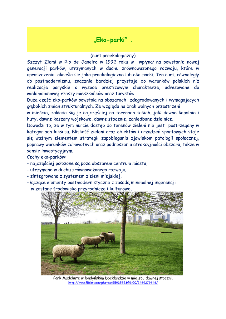 „Eko-parki” . (nurt proekologiczny) Szczyt Ziemi w Rio de Janeiro w 1992 roku w wpłynął na powstanie nowej generacji parków, utrzymanych w duchu zrównoważonego rozwoju, które w uproszczeniu określa się jako proekologiczne lub eko-parki. Ten nurt, równoległy do postmodernizmu, znacznie bardziej przystaje do warunków polskich niż realizacje paryskie o wysoce prestiżowym charakterze, adresowane do wielomilionowej rzeszy mieszkańców oraz turystów. Duża część eko-parków powstała na obszarach zdegradowanych i wymagających głębokich zmian strukturalnych. Ze względu na brak wolnych przestrzeni w mieście, zakłada się je najczęściej na terenach takich, jak: dawne kopalnie i huty, dawne koszary wojskowe, dawne stocznie, zaniedbane dzielnice. Dowodzi to, że w tym nurcie dostęp do terenów zieleni nie jest postrzegany w kategoriach luksusu. Bliskość zieleni oraz obiektów i urządzeń sportowych staje się ważnym elementem strategii zapobiegania zjawiskom patologii społecznej, poprawy warunków zdrowotnych oraz podnoszenia atrakcyjności obszaru, także w sensie inwestycyjnym. Cechy eko-parków: - najczęściej położone są poza obszarem centrum miasta, - utrzymane w duchu zrównoważonego rozwoju, - zintegrowane z systemem zieleni miejskiej, - łączące elementy postmodernistyczne z zasadą minimalnej ingerencji w zastane środowisko przyrodnicze i kulturowe, Park Mudchute w londyńskim Docklandzie w miejscu dawnej stoczni. http://www.flickr.com/photos/55935853@N00/2469279646/