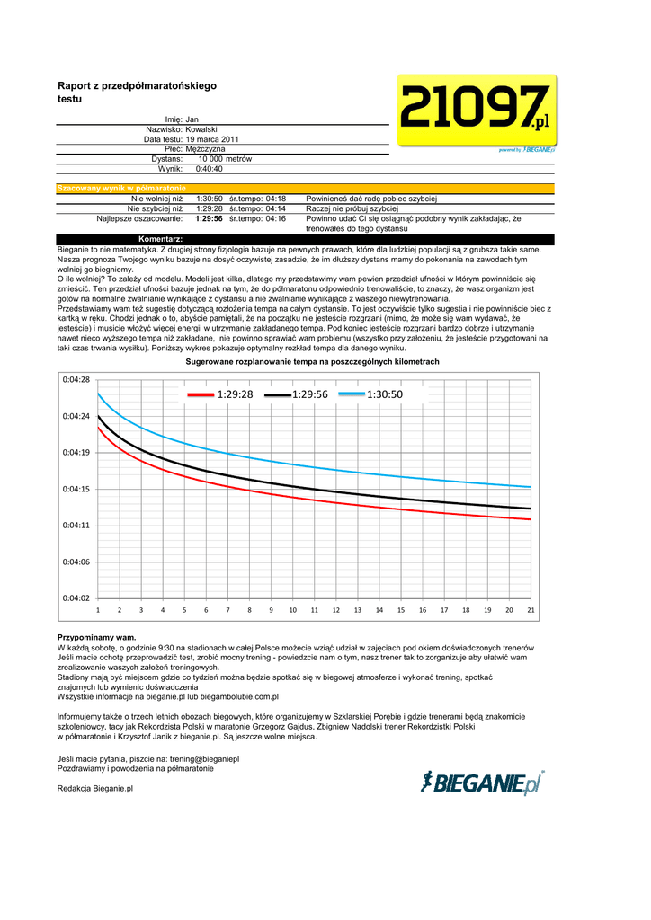 Raport z przedpółmaratońskiego testu lp Imię: Nazwisko: Data testu: Płeć: Dystans: Wynik: 26 Jan Kowalski 19 marca 2011 Mężczyzna 10 000 metrów 0:40:40 Szacowany wynik w półmaratonie Nie wolniej niż Nie szybciej niż Najlepsze oszacowanie: 1:30:50 śr.tempo: 04:18 1:29:28 śr.tempo: 04:14 1:29:56 śr.tempo: 04:16 Powinieneś dać radę pobiec szybciej Raczej nie próbuj szybciej Powinno udać Ci się osiągnąć podobny wynik zakładając, że trenowałeś do tego dystansu Komentarz: Bieganie to nie matematyka. Z drugiej strony fizjologia bazuje na pewnych prawach, które dla ludzkiej populacji są z grubsza takie same. Nasza prognoza Twojego wyniku bazuje na dosyć oczywistej zasadzie, że im dłuższy dystans mamy do pokonania na zawodach tym wolniej go biegniemy. O ile wolniej? To zależy od modelu. Modeli jest kilka, dlatego my przedstawimy wam pewien przedział ufności w którym powinniście się zmieścić. Ten przedział ufności bazuje jednak na tym, że do półmaratonu odpowiednio trenowaliście, to znaczy, że wasz organizm jest gotów na normalne zwalnianie wynikające z dystansu a nie zwalnianie wynikające z waszego niewytrenowania. Przedstawiamy wam też sugestię dotyczącą rozłożenia tempa na całym dystansie. To jest oczywiście tylko sugestia i nie powinniście biec z kartką w ręku. Chodzi jednak o to, abyście pamiętali, że na początku nie jesteście rozgrzani (mimo, że może się wam wydawać, że jesteście) i musicie włożyć więcej energii w utrzymanie zakładanego tempa. Pod koniec jesteście rozgrzani bardzo dobrze i utrzymanie nawet nieco wyższego tempa niż zakładane, nie powinno sprawiać wam problemu (wszystko przy założeniu, że jesteście przygotowani na taki czas trwania wysiłku). Poniższy wykres pokazuje optymalny rozkład tempa dla danego wyniku. Sugerowane rozplanowanie tempa na poszczególnych kilometrach 0:04:28 1:29:28 1:29:56 1:30:50 0:04:24 0:04:19 0:04:15 0:04:11 0:04:06 0:04:02 1 2 3 4 5 6 7 8 9 10 11 12 13 14 15 16 17 18 19 20 21 Przypominamy wam. W każdą sobotę, o godzinie 9:30 na stadionach w całej Polsce możecie wziąć udział w zajęciach pod okiem doświadczonych trenerów Jeśli macie ochotę przeprowadzić test, zrobić mocny trening - powiedzcie nam o tym, nasz trener tak to zorganizuje aby ułatwić wam zrealizowanie waszych założeń treningowych. Stadiony mają być miejscem gdzie co tydzień można będzie spotkać się w biegowej atmosferze i wykonać trening, spotkać znajomych lub wymienic doświadczenia Wszystkie informacje na bieganie.pl lub biegambolubie.com.pl Informujemy także o trzech letnich obozach biegowych, które organizujemy w Szklarskiej Porębie i gdzie trenerami będą znakomicie szkoleniowcy, tacy jak Rekordzista Polski w maratonie Grzegorz Gajdus, Zbigniew Nadolski trener Rekordzistki Polski w półmaratonie i Krzysztof Janik z bieganie.pl. Są jeszcze wolne miejsca. Jeśli macie pytania, piszcie na: trening@bieganiepl Pozdrawiamy i powodzenia na półmaratonie Redakcja Bieganie.pl