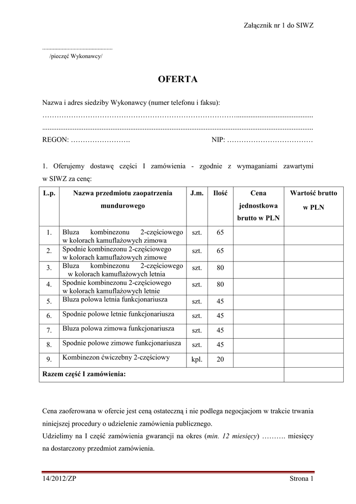 Załącznik nr 1 do SIWZ ............................................... /pieczęć Wykonawcy/ OFERTA Nazwa i adres siedziby Wykonawcy (numer telefonu i faksu): ………………………………………………………………………........................................... ....................................................................................................................................................... REGON: ……………………. NIP: ……………………………… 1. Oferujemy dostawę części I zamówienia - zgodnie z wymaganiami zawartymi w SIWZ za cenę: L.p. Nazwa przedmiotu zaopatrzenia J.m. Ilość mundurowego Cena Wartość brutto jednostkowa w PLN brutto w PLN szt. 65 szt. 65 szt. 80 szt. 80 5. Bluza kombinezonu 2-częściowego w kolorach kamuflażowych zimowa Spodnie kombinezonu 2-częściowego w kolorach kamuflażowych zimowe Bluza kombinezonu 2-częściowego w kolorach kamuflażowych letnia Spodnie kombinezonu 2-częściowego w kolorach kamuflażowych letnie Bluza polowa letnia funkcjonariusza szt. 45 6. Spodnie polowe letnie funkcjonariusza szt. 45 7. Bluza polowa zimowa funkcjonariusza szt. 45 8. Spodnie polowe zimowe funkcjonariusza szt. 45 9. Kombinezon ćwiczebny 2-częściowy kpl. 20 1. 2. 3. 4. Razem część I zamówienia: Cena zaoferowana w ofercie jest ceną ostateczną i nie podlega negocjacjom w trakcie trwania niniejszej procedury o udzielenie zamówienia publicznego. Udzielimy na I część zamówienia gwarancji na okres (min. 12 miesięcy) ………. miesięcy na dostarczony przedmiot zamówienia. 14/2012/ZP Strona 1 Załącznik nr 1 do SIWZ 2. Oferujemy dostawę części II zamówienia – zgodnie z wymaganiami zawartymi w SIWZ za cenę: L.p. Nazwa przedmiotu zaopatrzenia J.m. Ilość mundurowego Cena Wartość brutto jednostkowa w PLN brutto w PLN 1. Kurtka ochronna szt. 70 2. Spodnie ochronne szt. 70 3. Ocieplacz kurtki ochronnej szt. 70 4. Ocieplacz spodni ochronnych szt. 70 5. Kurtka ubrania ochronnego szt. 35 6. Spodnie ubrania ochronnego szt. 35 7. Ocieplacz pod kurtkę ubrania ochronnego szt. 35 8. Ocieplacz szt. 35 pod spodnie ubrania ochronnego Razem część II zamówienia: Cena zaoferowana w ofercie jest ceną ostateczną i nie podlega negocjacjom w trakcie trwania niniejszej procedury o udzielenie zamówienia publicznego. Udzielimy na II część zamówienia: - w zakresie pozycji 1 – 4 gwarancji na okres (min. 24 miesiące) ………. miesięcy na dostarczony przedmiot zamówienia; - w zakresie pozycji 5 – 8 gwarancji na okres (min. 36 miesięcy) ………. miesięcy na dostarczony przedmiot zamówienia. 3. Oferujemy dostawę części III zamówienia - zgodnie z wymaganiami zawartymi w SIWZ za cenę: L.p. Nazwa przedmiotu zaopatrzenia J.m. Ilość mundurowego Cena Wartość brutto jednostkowa w PLN brutto w PLN 1. Kombinezon z tkaniny trudnopalnej szt. 60 Razem część III zamówienia: 14/2012/ZP Strona 2 Załącznik nr 1 do SIWZ Cena zaoferowana w ofercie jest ceną ostateczną i nie podlega negocjacjom w trakcie trwania niniejszej procedury o udzielenie zamówienia publicznego. Udzielimy na III część zamówienia gwarancji na okres (min. 12 miesięcy) ……. miesięcy na dostarczony przedmiot zamówienia. 4. Oferujemy dostawę części IV zamówienia - zgodnie z wymaganiami zawartymi w SIWZ za cenę: L.p. Nazwa przedmiotu zaopatrzenia J.m. Ilość mundurowego Cena Wartość brutto jednostkowa w PLN brutto w PLN 1. Kombinezon roboczy kombinezonu roboczego, (bluza kpl. 40 spodnie kombinezonu roboczego) Razem część IV zamówienia: Cena zaoferowana w ofercie jest ceną ostateczną i nie podlega negocjacjom w trakcie trwania niniejszej procedury o udzielenie zamówienia publicznego. Udzielimy na IV część zamówienia gwarancji na okres (min. 12 miesięcy) ……. miesięcy na dostarczony przedmiot zamówienia. 5. Oświadczamy, że zapoznaliśmy się ze SIWZ i nie wnosimy do niej zastrzeżeń oraz zdobyliśmy konieczne informacje do przygotowania oferty. 6. Oświadczamy, że uważamy się za związanych niniejszą ofertą przez czas wskazany w SIWZ. 7. Deklarujemy wniesienie zabezpieczenia należytego wykonania umowy przed podpisaniem umowy w wysokości 10% wartości brutto oferty. 8. Oświadczamy, że zobowiązujemy się do podpisania umowy na warunkach zawartych w SIWZ w miejscu i terminie wskazanym przez Zamawiającego. 9. Podwykonawcom powierzamy wykonanie następujących czynności (wypełnić w przypadku zaistnienia takiej okoliczności): ....................................................................................................................................................... ....................................................................................................................................................... 14/2012/ZP Strona 3 Załącznik nr 1 do SIWZ Załącznikami do niniejszej oferty są: 1 ………………………………………………………………………………………………… 2 ……………………………………………………………………………………………..….. 3 ………………………………………………………………..……………………………….. 4 ………………………………………………………………..……………………………….. 5 ………………………………………………………………..……………………………….. 6 ………………………………………………………………..……………………………….. ..................................................................................... /podpis uprawnionego przedstawiciela Wykonawcy/ 14/2012/ZP Strona 4
