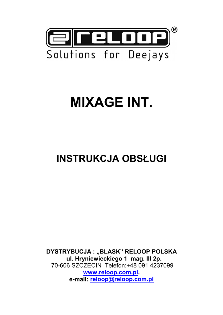 MIXAGE INT. INSTRUKCJA OBSŁUGI DYSTRYBUCJA : „BLASK” RELOOP POLSKA ul. Hryniewieckiego 1 mag. III 2p. 70-606 SZCZECIN Telefon:+48 091 4237099 www.reloop.com.pl. e-mail: [email protected] Gratulujemy zakupu kontrolera Mixage firmy Reloop. Dziękujemy za zaufanie okazane naszej technologii didżejskiej. Zanim sprzęt zostanie użyty prosimy o dokładne zapoznanie się z instrukcją obsługi. Proszę wypakować sprzęt i sprawdzić czy nie został on uszkodzony podczas transportu. Jeśli zauważysz jakiekolwiek usterki bądź widoczne uszkodzenia, nie używaj sprzętu i skontaktuj się ze sprzedawcą. UWAGA! Proszę zachować szczególną ostrożność podczas używania sprzętu o napięciu 230V. Tak duże napięcie może prowadzić do śmiertelnego porażenia prądem! Jakiekolwiek uszkodzenie sprzętu spowodowane niestosowaniem się do instrukcji obsługi unieważnia umowę gwarancyjną. - z powodów ostrożności i certyfikatu (CE) nieautoryzowana modyfikacja sprzętu jest zabroniona. Jeśli uszkodzenie wynika z samodzielnej modyfikacji sprzętu umowa gwarancyjna staję się nieważna. - części wewnętrzne sprzętu nie wymagają żadnych konserwacji, za wyjątkiem części zużywalnych, które mogą być konserwowane z zewnątrz. Tylko odpowiednio wykwalifikowani pracownicy mogą wymienić bądź naprawić części wewnętrzne, w innym przypadku gwarancja zostaje zerwana! - upewnij się, iż sprzęt jest podłączany do prądu dopiero na samym końcu, gdy jest on już poprawnie ustawiony i połączony z innym sprzętem. Upewnij się, czy włącznik sieciowy jest w pozycji „OFF” podczas podłączania kabla sieciowego do gniazdka. - używaj tylko odpowiednich kabli, które są kompatybilne ze sprzętem. Upewnij się, czy wszystkie kable są odpowiednio połączone i czy nie są wyczuwalne żadne luzy w gniazdkach, łączeniach itp. W przypadku jakichkolwiek wątpliwości zasięgnij informacji u sprzedawcy. - upewnij się czy żadne kable nie są uszkodzone. - upewnij się czy przełącznik napięcia jest w prawidłowej pozycji. Uszkodzenia spowodowane niepoprawnym ustawieniem przełącznika nie są objęte umową gwarancyjną. - jeśli to możliwe sprzęt podłączaj do gniazdek z zabezpieczeniem antyprzepięciowym. - sprzęt odłączaj od prądu tylko po skończonej pracy oraz przed każdym czyszczeniem. - sprzęt ustawiaj w pozycji horyzontalnej na stabilnym podłożu oraz z dala od nagłośnienia w celu uniknięcia zakłóceń. - unikaj jakichkolwiek wstrząsów bądź uderzeń podczas operowania sprzętem. - chroń sprzęt przed źródłami ciepła, wilgoci oraz kurzu. - nie stawiaj w pobliżu sprzętu żadnych pojemników z płynem, który mógłby zalać aparaturę. Jeśli jednak płyn dostanie się do urządzenia, natychmiast odłącz go od zasilania. Przed ponownym użyciem sprzętu koniecznie oddaj go do sprawdzenia wykwalifikowanemu personelowi. Tego typu uszkodzenia sprzętu nie są objęte umową gwarancyjną. - nie używaj sprzętu w zbyt niskiej (poniżej 5º C) bądź wysokiej (powyżej 35º C) temperaturze. Sprzęt nie powinien znajdować się w miejscu narażonym na działanie promieni słonecznych bądź blisko innych źródeł ciepła (np. grzejniki, kuchenki itp.). Nie zakrywać otworów wentylacyjnych. - sprzęt nie powinien być używany od razu po przebywaniu w niskiej temperaturze (np. po transporcie w zimie). Nie używaj sprzętu dopóki nie osiągnie on temperatury zbliżonej do tej, w której zostanie użyty. - przyciski, klawisze oraz przełączniki nie mogą być narażone na płynne środki czyszczące. Do czyszczenia sprzętu używaj tylko suchych materiałów. - podczas włączania sprzętu upewnij się czy wszystkie pokrętła i potencjometry są ustawione na „0” co zapobiegnie uszkodzeniom sprzętu - sprzęt powinien być transportowany w oryginalnym opakowaniu. - sprzęt podłączony do zasilania powinien znajdować się z dala od dzieci. - w szkołach, warsztatach itp. sprzęt musi być monitorowany przez wykwalifikowane do tego osoby. - zachowaj niniejszą instrukcję w przypadku późniejszych wątpliwości lub pytań. 1. OPIS GŁÓWNY Nr T1 T2 T3 T4 T5 T6 T7 T8 T9 T10 T11 T12 T13 T14 T15 T16 T17 T18 T19 T20 T21 T22 T23 Opis Potencjometr pitch Potencjometr pitch + Przycisk Shift Przycisk Autoloop (Shift: Loop In) Długość pętli + / - (Shift: Beat Move – tylko Traktor PRO) Pokrętło Gain Potencjometr pitch Przycisk Reloop (Shift: Loop Out) Przycisk wyboru efektu FX Natężenie efektu (Shift: pokrętło Pan) Regulacja parametru 1 efektu (Shift: Filter) Przycisk FX ON (Shift: Keylock) Przycisk Search Przycisk Scratch Koło JOG Przycisk Sync (Shift: CUE 1 – tylko Traktor PRO) Przycisk CUP (Shift: CUE 2 – tylko Traktor PRO) Przycisk CUE (Shift: CUE 3 – tylko Traktor PRO) Przycisk Play/Pause (Shift: CUE 4 – tylko Traktor PRO) Pokrętło TRAX (Shift: przeglądanie folderów) Przycisk Track Load (Shift: otwarcie folderu [R], zamknięcie folderu [L]) Pokrętło regulacji tonów wysokich Pokrętło regulacji tonów średnich T24 T25 T26 T27 T28 T29 T30 T31 T32 T33 Pokrętło regulacji tonów niskich Przycisk CUE (Shift: podsłuch ścieżki [L], stop [R]) Potencjometr regulacji poziomu głośności danego kanału Pokrętło regulacji poziomu głośności Master Pokrętło regulacji poziomu głośności wyjścia słuchawkowego Potencjometr Cue Mix Dioda LED Power Dioda LED MIDI Miernik poziomu głośności wyjścia Master Crossfader Tył Nr B39 B40 B41 B42 B43 B44 B45 B46 B47 Opis Zabezpieczenie przewodu zasilającego Gniazdo zasilania (DC 6V/1,5 A) Przycisk ON/OFF Port USB Przełącznik kanałów MIDI ½ Przełącznik Shift Lock /On/Off Pokrętło regulacji czułości koła JOG Pokr꙳o regulacji mocy podświetlenia diod LED Wyjście RCA Przód Nr F34 F35 F36 F37 Opis Wejście mikrofonowe 6.3 mm Regulacja głośności mikrofonu Przełącznik przesyłu sygnału dla kanału mikrofonowego Wyjście słuchawkowe 6.3 mm 2. PIERWSZE KROKI - u