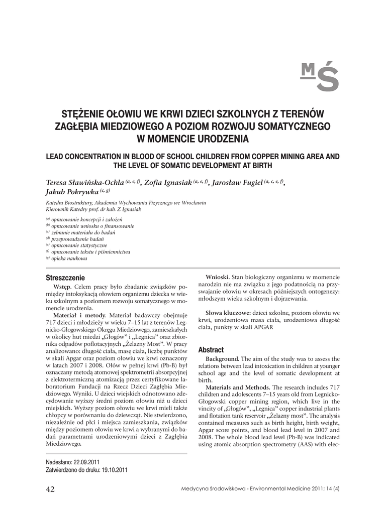 StĘŻenie oŁowiu we krwi dzieci Szkolnych z terenów zagŁĘbia Miedziowego a pozioM rozwoju SoMatycznego w MoMencie urodzenia lead concentration in blood of School children froM copper Mining area and the level of SoMatic developMent at birth Teresa Sławińska-Ochla (a, e, f), Zofia Ignasiak (a, e, f), Jarosław Fugiel (a, c, e, f), Jakub Pokrywka (c, g) Katedra Biostruktury, Akademia Wychowania Fizycznego we Wrocławiu Kierownik Katedry prof. dr hab. Z Ignasiak opracowanie koncepcji i założeń opracowanie wniosku o finansowanie (c) zebranie materiału do badań (d) przeprowadzenie badań (e) opracowanie statystyczne (f) opracowanie tekstu i piśmiennictwa (g) opieka naukowa (a) (b) Streszczenie Wstęp. Celem pracy było zbadanie związków pomiędzy intoksykacją ołowiem organizmu dziecka w wieku szkolnym a poziomem rozwoju somatycznego w momencie urodzenia. Materiał i metody. Materiał badawczy obejmuje 717 dzieci i młodzieży w wieku 7–15 lat z terenów Legnicko-Głogowskiego Okręgu Miedziowego, zamieszkałych w okolicy hut miedzi „Głogów” i „Legnica” oraz zbiornika odpadów poflotacyjnych „Żelazny Most”. W pracy analizowano: długość ciała, masę ciała, liczbę punktów w skali Apgar oraz poziom ołowiu we krwi oznaczony w latach 2007 i 2008. Ołów w pełnej krwi (Pb-B) był oznaczany metodą atomowej spektrometrii absorpcyjnej z elektrotermiczną atomizacją przez certyfikowane laboratorium Fundacji na Rzecz Dzieci Zagłębia Miedziowego. Wyniki. U dzieci wiejskich odnotowano zdecydowanie wyższy średni poziom ołowiu niż u dzieci miejskich. Wyższy poziom ołowiu we krwi mieli także chłopcy w porównaniu do dziewcząt. Nie stwierdzono, niezależnie od płci i miejsca zamieszkania, związków między poziomem ołowiu we krwi a wybranymi do badań parametrami urodzeniowymi dzieci z Zagłębia Miedziowego. Wnioski. Stan biologiczny organizmu w momencie narodzin nie ma związku z jego podatnością na przyswajanie ołowiu w okresach późniejszych ontogenezy: młodszym wieku szkolnym i dojrzewania. Słowa kluczowe: dzieci szkolne, poziom ołowiu we krwi, urodzeniowa masa ciała, urodzeniowa długość ciała, punkty w skali APGAR abstract Background. The aim of the study was to assess the relations between lead intoxication in children at younger school age and the level of somatic development at birth. Materials and Methods. The research includes 717 children and adolescents 7–15 years old from LegnickoGłogowski copper mining region, which live in the vincity of „Głogów”, „Legnica” copper industrial plants and flotation tank reservoir „Żelazny most”. The analysis contained measures such as birth height, birth weight, Apgar score points, and blood lead level in 2007 and 2008. The whole blood lead level (Pb-B) was indicated using atomic absorption spectrometry (AAS) with elec- Nadesłano: 22.09.2011 Zatwierdzono do druku: 19.10.2011 42 Medycyna Środowiskowa - Environmental Medicine 2011; 14 (4) trothermic atomization by certified The Foundation for Children From The Copper Basin laboratory. Results. Rural children were noted for significantly higher blood lead levels than urban peers. Also boys in comparison to girls had higher blood lead levels. Regardless of gender and place of residence there were no significant correlation between blood lead level and body mass at birth. wstęp Przyczyn deficytów urodzeniowych dziecka takich jak niska urodzeniowa masa ciała, czy skrócony okres życia płodowego może być wiele. Wśród nich wymienia się podwyższony poziom ołowiu we krwi matek [1–3]. Można przypuszczać, że na terenach skażonych metalami ciężkimi czynnik ten odgrywa niepoślednią rolę. Jak wykazały badania, poziom ołowiu we krwi matki jest istotnie skorelowany z poziomem ołowiu we krwi noworodka i niemowlęcia [4–6]. Jest to związane zarówno z pokonywaniem bariery łożyskowej [7–11] jak i pochłanianiem przez dziecko karmione piersią ołowiu z mlekiem matki [12]. Zakładając, że korelacja ta oddaje osobniczą wrażliwość organizmu na czynniki środowiska, można przyjąć, iż konsekwencje zamieszkiwania od urodzenia na terenach skażonych metalami ciężkimi będą widoczne również na późniejszych etapach ontogenezy, a szczególnie w tzw. okresach sensytywnych, do których należy okres dojrzewania. Można także domniemywać, iż stałe, niekorzystne oddziaływanie środowiska może znajdować odbicie w dobrostanie fizycznym dziecka w każdym wieku. Celem niniejszej pracy było zbadanie związków pomiędzy intoksykacją ołowiem organizmu dziecka w wieku szkolnym a poziomem rozwoju somatycznego w momencie urodzenia. Materiał i metody Od 1995 roku prowadzimy badania ciągłe nad rozwojem biologicznym dzieci i młodzieży z obszarów Legnicko-Głogowskiego Okręgu Miedziowego. Badania uzyskały zgodę Komisji Etyki Badań Naukowych, miejscowych władz szkolnych i administracyjnych oraz rodziców. Analizowany materiał badawczy obejmuje dane 717 dzieci i młodzieży w wieku 7–15 lat, zamieszkałych w okolicy hut miedzi „Głogów” i „Legnica” oraz zbiornika odpadów flotacyjnych „Żelazny Most”. Dla celów niniejszej pracy wybrano parametry urodzeniowe: długość i masę ciała, liczbę punktów w skali APGAR (dane z książeczki zdrowia) oraz poziom ołowiu we krwi oznaczony w roku 2007 u dzieci szkolnych ze wsi: Rosochata, Rzeszotary, Spalona, Brzeg Głogowski, Kotla, Kromolin i Nielubia, oraz w roku Conclusion. The biological state of the organism at the moment of birth has no connection with the susceptibility to absorption of lead in the later phases of ontogenesis: the earlier school age and adlescence. Keywords: school children, blood lead, birth weight, birth height, APGAR score 2008 u dzieci z Polkowic. Do badania pobierana była krew żylna z wykorzystaniem zestawu vacutainer. Ołów w pełnej krwi (Pb-B) był oznaczany metodą atomowej spektrometrii absorpcyjnej z elekt
