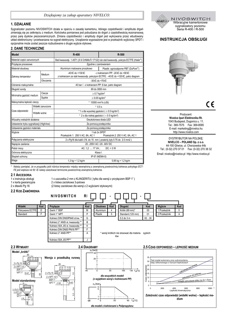 Dziękujemy za zakup aparatury NIVELCO. Wibracyjne kamertonowe sygnalizatory poziomu Seria R-400 / R-500 1. DZIAŁANIE Sygnalizator poziomu NIVOSWITCH działa w oparciu o zasadę kamertonu, którego częstotliwość i amplituda drgań zmieniają się po zetknięciu z medium. Końcówka pomiarowa jest pobudzana do drgań z częstotliwością rezonansową przez parę dysków piezoceramicznych. Zmiana częstotliwości i amplitudy drgań jest wykrywana przez wbudowany układ elektroniczny i przetwarzana na sygnał elektryczny. Urządzenie wyposażone jest w przekaźnik wyjściowy SPDT i opcjonalnie może zostać jeszcze rozbudowane o drugie wyjście stykowe. INSTRUKCJA OBSŁUGI 2. DANE TECHNICZNE Model R-400 R-500 Stal kwasoodp. 1.4571 (X 6 CrNiMoTi 17122) lub stal kwasoodp. pokryta ECTFE (Halár) Materiał części zanurzonych Przyłącze procesowe Zgodnie z zamówieniem Plastik: ognioodporne PBT (DuPont) Aluminium malowane proszkowo Materiał obudowy -40°C do +130°C - z kołnierzem PP: -20°C do +90°C z kołnierzem ze stali kwasoodp. pokrytym ECTFE : -40°C do +120°C, patrz diagram Medium Zakresy temperatur Otoczenia -30°C do +70°C Ciśnienie maksymalne 40 bar / - z kołnierzem PP: 6 bar, patrz diagram Długość sondy 69 do 3000 mm Minimalna gęstość medium Ciecze ≥ 0.7 kg/dm3 Sypkie ≥ 0.05 kg/dm3 Maksymalna lepkość cieczy ≤ 10000 mm2/s (cSt) Widełki zanurzone Czas odpowiedzi ≤ 0.5 s ≤1 s dla wysokiej gęstości ( ≥ 0.5 kg/dm3) Widełki wolne Producent: Nivelco Ipari Elektronika Rt. 1043 Budapest, Dugonics u. 11. Tel.: 369-7575 Fax: 369-8585 E-mail: [email protected] http://www.nivelco.com ≤ 2 s dla niskiej gęstości ( < 0.5 kg/dm3) Wizualny wskaźnik działania Dwukolorowa dioda LED Ustawienie trybu sygnalizacji (High/low) Za pomocą przełącznika Ustawienie gęstości materiału Za pomocą przełącznika Wyjście 1 lub 2x SPDT Przekaźnik 1: 250 V AC, 8A, AC 1 Przekaźnik 2: 250 V AC, 6A, AC 1 Połączenia elektryczne DYSTRYBUTOR NA POLSKĘ: NIVELCO – POLAND Sp. z o.o. 44-100 Gliwice, ul. Chorzowska 44b Tel.: (0-32) 270 37 01 Fax: (0-32) 270 38 32 2 x Pg16 dla kabli ∅8. do 15 mm ( przekrój żyły 0.75 do 2.5 mm2 ) Napięcie zasilania 20...255V AC i 20...60V DC Pobór mocy AC: 1,2 … 17 VA ; Ochrona elektryczna DC: < 3 W Klasa I. Stopień ochrony Waga Email: [email protected] http://www.nivelco.pl IP 67 (NEMA 6) 1,3 kg + 1,2 kg/m 0,95 kg + 1,2 kg/m * Należy pamiętać, że w przypadku jeśli różnica temperatur między wewnętrzną a zewnętrzną powierzchnią kołnierza pokrytego ECTFE jest większa niż 60 °C należy zaizolować termicznie powierzchnię zewnętrzną kołnierza. 2.1 AKCESORIA 1 x instrukcja obsługi 1 x karta gwarancyjna 2 x dławiki Pg 16 1 x uszczelka 2 mm z KLINGERITU ( tylko dla wersji z przyłączem BSP 1” ) 2 x listwa zaciskowa 3-polowa (2 listwy zaciskowe dla wersji z 2 wyjściami stykowymi) 2.2 KOD ZAMÓWIENIA NIVOSWITCH Widełki Kod Pokrywane ECTFE D Standard F RR Przyłącze Gwint 1” BSP Gwint 1” NPT Kod M P Kołnierz DIN DN50PN40 st.kw. ** G Kołnierz 2” ANSI st. kwasoodp.** Kołnierz 50A JIS st. kwasoodp.** Kołnierz DIN DN50 PN16 PP** Kołnierz 2” ANSI PP** B K F A Kołnierz 50A JIS PP** J 2.3 WYMIARY Obudowa Aluminium Plastik Kod 4 5 Długość Krótki (69 mm)* Standard (125 mm) 0.2 do 3 m Kod 00 01 Wyjście 1 Przekaźnik 2 Przekaźniki Kod 0 A 02…30 * wersji krótkich nie stosować dla materia- sypkich łów 2.4 DIAGRAMY 2.5 CZAS ODPOWIEDZI – LEPKOŚĆ MEDIUM Model „krótki” 89 Wersja z przedłużką rurową dla wszystkich modeli (z wyjątkiem wersji z kołnierzami PP) S=41 Czas odpowiedzi 2 x NPT 1/2" BSP 1" NPT 1" ∅ 28 111 2 x Pg 16 Test został wykonany przy wykorzystaniu oleju silikonowego o róznych lepkościach ne rzo an u ie z ic kow cał y połow e do rzon zanu na ok.1,5cm widełki zanurzone tylko 25 20 15 10 5 0 0 2000 4000 6000 Lepkość kinematyczna 8000 10000 ν Zależność czas odpowiedzi (widełki wolne) – lepkość medium S=41 125 2 x NPT 1/2" BSP 1" NPT 1" ∅ 28 111 89 89 0,3 ... 3 m 69 Model standardowy 2 x Pg 16 30 111 2 x Pg 16 2 x NPT 1/2" BSP 1" NPT 1" S=41 35 dla modeli z kołnierzami z Polipropylenu 3. INSTALACJA 4. POŁĄCZENIA ELEKTRYCZNE Należy chronić urządzenie przed uszkodzeniami mechanicznymi. Do połączeń używać przewodów o średnicy zewnętrznej 8...15 mm. Po wyprowadzeniu przewodów przez dławiki należy zakręcić obudowę i dokręcić dławiki tak, aby zapewnić szczelność IP67. Urządzenie należy uziemić wykorzystując śrubę uziemiającą umieszczoną na zewnątrz obudowy lub za pośrednictwem zacisku uziemiającego umieszczonego wewnątrz obudowy. Kable wersji zasilanych niskim napięciem AC i DC nie powinny być prowadzone wspólnymi trasami z kablami siłowymi. Aby ułatwić poprawne ustawienia drgających końcówek sygnalizatora, na króćcu umieszczony został znacznik określający położenie widełek. Dla poprawnej instalacji sygnalizatora podczas montażu użyć należy uszczelki dostarczonej wraz z sygnalizatorem lub uszczelnić połączenie taśmą teflonową. FAI L SAFE LO W HIGH U~ 20 -25 5V 20 -60 V Czułość 1 2 AC DC L1+ 3 FA IL SAFE 250VAC 6A/AC1 LOW DENSITY HIGH LOW RED 250VAC 8A 8A/AC1 /A C1 GREEN 4 5 6 7 8 Tryb sygnalizacji Wyjście 9 Zasilanie Nie należy wykorzystywać obudowy sygnalizatora przy wkręcaniu go do przyłącza procesowego. Należy używać 6-kątnej końcówki króćca sygnalizatora o s= 41 mm. Obudowę aluminiową można ręcznie przekręcić o około jeden obrót (300°) tak aby dławiki były skierowane do dołu. 2 3 L1(+) 7 Uziemienie W aplikacjach na cieczach: • 9 Status LED Instalacja na cieczach • 8 Przekaźnik 1 4 o małej lepkości sygnalizator NIVOSWITCH może być montowany w dowolnej pozycji Pg 16 o znacznej lepkości (duże ryzyko pozostawania resztek materiału na widełkach) zaleca się stosować montaż pionowy. 5 6 Przekaźnik 2 NPT 1/2” Pg 16 NPT 1/2” 5. KALIBRACJA Zalecane ustawieni