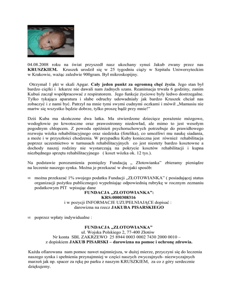 04.08.2008 roku na świat przyszedł nasz ukochany synuś Jakub zwany przez nas KRUSZKIEM. Kruszek urodził się w 25 tygodniu ciąży w Szpitalu Uniwersyteckim w Krakowie, ważąc zaledwie 900gram. Był mikroskopijny. Otrzymał 1 pkt w skali Apgar. Cały jeden punkt za ogromną chęć życia. Jego stan był bardzo ciężki i lekarze nie dawali nam żadnych szans. Reanimacja trwała 6 godziny, zanim Kubuś zaczął współpracować z respiratorem. Jego funkcje życiowe były ledwo dostrzegalne. Tylko tykająca aparatura i słabe odruchy udowadniały jak bardzo Kruszek chciał nas zobaczyć i z nami być. Patrzył na mnie tymi swymi cudnymi oczkami i mówił „Mamusiu nie martw się wszystko będzie dobrze, tylko proszę bądź przy mnie!” Dziś Kuba ma skończone dwa latka. Ma stwierdzone dziecięce porażenie mózgowe, wodogłowie po krwotoczne oraz prawostronny niedowład, ale mimo to jest wesołym pogodnym chłopcem. Z powodu opóźnień psychoruchowych potrzebuje do prawidłowego rozwoju wózka rehabilitacyjnego oraz siedziska (fotelika), co umożliwi mu naukę siadania, a może i w przyszłości chodzenia. W przypadku Kuby konieczna jest również rehabilitacja poprzez uczestnictwo w turnusach rehabilitacyjnych co jest niestety bardzo kosztowne a dochody naszej rodziny nie wystarczają na pokrycie kosztów rehabilitacji i kupna niezbędnego sprzętu rehabilitacyjnego ( koszt wózka ok. 12 tys.). Na podstawie porozumienia pomiędzy Fundacją „ Złotowianka” zbieramy pieniądze na leczenie naszego synka. Można je przekazać w dwojaki sposób: • można przekazać 1% swojego podatku Fundacji „ZŁOTOWIANKA” ( posiadającej status organizacji pożytku publicznego) wypełniając odpowiednią rubrykę w rocznym zeznaniu podatkowym PIT wpisując dane FUNDACJA „ZŁOTOWIANKA”: KRS:0000308316 i w pozycji INFORMACJE UZUPEŁNIAJĄCE dopisać : darowizna na rzecz JAKUBA PISARSKIEGO • poprzez wpłaty indywidualne : FUNDACJA „ZŁOTOWIANKA” ul. Wojska Polskiego 2, 77-400 Złotów Nr konta SBL ZAKRZEWO 25 8944 0003 0002 7430 2000 0010 – z dopiskiem JAKUB PISARSKI – darowizna na pomoc i ochronę zdrowia. Każda ofiarowana nam pomoc nawet najmniejsza, w dużej mierze, przyczyni się do leczenia naszego synka i spełnienia przynajmniej w części naszych zwyczajnych- niezwyczajnych marzeń jak np. spacer za rękę po parku z naszym KRUSZKIEM, za co z góry serdecznie dziękujemy.
