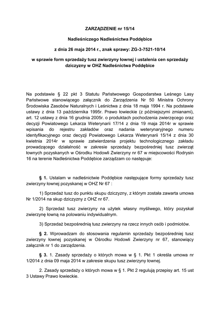 ZARZĄDZENIE nr 15/14 Nadleśniczego Nadleśnictwa Poddębice z