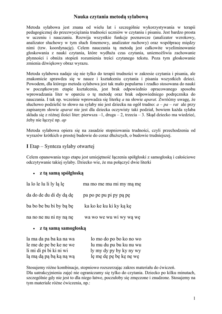 Nauka czytania metodą sylabową Metoda sylabowa jest znana od wielu lat i szczególnie wykorzystywania w terapii pedagogicznej do przezwyciężania trudności uczniów w czytaniu i pisaniu. Jest bardzo prosta w uczeniu i nauczaniu. Rozwija wszystkie funkcje poznawcze (analizator wzrokowy, analizator słuchowy w tym słuch fonemowy, analizator ruchowy) oraz współpracę między nimi (tzw. koordynację). Celem nauczania tą metodą jest całkowite wyeliminowanie głoskowania z nauki czytania, które wydłuża czas czytania, uniemożliwia zachowanie płynności i obniża stopień rozumienia treści czytanego tekstu. Poza tym głoskowanie zmienia dźwiękowy obraz wyrazu. Metoda sylabowa nadaje się nie tylko do terapii trudności w zakresie czytania i pisania, ale znakomicie sprawdza się w nauce i kształceniu czytania i pisania wszystkich dzieci. Powodem, dla którego metoda sylabowa jest tak mało popularna i rzadko stosowana do nauki w początkowym etapie kształcenia, jest brak odpowiednio opracowanego sposobu wprowadzania liter w oparciu o tę metodę oraz brak odpowiedniego podręcznika do nauczania. I tak np. wcześnie wprowadza się literkę a na słowie aparat. Zwróćmy uwagę, że słuchowo podzielić to słowo na sylaby nie jest dziecku na ogół trudno: a – pa – rat ale przy zapisanym słowie aparat nie jest dla dziecka oczywisty taki podział, bowiem każda sylaba składa się z różnej ilości liter: pierwsza –1, druga – 2, trzecia – 3. Skąd dziecko ma wiedzieć, żeby nie łączyć np. ap Metoda sylabowa opiera się na zasadzie stopniowania trudności, czyli przechodzenia od wyrazów krótkich o prostej budowie do coraz dłuższych, o budowie trudniejszej. I Etap – Synteza sylaby otwartej Celem opanowania tego etapu jest umiejętność łączenia spółgłoski z samogłoską i całościowe odczytywanie takiej sylaby. Dziecko wie, że ma połączyć dwie literki z tą samą spółgłoską la lo le lu li ly lą lę ma mo me mu mi my mą mę da do de du di dy dą dę pa po pe pu pi py pą pę ba bo be bu bi by bą bę ka ko ke ku ki ky ką kę na no ne nu ni ny ną nę wa wo we wu wi wy wą wę z tą samą samogłoską la ma da pa ba ka na wa le me de pe be ke ne we li mi di pi bi ki ni wi lą mą dą pą bą ką ną wą lo mo do po bo ko no wo lu mu du pu bu ku nu wu ly my dy py by ky ny wy lę mę dę pę bę kę nę wę Stosujemy różne kombinacje, stopniowo rozszerzając zakres materiału do ćwiczeń. Dla uatrakcyjnienia zajęć nie ograniczamy się tylko do czytania. Dziecko po kilku minutach, szczególnie gdy nie jest to dla niego łatwe, poczułoby się zmęczone i znudzone. Stosujemy na tym materiale różne ćwiczenia, np.: 1 - wskazywanie sylaby wypowiadanej przez prowadzącego, zapisywanie sylaby z jednoczesnym wypowiadaniem jej, wyszukiwanie określonej sylaby w wyrazie, wyszukiwanie określonej sylaby w czasopismach, wycinanie jej, wklejanie do zeszytu, układanie z ruchomego alfabetu II Etap – łączenie dwóch sylab otwartych w wyrazy Czytanie wyrazów sylabami i całościowo. lala baba jaja papa data pada mapa rano pole łapa kino waza zupa fala kura data pada tama mapa luty rano pole fala sala woda ryba łapa waza zupa gapa hala żaba Ala Ela Ewa Ula Iza Dana Jola Lena Cela Tola Mira Aga Tworzenie wyrazów z sylab – łączenie linią odpowiednich sylab i zapisywanie utworzonych wyrazów. Ka ta ma no ta ra ma ga wa mi ki sa Uzupełnianie brakujących sylab Mewa lody woda ława sowa kawa koza rowy kura kino wozy koło Me.. lo.. wo.. ła.. so.. ka.. ko.. Wo.. me ka.. so.. ko.. lo.. ła.. ku.. ki.. wo.. ko.. ko.. ki.. ro.. ku.. wo.. Układanie wyrazów z liter ruchomego alfabetu Układanie podpisów do obrazków – loteryjki sylabowo – obrazkowe ma – ki ko - za ro.. li – sy Dobieranie sylaby do stałej początkowej, układanie i zapisywanie wyrazów -sy -ra no- -gi -wa 2 III. Etap – wprowadzenie zdań i tekstów złożonych z wyrazów dwusylabowych (sylaby otwarte) Tola lubi lody. Ewa woli soki. Mama kupi lody i soki. Rano mama daje sery i jaja. Poda kawę. Tato pije kawę i mama pije kawę. Tato lubi kawę. Ala woli soki. IV. Etap – wprowadzenie wyrazów wielosylabowych zlożonych z sylab otwartych czytanie wyrazów sylabami i całościowo. cebula banany fasola sałata buraki jagoda malina morele topola patyki motyle koguty zające papuga żyrafa owoce bilety fotele robota balony gotuje pomaga ląduje litery Dorota Agata Monika Maryla Danuta gazeta zabawa wizyta rowery robimy pakuje tworzenie wyrazów z sylab –przestawianie kolejności ze ga ta…………………………………. ta ła sa………………………………...... ny ba lo……………………………….... li ry te .................................................... we ry ro ................................................. fa la so ............................................... uzupełnianie wyrazów brakującymi sylabami sałata cebula kolega karuzela pomidory wesele sa..ta ..bula ko..ga ka..ze.. ..mido.. ....le Czytanie zdań sylabami i wyrazami. Irena i Danuta idą na jagody. Dorota lubi sałatę i fasolę. Eliza kupuje fasolę, cebulę i sałatę. Agata i Karolina kupiły lody owocowe na patyku. To są lody jagodowe i malinowe. Rozsypanki wyrazowe ryby. łowi Tata pije Mama kawę. owocowe je lody. Danuta 3 V Etap – wprowadzenie sylaby zamkniętej Tworzenie wyrazu przez dodanie do sylaby otwartej spółgłoski La-s li-s lo-k le-k ló-d bu-t ba-r ba-l bą-k do-m da-ch dy-m dą-b ra-k ru-ch ro-k so-k so-s sa-d se-n sy-n no-c no-s ko-t ko-c je-ż zą-b wą-ż wą-s s lo t k ko k t Tworzenie wyrazów przez zmianę sylaby początkowej. lo li bo lo ma s k no ra la ro so ko ko s 4 VI. Etap – wprowadzenie wyrazów dwusylabowych o budowie sylaba otwarta + zamknięta. Czytanie wyrazów sylabami i całościowo. balon baran basen biwak domek dywan kotek kubek kogut kajak lasek lisek fotel motyl murek nosek nurek pasek palec pokój pilot ranek rower rynek