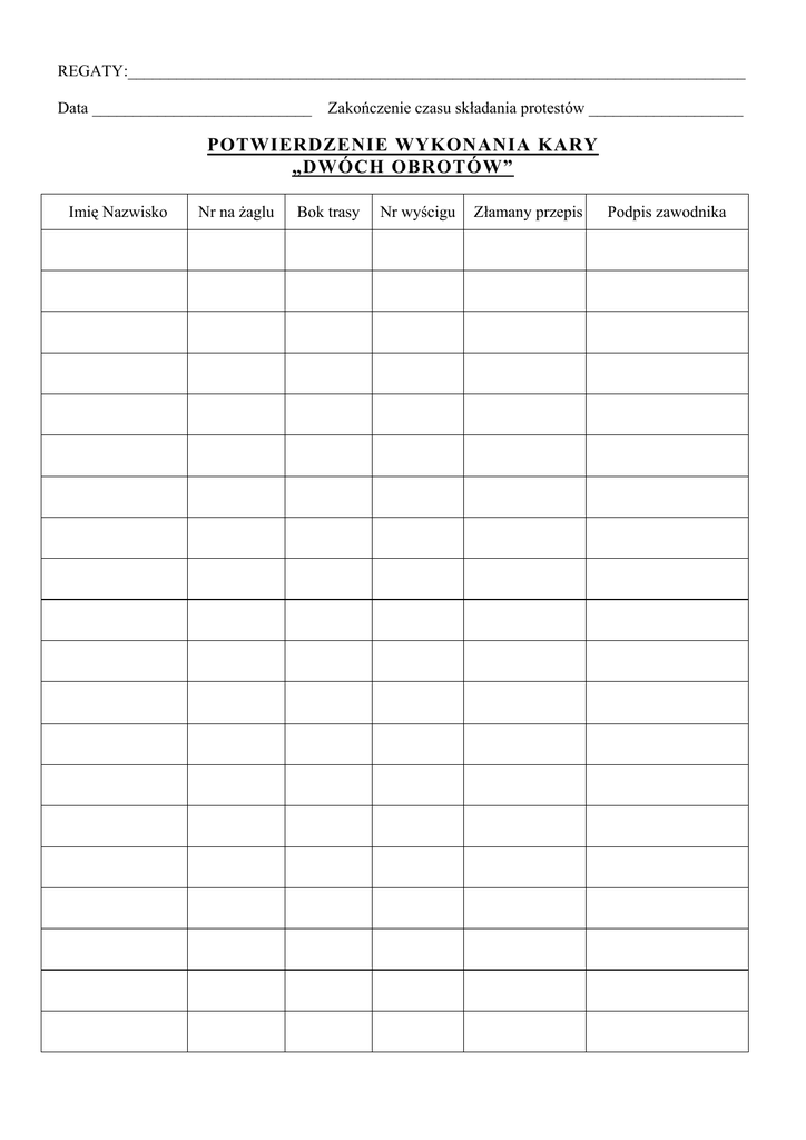 REGATY:____________________________________________________________________________ Data ___________________________ Zakończenie czasu składania protestów ___________________ POTWIERDZENIE WYKONANIA KARY „DWÓCH OBROTÓW” Imię Nazwisko Nr na żaglu Bok trasy Nr wyścigu Złamany przepis Podpis zawodnika
