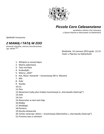 Piccolo Coro Calasanziano parafialno-szkolny chór dziecięcy u Ojców Pijarów w Warszawie na Siekierkach Spektakl muzyczny: Z MAMĄ I TATĄ W ZOO piosenki chóralne, wiersze Jana Brzechwy opr. MTW 2015 Niedziela, 14 czerwca 2015 godz. 12.15 Teatr u Pijarów na Siekierkach 1. Witajcie w naszej bajce 2. Mama zadumana 3. Tata ma fiata 4. Krokodylll… 5. Wiersz „ZOO” 6. Kot, Mysz i Kanarek – inscenizacja (W.A. Mozart) 7. Miś 8. Żubr 9. Kwoka 10.Lis 11.Pies 12.Akwarium (ryby plus kraby) inscenizacja (z „Karnawału Zwierząt”) 13.Dzik 14.Coś 15.Nosorożec w tam-tam bije 16.Małpy 17.Wielbłąd 18.Pantera 19.Kaczka dziwaczka 20.Taniec zwierząt i dzieci – inscenizacja (Skamieliny z „Karnawału Zwierząt”) 21.Prosimy was o uśmiech WITAJCIE W NASZEJ BAJCE CHÓR: Witajcie w naszej bajce, słoń zagra na fujarce, Pinokio nam zaśpiewa, zatańczą wkoło drzewa, NELLA: BIANKA: JULKA R.: MARYSIA SZ.: Tu wszystko jest możliwe, zwierzęta są szczęśliwe, A dzieci wiem coś o tym latają samolotem. Nikt tutaj nie zna głodu, nikt tu nie czuje chłodu I nawet ja nie kłamię, nikt się nie skarży mamie. CHÓR: Witajcie w naszej bajce, słoń zagra na fujarce, Pinokio nam zaśpiewa, zatańczą wkoło drzewa, ? OLIWIA S. Bo z wami jest weselej, ruszymy razem w knieje, A w kniejach i dąbrowach przygoda już się chowa. CHÓR: My ją znajdziemy sami, my chłopcy z dziewczętami, A wtedy daję słowo, że będzie kolorowo. _____________________________________________ MAMA ZADUMANA CHÓR: 1. Mama krząta się w kuchni od rana Myśli wciąż o niebieskich migdałach Gdy spytamy, co ugotowała MAMA: „Dziś dla was pieczeń mam z hipopotama!” Ref. Nasza mama, mama zadumana Mama zadumana cały dzień błądzi myślami daleko, codziennie przypala mleko na łące zrywa kwiaty, i sól sypie do herbaty! IGNACY: 2. Nasza mama wspaniała kucharka Krokodyla wrzuciła do garnka krasnoludek wpadł jej do sałaty a w piecu piecze się zegarek Taty CHÓR: Ref. Nasza mama, mama zadumana Mama zadumana cały dzień błądzi myślami daleko, codziennie przypala mleko na łące zrywa kwiaty, i sól sypie do herbaty! TYMEK, MACIEK, KACPER 3. Ten krokodyl co uciekł z ogródka w przedpokoju chciał zjeść krasnoludka choć zegarek czuje się fatalnie lecz obiad był dziś bardzo punktualnie. CHÓR: Ref. Nasza mama, mama zadumana…. _____________________________________________ NASZ TATA FIATA MA ANTOSIA, NELLA, WERONIKA H.: Nasz tata fiata ma i kiedy jedzie fiatem BIANKA, OLIWIA W.: To silnik pięknie gra, piosenkę śpiewa fiat! KLARA ŁASKA (rec.): Tato, tato, zawieź nas do ZOO!!! CHÓR: Tata, tata jedzie fiatem, wiezie dzieci piegowate, Wiezie, wiezie swą rodzinę, 70, 80 na godzinę! Kierownica, sprzęgło, gaz, tata fiatem, tata fiatem wiezie nas! Ta-ta-ta-ta ta-ta-ta-ta… ANTOSIA, NELLA, WERONIKA H.: Zielono szumi las, wesoło dudni most BIANKA, OLIWIA W.: a tutaj sprzęgło gaz i naszej Mamy głos: EWA L. (rec.): CHÓR: „Kaziu nie wyprzedzaj tego volkswagena! ZOO nie zając, nie ucieknie!” Tata golfa chce wyprzedzić, lecz przy Tacie Mama siedzi, dba o dzieci piegowate, o rodzinę, o maszynę i o Tatę. Kierownica sprzęgło gaz Tata czuwa Tata czuwa cały czas! Ta-ta-ta-ta ta-ta-ta-ta… ANTOSIA, NELLA, WERONIKA H.: Za nami parę miast, za nami mała wieś. BIANKA, OLIWIA W.: A w ZOO czeka nas żyrafa, słoń i lew KLARA ŁASKA, EWA L. (rec.):I hipopotam, struś, papuga i kangur! Tato! Gazu! CHÓR: Mamo nie patrz tak na tatę, jakby tata był piratem. Nam tak spieszno do przygody By zwierzęta, w naszym ZOO poznać nowe! Kierownica sprzęgło gaz Tato zawieź, jak najszybciej zawieź nas! Ta-ta-ta-ta ta-ta-ta-ta… _____________________________________________ KROKODYLLL… KINGA: Dzisiaj wszyscy razem spróbujemy zapamiętać Jakimi językami mówią wszystkie zwierzęta. CHÓR: CHÓR: CHÓR: CHÓR: CHÓR: CHÓR: KINGA: Jak robi piesek? A kotek? Osiołek? A krowa? A wrona? Owieczka? ……………………… ……………………… TYMEK IGNACY ZOŚKA ANITA, ŁUCJA No, a krokodyl? No, a krokodyl? HAU, HAU MIAU IA, IA MUUUuuu KRA, KRA BEEEEeee CHÓR: A czy krokodyl mówi coś? Czy ktoś to wie, czy słyszał ktoś? Podobno szybko pływa i w wodzie go nie widać, a ostre swe zębiska ze złością wciąż zaciska, lecz kiedy jest w humorze, czy przemówić do nas może? A czy krokodyl mówi coś? Czy ktoś to wie, czy słyszał ktoś? Czy czasem nie marudzi, czy nie pożera ludzi, i śmieje się, bo płaczu już ma dość. MARYSIA, JAGODA: Czytam mądre książki, nic nie napisano, zdaje się, że jeszcze nigdy tego nie zbadano! Lecz jeśli gdzieś na świecie żyje ktoś kto wie jak jest, To ja pytanie swe powtórzyć chcę! CHÓR: ref: A czy krokodyl mówi coś?... _____________________________________________ ZOO (wiersz) ANIELKA PISARSKA: Matołek raz zwiedzał zoo I wołał co chwila: WERONIKA HOFF.: „O-o! Jaka brzydka papuga! Żyrafa jest za długa! Słoń za wysoki! A po co komu te foki? Zebra ma farbowane żebra! Tygrys – chętnie by mnie stąd wygryzł! No, a zajrzyjmy pod daszek: Żłów – Tuś, bratku, Tuś! A to? Ptaszek! Niezły ptaszek – Struś!” ANIELKA PISARSKA: Wreszcie zbliża się do wielbłąda, Uważnie mu się przygląda I powiada wskazując na niego przez kraty: WERONIKA: „Owszem, niezły. Niczego! Szkoda tylko, że garbaty!” _____________________________________________ KOT, MYSZ I KANAREK (inscenizacja) KLARA W., MIŁKA, DOMINIKA SAWICKA _____________________________________________ MIŚ DANUSIA: Proszę państwa, oto miś. Miś jest bardzo grzeczny dziś. Chętnie państwu łapę poda. Nie chce podać? A to szkoda. _____________________________________________ KWOKA ZUZIA POLOCZEK: Proszę pana, pewna kwoka Traktowała świat z wysoka I mówiła z przekonaniem: EWA CIURZYŃSKA: „Grunt to dobre wychowanie!” ZUZIA POLOCZEK: Zaprosiła raz więc gości, By nauczyć ich grzeczności. Pierwszy osioł wszedł, a przy tym W progu garnek stł