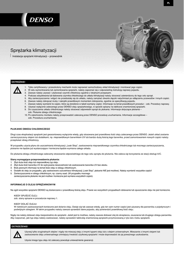 PL Sprężarka klimatyzacji Instalacja sprężarki klimatyzacji – przewodnik OSTROŻNIE! 1. 2. 3. 4. 5. 6. 7. 8. 9. ylko certyfikowany i przeszkolony mechanik może naprawiać samochodowy układ klimatyzacji i montować jego części. T W celu wymontowania lub zamontowania sprężarki, należy zapoznać się z odpowiednią instrukcją naprawy pojazdu. Zawsze należy używać i utylizować czynnik chłodniczy zgodnie z lokalnymi przepisami. Podczas odzyskiwania lub ładowania czynnika chłodniczego do układu klimatyzacji należy stosować zatwierdzony do tego celu sprzęt. Aby zanieczyszczenia i wilgoć nie przedostały się do układu, należy zamykać otwarte złączki natychmiast po odłączeniu przewodów i innych części. Zawsze należy dokręcać śruby i nakrętki prawidłowym momentem dokręcenia, zgodnie ze specyfikacją pojazdu. Zawsze należy wymienić te części, które są określone w tabeli wymiany części. Informacje na temat prawidłowych procedur – zob. Procedury naprawy. Używać wyłącznie zalecanego przez DENSO oleju sprężarkowego, w sposób opisany na tabliczce znamionowej sprężarki. Do czyszczenia układu chłodniczego należy stosować odpowiedni sprzęt do płukania. Informacje dotyczące płukania – zob. Płukanie obiegu chłodniczego. 10.Po zakończeniu montażu należy przeprowadzić zalecaną przez DENSO procedurę uruchamiania. Informacje szczegółowe – zob. Procedura uruchamiania. PŁUKANIE OBIEGU CHŁODNICZEGO Długi czas eksploatacji sprężarki jest gwarantowany wyłącznie wtedy, gdy stosowana jest prawidłowa ilość oleju zalecanego przez DENSO. Jeżeli układ zostanie zanieczyszczony olejem lub dodatkami, np. nieprawidłowym barwnikiem UV lub bardzo dużą ilością tego barwnika, przed zamontowaniem nowych części należy przepłukać obieg chłodniczy. W przypadku użycia płynu do uszczelniania klimatyzacji „Leak Stop”, zastosowania nieprawidłowego czynnika chłodniczego lub mocnego zanieczyszczenia, płukanie nie będzie już wystarczające i konieczna będzie wymiana całego układu. Do płukania obiegu chłodniczego zalecamy stosowanie odpowiedniego do tego celu sprzętu do płukania. Nie zaleca się korzystania ze stacji obsługi A/C. Stany wymagające przeprowadzenia płukania: 1. Zbyt duża ilość oleju lub nieprawidłowy typ oleju. 2. Zbyt duża ilość barwnika UV do wykrywania nieszczelności lub zastosowanie barwnika UV bez atestu. 3. Brak pewnych informacji na temat ilości oleju w obiegu chłodniczym. 4. Dodatki do oleju (w przypadku, gdy zastosowano uszczelniacz klimatyzacji „Leak Stop”, płukanie NIE jest możliwe). Należy wymienić wszystkie części! 5. Zanieczyszczenia w obiegu chłodniczym, np. czarny osad. (W przypadku mocnego zanieczyszczenia płukanie nie jest możliwe i konieczna jest wymiana wszystkich części). INFORMACJE O OLEJU SPRĘŻARKOWYM Na ogół wszystkie sprężarki DENSO są dostarczane z prawidłową ilością oleju. Prawie we wszystkich przypadkach dolewanie lub spuszczanie oleju nie jest konieczne. IEDY SPUŚCIĆ OLEJ: K zob. stany opisane w procedurze naprawy 1. IEDY DOLAĆ OLEJU: K W niektórych zastosowaniach konieczne jest dolanie oleju. Dzieje się tak zawsze wtedy, gdy ten sam numer części jest używany dla parownika z pojedynczym i podwójnym obiegiem. W takim przypadku należy zawsze sprawdzić dane pojazdu, aby potwierdzić prawidłową ilość oleju. Nigdy nie należy dolewać oleju bezpośrednio do sprężarki. Jeżeli jest to możliwe, należy zawsze dolewać olej do skraplacza, osuszacza lub drugiego obiegu parownika. Aby rozpoznać, jaki typ oleju należy zastosować, należy sprawdzić tabliczkę znamionową sprężarki przymocowaną z tyłu lub z boku sprężarki. OSTRZEŻENIE! żywaj tylko oryginalnych olejów i nigdy nie mieszaj oleju z innymi typami oleju lub z olejem uniwersalnym. Mieszanie z innymi olejami lub U zastosowanie oleju uniwersalnego zmniejszy trwałość użytkową sprężarki i może doprowadzić do jej poważnego uszkodzenia. Użycie innego typu oleju niż zalecany powoduje unieważnienie gwarancji. PL PROCEDURA URUCHAMIANIA Po zakończeniu montażu należy przeprowadzić opisaną poniżej procedurę uruchamiania sprężarki. Celem tej procedury jest rozprowadzenie oleju sprężarkowego i rozpoczęcie smarowania, aby uniknąć uszkodzenia sprężarki zaraz po zakończeniu montażu. 1) Ustawić temperaturę na maksymalne chłodzenie. 2) Ustawić dmuchawę na najwyższą prędkość. 3) Włączyć silnik i pozostawić go na prędkości biegu jałowego. 4) Włączyć klimatyzację na minimum 5 minut. NIE ZWIĘKSZAĆ PRĘDKOŚCI OBROTOWEJ SILNIKA! 5) Po upływie 5 minut cały olej sprężarkowy znajdujący się w sprężarce zostanie rozprowadzony po układzie. Teraz można bezpiecznie zwiększyć prędkość obrotową silnika i sprawdzić klimatyzację. INSTRUKCJA MONTAŻU Aby określić, którą procedurę naprawczą należy zastosować, najpierw należy sprawdzić czystość obiegu chłodniczego. Po wymontowaniu starej sprężarki należy sprawdzić port ssawny, port tłoczny i przewód ssawny. W zależności od sytuacji, należy przeprowadzić procedurę 1, 2, 3 lub 4. Procedura 1: Płukanie nie jest konieczne > Spuścić nadmiar oleju z nowej sprężarki. Stan: a) Układ jest czysty. b) W obiegu znajduje się prawidłowy typ oleju. c) Stosowana jest prawidłowa ilość i prawidłowy typ barwnika UV wykrywającego nieszczelność. d) W obiegu chłodniczym nie ma żadnych dodatków. Przewodnik montażowy: Zob. tabela wymiany części, aby potwierdzić właściwe części do wymiany. Aby sprawdzić jaką ilość oleju spuścić ze sprężarki, należy skorzystać z poniższego wzoru. A = Całkowita ilość oleju nowej sprężarki. B = Ilość oleju spuszczona ze starej sprężarki. C = Ilość, jaką trzeba spuścić z nowej sprężarki. zór pozwalający na obliczenie prawidłowej ilości oleju, jaką trzeba spuścić W z nowej sprężarki: A-B=