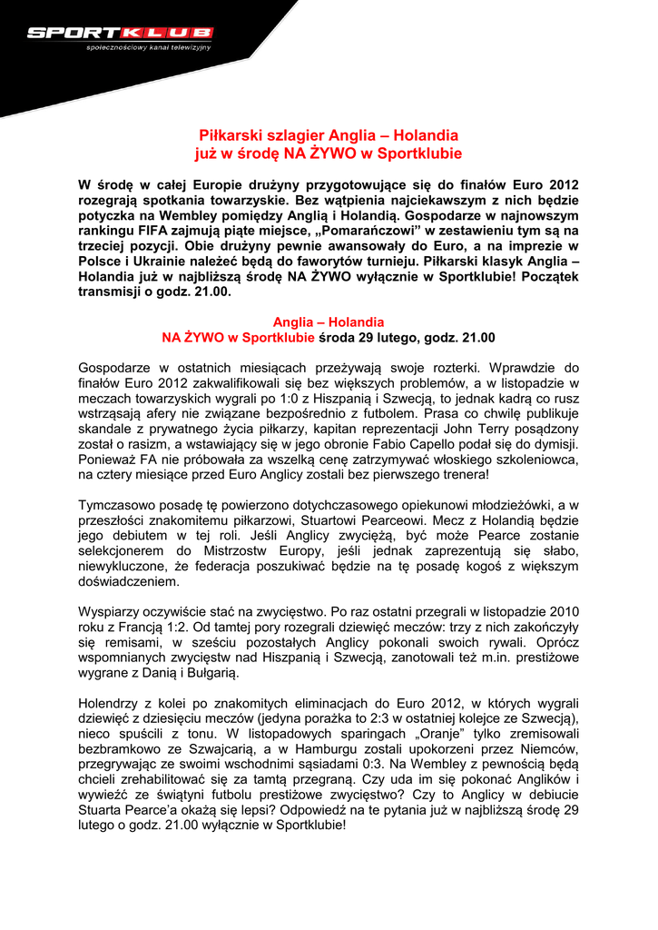 Piłkarski szlagier Anglia – Holandia już w środę NA ŻYWO w Sportklubie W środę w całej Europie drużyny przygotowujące się do finałów Euro 2012 rozegrają spotkania towarzyskie. Bez wątpienia najciekawszym z nich będzie potyczka na Wembley pomiędzy Anglią i Holandią. Gospodarze w najnowszym rankingu FIFA zajmują piąte miejsce, „Pomarańczowi” w zestawieniu tym są na trzeciej pozycji. Obie drużyny pewnie awansowały do Euro, a na imprezie w Polsce i Ukrainie należeć będą do faworytów turnieju. Piłkarski klasyk Anglia – Holandia już w najbliższą środę NA ŻYWO wyłącznie w Sportklubie! Początek transmisji o godz. 21.00. Anglia – Holandia NA ŻYWO w Sportklubie środa 29 lutego, godz. 21.00 Gospodarze w ostatnich miesiącach przeżywają swoje rozterki. Wprawdzie do finałów Euro 2012 zakwalifikowali się bez większych problemów, a w listopadzie w meczach towarzyskich wygrali po 1:0 z Hiszpanią i Szwecją, to jednak kadrą co rusz wstrząsają afery nie związane bezpośrednio z futbolem. Prasa co chwilę publikuje skandale z prywatnego życia piłkarzy, kapitan reprezentacji John Terry posądzony został o rasizm, a wstawiający się w jego obronie Fabio Capello podał się do dymisji. Ponieważ FA nie próbowała za wszelką cenę zatrzymywać włoskiego szkoleniowca, na cztery miesiące przed Euro Anglicy zostali bez pierwszego trenera! Tymczasowo posadę tę powierzono dotychczasowego opiekunowi młodzieżówki, a w przeszłości znakomitemu piłkarzowi, Stuartowi Pearceowi. Mecz z Holandią będzie jego debiutem w tej roli. Jeśli Anglicy zwyciężą, być może Pearce zostanie selekcjonerem do Mistrzostw Europy, jeśli jednak zaprezentują się słabo, niewykluczone, że federacja poszukiwać będzie na tę posadę kogoś z większym doświadczeniem. Wyspiarzy oczywiście stać na zwycięstwo. Po raz ostatni przegrali w listopadzie 2010 roku z Francją 1:2. Od tamtej pory rozegrali dziewięć meczów: trzy z nich zakończyły się remisami, w sześciu pozostałych Anglicy pokonali swoich rywali. Oprócz wspomnianych zwycięstw nad Hiszpanią i Szwecją, zanotowali też m.in. prestiżowe wygrane z Danią i Bułgarią. Holendrzy z kolei po znakomitych eliminacjach do Euro 2012, w których wygrali dziewięć z dziesięciu meczów (jedyna porażka to 2:3 w ostatniej kolejce ze Szwecją), nieco spuścili z tonu. W listopadowych sparingach „Oranje” tylko zremisowali bezbramkowo ze Szwajcarią, a w Hamburgu zostali upokorzeni przez Niemców, przegrywając ze swoimi wschodnimi sąsiadami 0:3. Na Wembley z pewnością będą chcieli zrehabilitować się za tamtą przegraną. Czy uda im się pokonać Anglików i wywieźć ze świątyni futbolu prestiżowe zwycięstwo? Czy to Anglicy w debiucie Stuarta Pearce’a okażą się lepsi? Odpowiedź na te pytania już w najbliższą środę 29 lutego o godz. 21.00 wyłącznie w Sportklubie! Cztery poprzednie potyczki Holendrów z Anglikami kończyły się podziałem punktów. W ostatniej z nich, w sierpniu 2009 roku, padł remis 2:2. Dla „Pomarańczowych” bramki strzelali wówczas Dirk Kuyt i Rafael van der Vaart, autorem obu goli dla Anglików był Jermain Defoe. Zanim kibicie zobaczą w akcji pierwszą reprezentację Wyspiarzy, będą mieli okazję przyjrzeć się, w jakiej formie znajduje się jej bezpośrednie zaplecze – w środę o godz. 18.30 w Sportklubie transmisja spotkania angielskiej młodzieżówki z rówieśnikami z Belgii. Eliminacje Młodzieżowych Mistrzostw Europy: Anglia – Belgia NA ŻYWO w Sportklubie środa 29 lutego, godz. 18.30 Młodzi Anglicy pewnie prowadzą w swojej grupie eliminacyjnej. Z pięciu dotychczasowych spotkań wygrali cztery, jedyną porażkę zanotowali w starciu z … Belgią. W listopadzie na Stade Charles Tondreau w Mons ulegli piłkarzom z Beneluksu 1:2 tracąc bramkę już w doliczonym czasie gry. Mimo tej porażki, Wyspiarze zajmują pierwsze miejsce w tabeli grupy 8 i pewnie zmierzają do finałów Młodzieżowych ME, które odbędą się w przyszłym roku w Izraelu. Jeśli w środę pokonają Belgów, na dwie kolejki przed końcem eliminacji będą już niemal pewni awansu do tego turnieju. Kontakt dla mediów: Jan Mierzejewski, PR and Marketing Coordinator, [email protected], tel. 502 292 601, ul. Domaniewska 41, 02-672 Warszawa Materiały do wykorzystania w kontekście transmisji Sportklubu: host: ftp.playout.hu; username: 3rdParty; password: thirdPARTY Sportklub w Internecie: www.sportklub.pl Facebook Google+ You Tube Sportklub dostępny jest na platformach cyfrowych „n” (kanał 117) i „Cyfra+” (kanał 128) oraz w ofercie większości operatorów kablowych, m.in. w UPC, Vectra, Multimedia i Aster. Jeśli nie chcą otrzymywać Państwo zapowiedzi programowych Sportklubu, lub jeśli życzą sobie Państwo otrzymywać informacje jedynie z wybranych dyscyplin sportowych prosimy o kontakt pod podany powyżej adres mailowy.