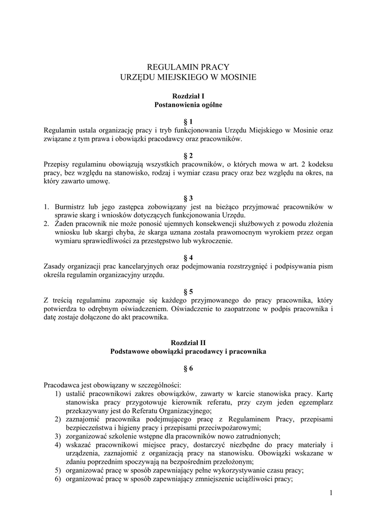 REGULAMIN PRACY URZĘDU MIEJSKIEGO W MOSINIE Rozdział I Postanowienia ogólne §1 Regulamin ustala organizację pracy i tryb funkcjonowania Urzędu Miejskiego w Mosinie oraz związane z tym prawa i obowiązki pracodawcy oraz pracowników. §2 Przepisy regulaminu obowiązują wszystkich pracowników, o których mowa w art. 2 kodeksu pracy, bez względu na stanowisko, rodzaj i wymiar czasu pracy oraz bez względu na okres, na który zawarto umowę. §3 1. Burmistrz lub jego zastępca zobowiązany jest na bieżąco przyjmować pracowników w sprawie skarg i wniosków dotyczących funkcjonowania Urzędu. 2. Żaden pracownik nie może ponosić ujemnych konsekwencji służbowych z powodu złożenia wniosku lub skargi chyba, że skarga uznana została prawomocnym wyrokiem przez organ wymiaru sprawiedliwości za przestępstwo lub wykroczenie. §4 Zasady organizacji prac kancelaryjnych oraz podejmowania rozstrzygnięć i podpisywania pism określa regulamin organizacyjny urzędu. §5 Z treścią regulaminu zapoznaje się każdego przyjmowanego do pracy pracownika, który potwierdza to odrębnym oświadczeniem. Oświadczenie to zaopatrzone w podpis pracownika i datę zostaje dołączone do akt pracownika. Rozdział II Podstawowe obowiązki pracodawcy i pracownika §6 Pracodawca jest obowiązany w szczególności: 1) ustalić pracownikowi zakres obowiązków, zawarty w karcie stanowiska pracy. Kartę stanowiska pracy przygotowuje kierownik referatu, przy czym jeden egzemplarz przekazywany jest do Referatu Organizacyjnego; 2) zaznajomić pracownika podejmującego pracę z Regulaminem Pracy, przepisami bezpieczeństwa i higieny pracy i przepisami przeciwpożarowymi; 3) zorganizować szkolenie wstępne dla pracowników nowo zatrudnionych; 4) wskazać pracownikowi miejsce pracy, dostarczyć niezbędne do pracy materiały i urządzenia, zaznajomić z organizacją pracy na stanowisku. Obowiązki wskazane w zdaniu poprzednim spoczywają na bezpośrednim przełożonym; 5) organizować pracę w sposób zapewniający pełne wykorzystywanie czasu pracy; 6) organizować pracę w sposób zapewniający zmniejszenie uciążliwości pracy; 1 7) przeciwdziałać dyskryminacji w zatrudnieniu; 8) przeciwdziałać mobbingowi; 9) zapewnić bezpieczne i higieniczne warunki pracy; 10) zapoznać pracowników z zasadami systemu wynagradzania oraz terminowo wypłacać wynagrodzenia; 11) ułatwić pracownikom podnoszenie kwalifikacji zawodowych; 12) stosować obiektywne i sprawiedliwe kryteria oceny pracowników oraz wyników ich pracy; 13) zaspokajać, w miarę posiadanych środków, socjalne potrzeby pracowników; 14) prowadzić dokumentację w sprawach związanych ze stosunkiem pracy oraz akta osobowe; 15) wydać świadectwo pracy pracownikowi w związku z rozwiązaniem lub wygaśnięciem stosunku pracy; 16) poinformować pracownika od którego pobierane są dane osobowe o celach, zakresie przetwarzania i prawie wglądu do danych osobowych. §7 1. Pracownik Urzędu obowiązany jest wykonywać powierzone mu zadania z uwzględnieniem interesu Gminy, interesu Państwa oraz indywidualnych interesów obywateli. 2. Do obowiązków pracownika Urzędu należy w szczególności: 1) wykonywanie powierzonych zadań sumiennie, sprawnie i bezstronnie; 2) bieżące zaznajamianie się z przepisami prawa dotyczącymi zakresu pełnionych obowiązków oraz ich bezwzględne przestrzeganie; 3) zachowanie uprzejmości i życzliwości w kontaktach ze zwierzchnikami, podwładnymi, współpracownikami oraz w kontaktach z obywatelami; 4) zachowanie tajemnicy określonej w odrębnych przepisach; 5) przechowywanie dokumentów i innych nośników informacji w miejscu do tego przeznaczonym, a po zakończeniu pracy odpowiednie ich zabezpieczenie przed dostępem innych nieuprawnionych pracowników oraz osób trzecich; 6) udzielanie obywatelowi niezbędnych informacji potrzebnych dla załatwienia sprawy; 7) dbałość o mienie Urzędu oraz oszczędne wykorzystywanie powierzonego sprzętu i materiałów; 8) przestrzeganie czasu pracy ustalonego w Urzędzie; 9) wykorzystywanie czasu pracy w pełni na wykonywanie obowiązków pracowniczych; 10) przyjmowanie obywateli wyłącznie w pomieszczeniach biurowych; 11) przestrzeganie Regulaminu i ustalonego w Urzędzie porządku; 12) przestrzeganie przepisów oraz zasad bezpieczeństwa i higieny pracy, a także przepisów przeciwpożarowych; 13) ubieranie się w sposób estetyczny, odpowiedni do powagi miejsca pracy i rangi pracownika samorządowego; 14) noszenie na widocznym miejscu w czasie pracy na terenie Urzędu identyfikatora z fotografią, informującego o imieniu i nazwisku, stanowisku pracy i referacie, w jakim pracownik jest zatrudniony; 15) przestrzeganie innych obowiązków wynikających z Regulaminu oraz przepisów prawa. 2 §8 Ciężkim naruszeniem obowiązków pracowniczych jest w szczególności: 1) złe i niedbałe wykonywanie pracy, psucie materiałów i urządzeń, a także wykonywanie prac nie związanych z zadaniami wynikającymi ze stosunku pracy; 2) nieprzybycie do pracy, spóźnianie się do pracy, samowolne jej opuszczanie bez usprawiedliwienia; 3) stawienie się do pracy w stanie po użyciu alkoholu, spożywanie alkoholu w czasie pracy, przebywanie na terenie zakładu pod jego działaniem lub wnoszenie alkoholu na teren zakładu; 4) zakłócanie porządku i spokoju w miejscu pracy; 5) niewykonywanie poleceń służbowych; 6) niewłaściwy stosunek do przełożonych i współpracowników; 7) nieprzestrzeganie przepisów i zasad bezpieczeństwa i higieny pracy oraz przepisów przeciwpożarowych; 8) ujawnianie wiadomości stanowiących tajemnicę państwową i służbową; 9) nadużywanie świadczeń z ubezpieczenia społecznego; 10) popełnienie przez pracownika w czasie trwania umowy o pracę przestępstwa, które uniemożliwia dalsze zatrudnianie go na zajmowanym stanowisku, jeżeli przestępstwo jest oczywiste lub zostało stwierdzone prawomocnym wyrokiem; 11) zawiniona przez pracownika