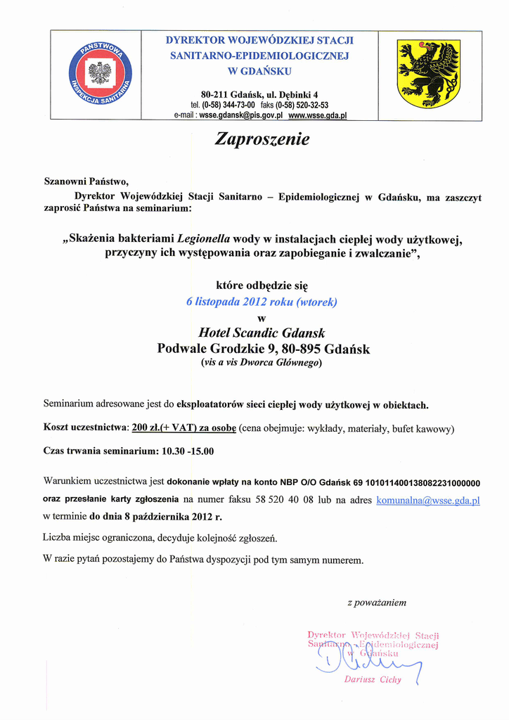 HARMONOGRAM SEMINARIUM „Skażenia bakteriami Legionella wody w instalacjach ciepłej wody użytkowej, przyczyny ich występowania oraz zapobieganie i zwalczanie”. 6 listopada 2012 roku (wtorek), Gdańsk, sala konferencyjna Hotelu Scandic Gdansk, Podwale Grodzkie 9, 80-895 Gdańsk 1. 10.30. -11.00. Rejestracja uczestników. 2. 11.00. – 11.30. Bakterie Legionella, charakterystyka i występowanie. Legionelloza. Katarzyna Waluszko, Oddział Higieny Komunalnej WSSE w Gdańsku 3. 11.30. – 12.10. Zapobieganie i zwalczanie bakterii z rodzaju Legionella w instalacjach wodnych w budynkach w świetle przepisów prawa. Występowanie bakterii z rodzaju Legionella w wodzie z instalacji ciepłej wody użytkowej w obiektach nadzorowanych przez PIS. Agnieszka Kietlińska, Oddział Higieny Komunalnej WSSE w Gdańsku 4. 12.10. – 12.40 Oznaczanie bakterii z rodzaju Legionella – metodyka. Hanna Raczyńska, Pracownia Badań Wody i Gleby Laboratorium Badań Środowiskowych WSSE w Gdańsku 5. 12.40. – 13.10 Przerwa kawowa 6. 13.10 – 13.50 Przygotowanie instalacji ciepłej wody użytkowej do przeprowadzania zabiegów usuwania bakterii Legionella, metody chemicznej renowacji instalacji c.w.u. przed zabiegiem dezynfekcji instalacji zakażonych bakterią Legionella. Jan Marjanowski UNITEX Centrum Badawczo – Wdrożeniowe UNITEX S.A. 7. 13.50 – 14.40 Wybrane metody termiczne i chemiczne dezynfekcji instalacji ciepłej wody użytkowej, porównanie metod, prognozowanie powodzenia zabiegów dezynfekcji instalacji c.w.u. zakażonych bakterią Legionella Jarosław Ostrowski UNITEX Centrum Badawczo – Wdrożeniowe UNITEX S.A. 8. 14.40 – 15.00 Dyskusja. KARTA ZGŁOSZENIA „Skażenia bakteriami Legionella wody w instalacjach ciepłej wody użytkowej, przyczyny ich występowania oraz zapobieganie i zwalczanie”. 6 listopada 2012 roku (wtorek), Gdańsk, sala konferencyjna Hotelu Scandic Gdansk, Podwale Grodzkie 9, 80-895 Gdańsk Wypełniony formularz zgłoszenia prosimy przesyłać na numer faksu: 58 520 40 08 lub a-mail [email protected] 1. Imię i nazwisko Stanowisko Telefon E-mail Kwota 2. Imię i nazwisko Stanowisko Telefon E-mail Kwota 3. Imię i nazwisko Stanowisko Telefon E-mail Kwota Σ RAZEM Koszt uczestnictwa 1 osoby w szkoleniu wynosi 200 zł i obejmuje koszt materiałów oraz poczęstunek. Do podanych cen nie doliczamy podatku VAT w przypadku podpisania niniejszego oświadczenia, tzn. kiedy uczestnictwo w seminarium jest finansowane w co najmniej 70% ze środków publicznych. W przeciwnym razie do powyższych cen zostanie doliczony podatek VAT w wysokości 23%. Oświadczam, iż środki wydatkowane na ww. seminarium pochodzą w co najmniej 70% ze środków publicznych w rozumieniu ustawy o finansach publicznych. Niniejsze oświadczenie ma na celu możliwość zastosowania stawki zwolnionej VAT zgodnie z art. 43 ust.1 pkt 29c ustawy o podatku od towarów i usług z dnia 11 marca 2004 r. z późn. zmianami. __________________________________________ Data, pieczątka, podpis DANE DO FAKTURY: Firma Ulica Kod NIP Miejscowość Faks Płatności prosimy realizować: Wojewódzka Stacja Sanitarno – Epidemiologiczna w Gdańsku NBP O/O Gdańsk 69 101011400138082231000000, w terminie do dnia 8 października 2012 r. Przesłanie karty zgłoszenia stanowi prawnie wiążące zobowiązanie do uczestnictwa w seminarium na warunkach w niej określonych. Rezygnacji z udziału w seminarium można dokonać wyłącznie w formie pisemnej (e-mail, fax, poczta), najpóźniej 7 dni roboczych przed seminarium. W przypadku otrzymania rezygnacji przez organizatora później niż na 7 dni roboczych przed dniem seminarium lub niezgłoszenia się uczestnika na seminarium zgłaszający zostanie obciążony pełnymi kosztami uczestnictwa, wynikającymi z przesłanej karty zgłoszenia, na podstawie wystawionej faktury VAT. __________________________________________ Data, pieczątka, podpis
