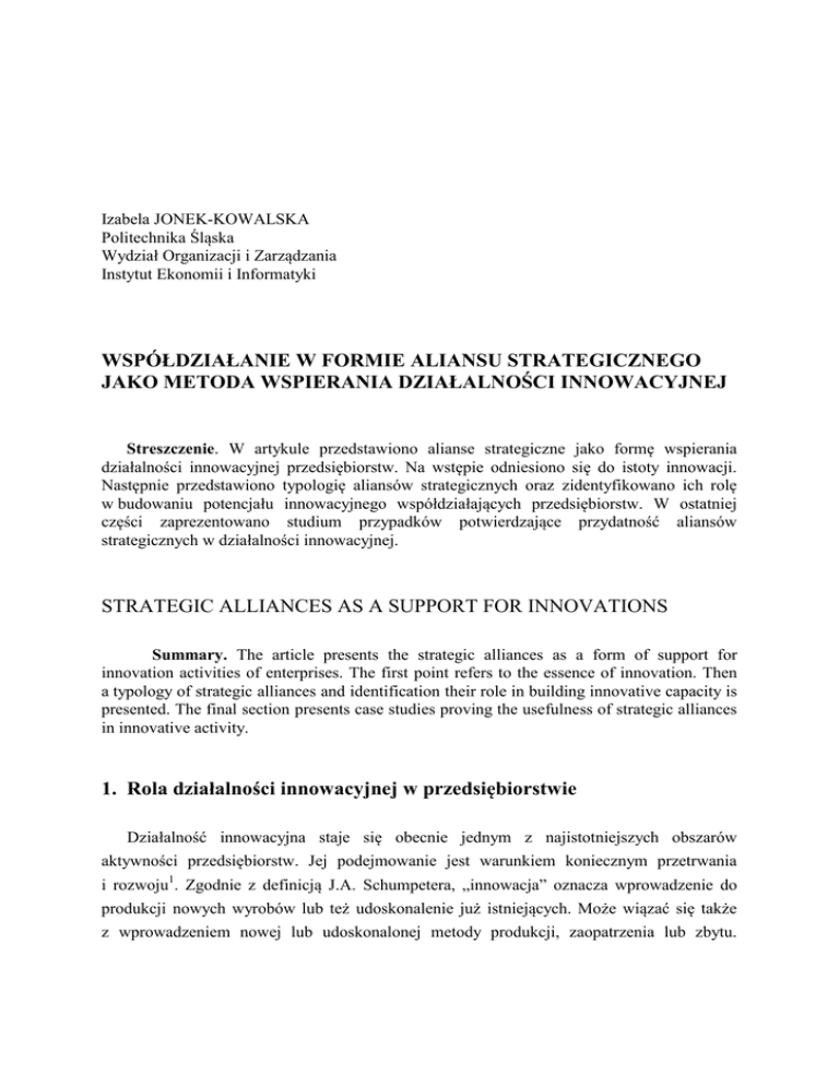 Izabela JONEK-KOWALSKA Politechnika Śląska Wydział Organizacji i Zarządzania Instytut Ekonomii i Informatyki WSPÓŁDZIAŁANIE W FORMIE ALIANSU STRATEGICZNEGO JAKO METODA WSPIERANIA DZIAŁALNOŚCI INNOWACYJNEJ Streszczenie. W artykule przedstawiono alianse strategiczne jako formę wspierania działalności innowacyjnej przedsiębiorstw. Na wstępie odniesiono się do istoty innowacji. Następnie przedstawiono typologię aliansów strategicznych oraz zidentyfikowano ich rolę w budowaniu potencjału innowacyjnego współdziałających przedsiębiorstw. W ostatniej części zaprezentowano studium przypadków potwierdzające przydatność aliansów strategicznych w działalności innowacyjnej. STRATEGIC ALLIANCES AS A SUPPORT FOR INNOVATIONS Summary. The article presents the strategic alliances as a form of support for innovation activities of enterprises. The first point refers to the essence of innovation. Then a typology of strategic alliances and identification their role in building innovative capacity is presented. The final section presents case studies proving the usefulness of strategic alliances in innovative activity. 1. Rola działalności innowacyjnej w przedsiębiorstwie Działalność innowacyjna staje się obecnie jednym z najistotniejszych obszarów aktywności przedsiębiorstw. Jej podejmowanie jest warunkiem koniecznym przetrwania i rozwoju1. Zgodnie z definicją J.A. Schumpetera, „innowacja” oznacza wprowadzenie do produkcji nowych wyrobów lub też udoskonalenie już istniejących. Może wiązać się także z wprowadzeniem nowej lub udoskonalonej metody produkcji, zaopatrzenia lub zbytu. 82 I. Jonek-Kowalska Wreszcie może także oznaczać zdobycie nowego rynku.2 Przez pojęcie innowacji rozumie się zatem zmianę w metodach wytwarzania lub w wyrobach, bazującą na nowej lub nie wykorzystanej dotąd wiedzy3. W definicji innowacji zaczerpniętej z „Oslo Manual” podkreśla się dodatkowo, że innowacyjny proces lub produkt są nowe, przynajmniej z punktu widzenia wprowadzającego je przedsiębiorstwa4. Taka interpretacja znacznie rozszerza zakres działalności innowacyjnej. Podstawowa klasyfikacja, bazująca na powyższej definicji, wyróżnia innowacje produktowe i procesowe5. Pierwsze oznaczają wprowadzenie nowego produktu lub rozwiązanie zmieniającego produkt już istniejący. Drugie wiążą się z działaniami wprowadzającymi zmiany w procesach produkcji, zaopatrzenia lub zbytu w przedsiębiorstwie6. Zgodnie z powyższym, prowadzenie przez przedsiębiorstwa działalności innowacyjnej wymaga zdobycia nowej, niewykorzystanej dotąd wiedzy. Proces jej zdobywania i wdrażania jest czasochłonny, trudny i obarczony ryzykiem7. Wymaga również znacznych nakładów finansowych. Dlatego też przedsiębiorstwa poszukują szybkich, skutecznych i efektywnych metod wspierania działalności innowacyjnej. Jedną z nich jest utworzenie aliansu strategicznego. W niniejszym artykule przedstawiono rolę aliansu strategicznego w zdobywaniu nowej wiedzy i wykorzystywaniu jej dla potrzeb działalności innowacyjnej. W części teoretycznej zdefiniowano pojęcie aliansu strategicznego oraz dokonano przeglądu typowych form tego porozumienia. Następnie podjęto próbę wskazania najprzydatniejszych dla wspierania innowacji, typów aliansów strategicznych. Określono zalety tych porozumień. Wskazano także wady i zagrożenia, które mogą z nich wynikać. W części praktycznej przedstawiono funkcjonowanie aliansów strategicznych i ich rolę we wspieraniu działalności innowacyjnej na wybranych przykładach. 1 Drucker P.: Innowacja i przedsiębiorczość. Praktyka i zasady. PWE, Warszawa 1992, s. 272; Drucker P.: Natchnienie i fart, czyli innowacja i przedsiębiorczość. Praktyka i zasady. PWE, Warszawa 1992, s. 21 i nast. 2 Głodek P., Gołębiowski M.: Transfer technologii w małych i średnich przedsiębiorstwach. SOOIPP, Warszawa 2006, s. 7. 3 Brzeziński M (red.): Zarządzanie innowacjami technologicznymi i organizacyjnymi. Difin, Warszawa 2001, s. 19; Freeman Ch.: The Economics of Industrial Innovation. F. Printer, London 1982, s. 26. 4 OECD, Oslo Manual. The measurement of scientific and technological activities. Proposed Guidelines for Collecting and Interpreting Technological Innovation Data, OECD/Eurostat, Paris 1997. 5 Łobejko S.: Systemy informacyjne w zarządzaniu wiedzą i innowacją w przedsiębiorstwie. Szkoła Główna Handlowa, Warszawa 2005, s. 68. 6 Sosnowska A., Poznańska K.: Systemy wspierania innowacji i transferu technologii w krajach Unii Europejskiej i w Polsce. PARP, Warszawa 2003, s. 13-17. 7 Pomykalski A.: Zarządzanie innowacjami. PWN, Warszawa 2001, s. 33 i nast. Współdziałanie w formie aliansu… 83 2. Alianse strategiczne – metodyka tworzenia i typologia Alianse strategiczne to „długoterminowe powiązania kooperacyjne pomiędzy dwoma lub więcej przedsiębiorstwami w celu połączenia lub/i wymiany specyficznych zasobów partnerów dla osiągnięcia założonego celu”8. Są to zatem związki zawierane między niezależnymi przedsiębiorstwami, które postanawiają wspólnie prowadzić działalność gospodarczą lub realizować określony projekt, koordynując w tym celu kluczowe kompetencje, niezbędne zasoby i umiejętności9. Alians strategiczny może być tworzony zarówno pomiędzy przedsiębiorstwami konkurencyjnymi (alianse addytywne i komplementarne), jak i niekonkurencyjnymi (partnerstwo wertykalne, porozumienia między sektorowe, spółki joint venture) – rysunek 1.10 ALIANSE STRATEGICZNE PRZESDIĘBIORSTW KONKURENCYJNYCH addytywne komplementarne ścisła integracja PRZEDSIEBIORSTW NIEKOKURENCYJNYCH partnerstwo wertykalne porozumienia międzysektorowe spółki joint venture Rys. 1. Podział aliansów strategicznych Fig. 1. Strategic alliances classification Źródło: Chwistecka-Dudek H., Sroka W.: Alianse strategiczne. Problemy teorii i dylematy praktyki. Profesjonalna Szkoła Biznesu, Kraków 2002, s. 69. P