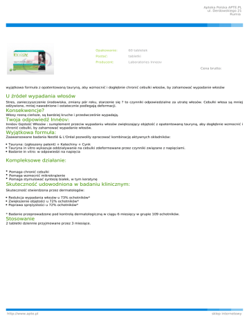 Apteka Polska APTE.PL ul. Derdowskiego 21 Rumia Opakowanie: 60 tabletek Postać: tabletki Producent: Laboratories Inneov Cena brutto: wyjątkowa formuła z opatentowaną tauryną, aby wzmocnić i dogłębnie chronić cebulki włosów, by zahamować wypadanie włosów U źródeł wypadania włosów Stres, zanieczyszczenie środowiska, zmiany pór roku, starzenie się ? to czynniki odpowiedzialne za utratę włosów. Cebulki włosa są mniej odżywione, mniej nawodnione i ostatecznie podlegają deformacji. Konsekwencje? Włosy rosną cieńsze, są bardziej kruche i przedwcześnie wypadają. Twoja odpowiedź Innéov: Innéov Gęstość Włosów : sumplement przeciw wypadaniu włosów zwiększający objętość z opatentowaną tauryną, aby dogłębnie wzmocnić i chronić cebulki, by zahamować wypadanie włosów. Wyjątkowa formuła: Zaawansowane badania Nestlé & L'Oréal pozwoliły opracować kombinację aktywnych składników: Tauryna: (zgłoszony patent) + Katechiny + Cynk Tauryna in vitro wykazuje oddziaływanie na cebulki zdeformowane przez czynniki związane z napięciami. Badanie in vitro: w odpowiedzi na napięcia Kompleksowe działanie: Pomaga chronić cebulki Pomaga wzmocnić mikrokrążenie Pomaga stymulować syntezę białek, w tym keratynę Skuteczność udowodniona w badaniu klinicznym: Skuteczność stwierdzona przez dermatologów: Redukcja wypadania włosów u 73% ochotników* Zwiększenie objętości u 72% ochotników* Poprawa sprężystości u 72% ochotników* * Badanie przeprowadzone pod kontrolą dermatologiczną w ciągu 6 miesięcy w grupie 109 ochotników. Stosowanie 2 tabletki dziennie przyjmowane przez 3 miesiące. http://www.apte.pl sklep internetowy