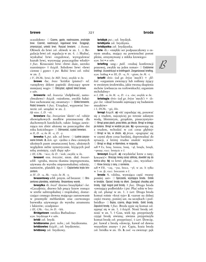 321 brewe oczodołem» c Czarne, gęste, nastroszone, zrośnięte brwi. Czernić, nastroszyć, regulować brwi. Ściągnąć, zmarszczyć, unieść brwi. Ruszać brwiami. g kosmet. Ołówek do brwi zob. ołówek w zn. 1. g Regulacja brwi zob. regulacja w zn. 4. g Skubać, wyskubać brwi «regulować, wyregulować kształt brwi, wyrywając poszczególne włoski» ◊ fraz. Krzaczaste brwi «brwi duże, szeroko rozrośnięte» ◊ książk. Sobolowe brwi «brwi ciemne i gęste» ◊ pot. Robić brwi zob. robić w zn. 2. ż V, DCMs. brwi; lm MD. brwi; zwykle w lm. brewe ‹łac. breve 6krótkie (pismo)’› rel. «urzędowy dekret papieski dotyczący spraw mniejszej wagi» c Odczytać, ogłosić tekst brewe. n ndm. brewerie ‹wł. braveria 6chełpliwość, samochwalstwo’› książk. «niesforne, zwykle hałaśliwe zachowanie się; awantury» c Dzikie brewerie. Robić brewerie. ◊ fraz. Urządzać, wyprawiać brewerie zob. urządzić w zn. 2. blp nieos. I, D. ~rii. brewiarz ‹łac. breviarium 6skrót’› rel. «zbiór obowiązkowych modlitw przeznaczony dla duchownych katolickich; także: księga zawierająca ten zbiór ułożony na poszczególne dni roku kościelnego» c Odmawiać, czytać brewiarz. m II, D. -a; lm M. -e, D. -y. pot. zdr. od brew: c Ładnie zarysoleśn. ogr. «jedno z dwu ciemnych ukośnych pasm zmarszczonej kory, ułożonych względem siebie symetrycznie, kryjących pod sobą zrośnięty, czyli ślepy sęk» brewka 1. wane brewki. 2. ż III, CMs. ~wce; lm D. ~wek; zwykle w lm. brezent ‹ros. brieziént, niem. dial. bresent› włók. «gruba, mocna tkanina impregnowana, używana do wyrobu nieprzemakalnej odzieży, namiotów, plandek itp.» c Ciężarówka kryta brezentem. m IV, D. -u, Ms. ~ncie; lm M. -y. brezentowy włók. przym. od brezent: c Bre- zentowa plandeka, wiatrówka. Brezentowy worek. brezylka ‹fr. bresil 6drzewo brazylijskie’› bot. «Caesalpinia, drzewo lub pnący krzew rosnące w strefie subtropikalnej i tropikalnej, dostarczające cennego drewna mającego zastosowanie w przemyśle meblarskim oraz czerwonego barwnika używanego do wyrobu atramentu i lakierów; cezalpinia» ż III, CMs. ~lce; lm D. ~lek. Bridgetown «stolica Barbadosu» wym. brydżtawn • n ndm. bridż zob. brydż. bridżorama sport. techn.; zob. brydżorama. bridżowiec książk.; zob. brydżowiec. bridżowy zob. brydżowy. broda bridżyk pot.; zob. brydżyk. bridżysta zob. brydżysta. bridżystka zob. brydżystka. brie ‹fr.› «miękki ser podpuszczkowy o ostrym smaku, mający na powierzchni porost pleśni, otrzymywany z mleka krowiego» wym. bri • m ndm. briefing ‹ang.› publ. «rodzaj konferencji prasowej, zwykle na jeden temat» c Codzienne briefingi. Uczestniczyć w briefingach. Zorganizować briefing. wym. brifing • m III, D. -u, N. ~giem; lm M. -i. briofil ‹brio- (od gr. brýon 6mech’) + -fil› biol. «organizm zwierzęcy lub roślinny żyjący w swoistym środowisku, jakie tworzą skupienia mchów (zwłaszcza na torfowiskach); organizm mcholubny» m I, DB. -a; lm M. -e, D. -i a. -ów; zwykle w lm. briologia ‹brio- (od gr. brýon 6mech’) + -logia› bot. «dział botaniki zajmujący się badaniem mszaków» ż I, DCMs. ~gii, blm. brnąć książk. a) «iść zapadając się, posuwać się z trudem, najczęściej po terenie zalanym wodą, błotnistym, grząskim, piaszczystym» c Brnąć przez piach, przez błoto, po błocie. Brnąć w śniegu po kolana. Brnąć w wodzie po pas. b) «posuwając się z trudem, wchodzić w coś coraz głębiej» przen. «pogrążać się w czymś złym coraz bardziej, doprowadzać do sytuacji, z której trudno znaleźć wyjście» c Brnąć w las, w zboże. c) c Brnąć w długi, w kłamstwa, w rozpustę. ndk • Va, brnę, brniesz, brnij, ~ął, brnęła, brnęli, ~ąwszy; rzecz. brnięcie n I. broczyć krwawić»: książk. a) «wydzielać krew z rany; Brocząc krwią coraz obficiej, dowlókł się do końca ulicy. b) «o krwi: płynąć, c Krew broczy z rany, z ramienia. ciec, wyciekać» ndk • VIb, ~czę, ~ysz, brocz, ~ył; w zn. b tylko w 3 os. lp; rzecz. broczenie n I. broda 1. «dolna, wystająca część twarzy poniżej ust» c Spiczasta, wystająca broda. Dołek w brodzie. Oprzeć brodę na dłoni. Zawiązać chustkę pod brodą. Ująć kogoś pod brodę. ◊ fraz. Druga broda «zwisający podbródek» ◊ pot. Pluć sobie w brodę zob. plunąć w zn. 1. ◊ żart. Druga broda komuś rośnie «ktoś tyje» 2. «zarost na dolnej części twarzy, poniżej ust, na szczękach i podbródku» c Bujna, czarna, długa broda. Golić brodę. Zapuścić brodę. ◊ fraz. Broda sypie się komuś zob. sypnąć się w zn. 1. ◊ książk. Nosić brodę zob. nosić w zn. 5. ◊ Czas, wiek itp. przyprószyły czyjąś brodę siwizną; siwizna przyprószyła komuś brodę zob. przyprószyć. ◊ żart. Dowcip, pot. kawał z brodą «dowcip, kawał od dawna wszystkim znany» ◊ pot. Capia, kozia broda zob. bródka w zn. 1b. 3. zool. «u zwierząt: pęk B 322 brodacz broker dłuższej sierści pod pyskiem; u ptaków: pęk piór na piersi lub na podgardlu» i owocach opatrzonych puchem, rosnąca w Europie i Azji; dmuchawiec» ż IV, CMs. ~dzie; lm D. bród. m III, D. -a, N. ~kiem; lm M. -i. brodacz 1. «mężczyzna mający bujny za- rost na dolnej części twarzy, mężczyzna brodaty» 2. zool. «zwierzę mające pęk dłuższej sierści pod pyskiem; także: ptak mający pęk piór na piersi lub na podgardlu» g Brodacz monachijski, brodacz olbrzym «duży, silny pies o szorstkiej sierści, czarnej lub szarawej w różnych odcieniach, tworzącej na głowie brodę i krzaczaste brwi; sznaucer olbrzym» m II, DB. -a; lm M. -e, D. -y; w zn. 1 lm B.=D.; w zn. 2 lm B.=M. brodaczka bot. «Usnea, krzaczkowaty porost o plechach różnej barwy, najczęściej zwisających, występujący głównie na drzewach, prawie na całej kuli ziemskiej» ż III, CMs. ~czce; lm D. ~czek. brodaty 1. «o mężczyźnie: mający brodę – zarost na dolne